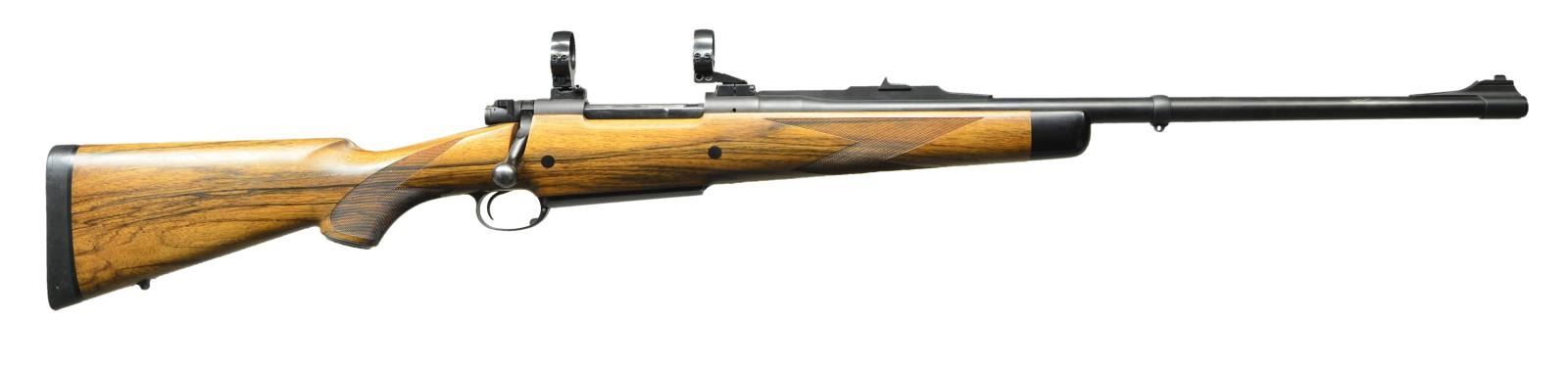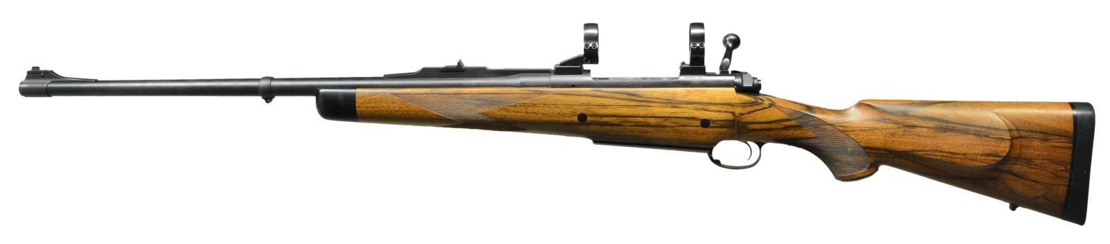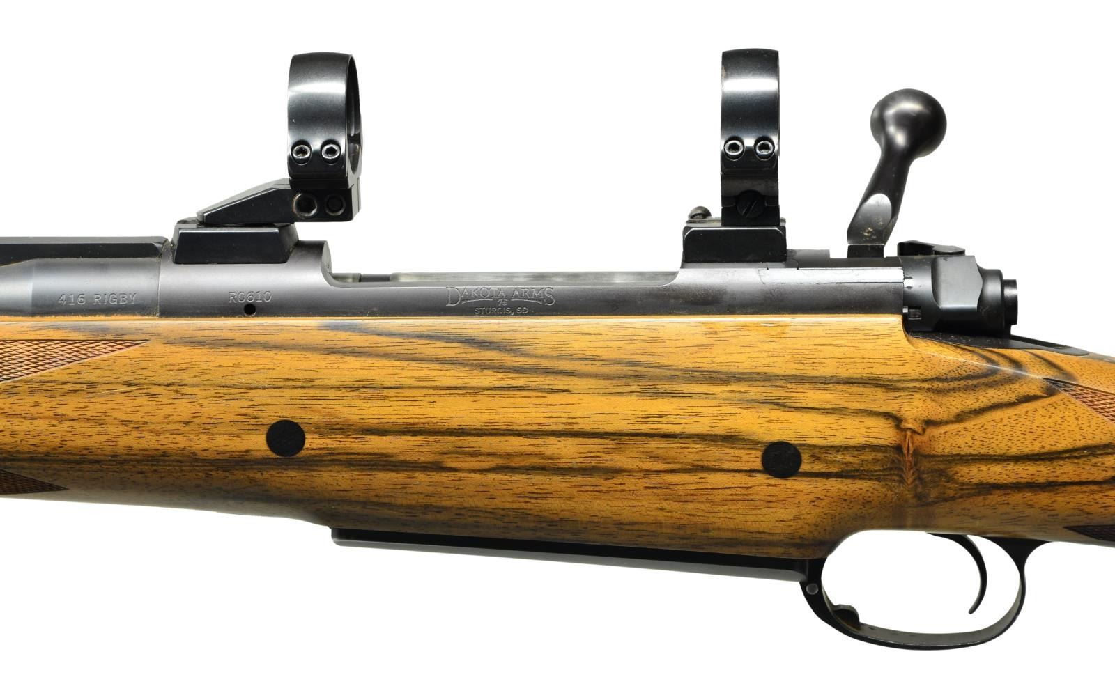 ACTION RIFLE. Cal. 416 Rigby S# R0610. These great rifles have become a world standard. This rifle has 24" medium weight barrel fitted with quarter rib holding one standing leaf express rear sight, sleeved on sling eye and front sight ramp holding gold bead with flip up white night bead. Caliber is marked on left rear. Model 76 magnum action has makers markings on left side, features model 70 type safety, drop box bottom metal and hinged floor plate with release button in trigger guard bow. Capped pistol grip stock of very nicely veined European walnut measures 13 3/4" over black "Dakota" pad. Stock features small swept shadow line right hand cheekpiece, ebony forend tip, steel grip cap, two recoil bolts and well cut point pattern checkering. Action is fitted with ERA type QD scope bases and rings. CONDITION: fine, showing limited field use. Metal has some scratches and shows some light rusting with subsequent cleaning. Bolt knob somewhat silvered as are some high edges. Stock has a fair number of light marks in its original finish with two fairly deep digs at front of forend checkering. Bore is bright and shiny. Mechanically fine. (23-421/MGM). MODERN. $4,500-6,500.