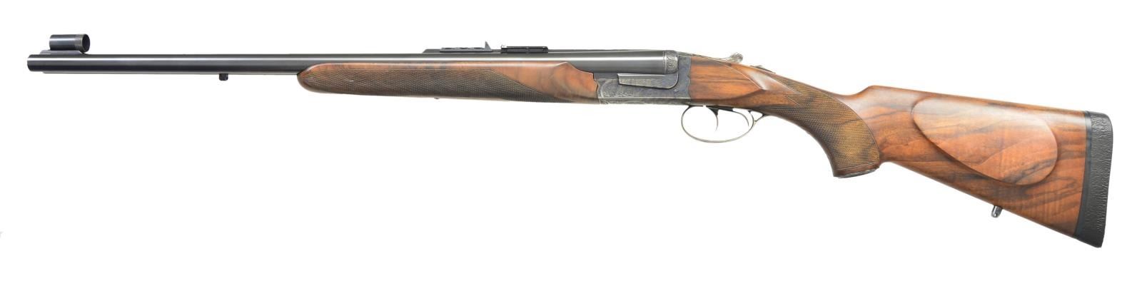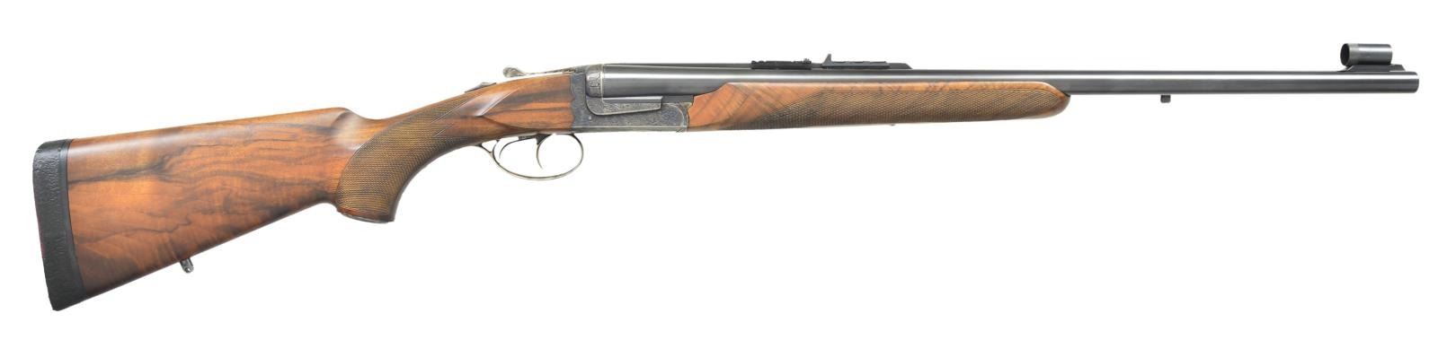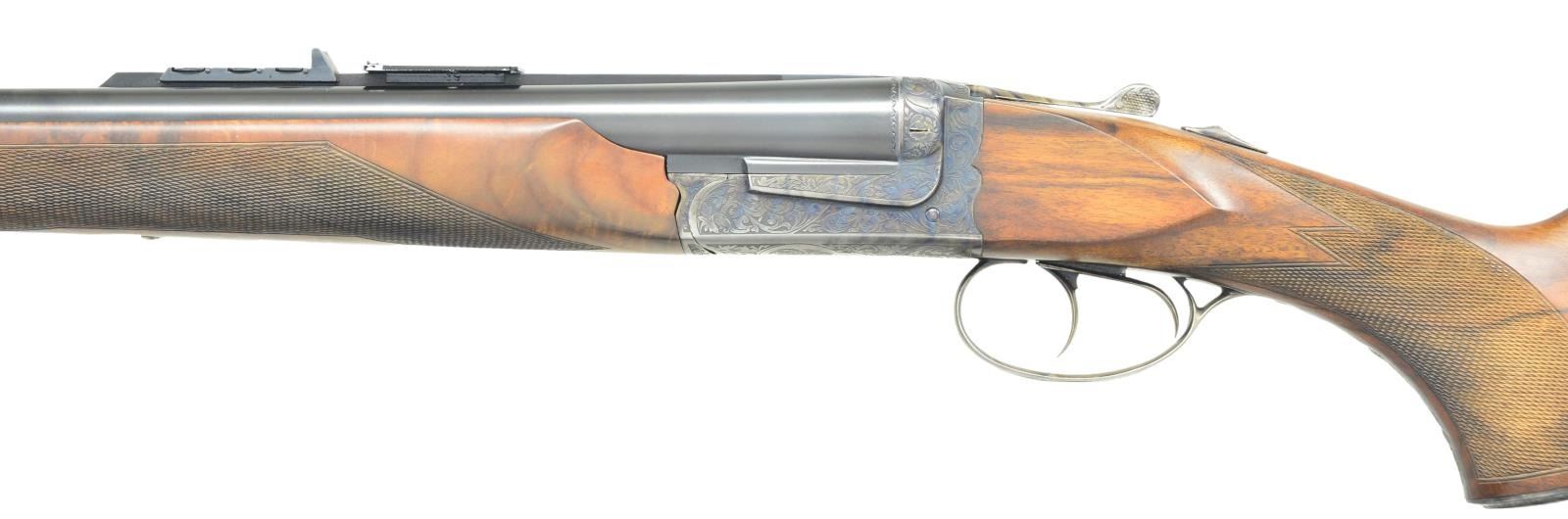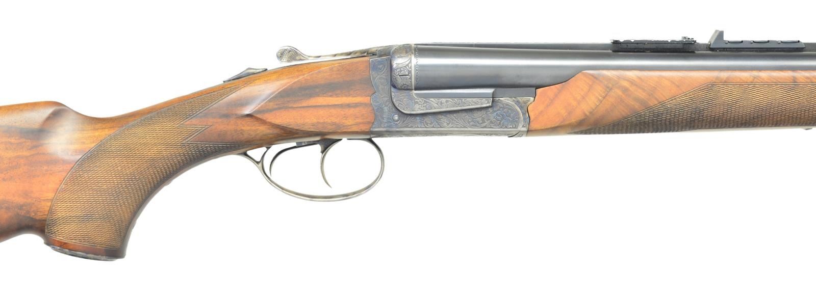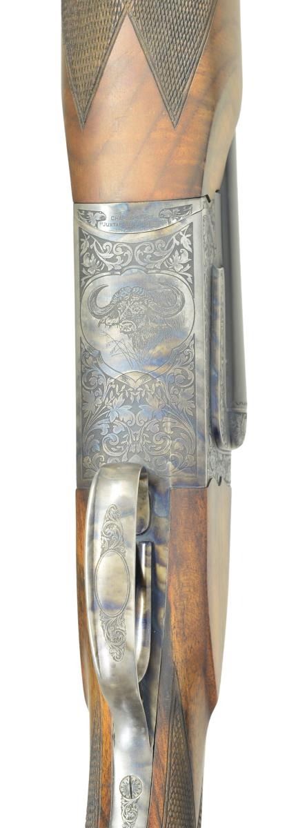 Cal. 470 Nitro Express & 12 Ga 3’’. S# 50473. Chapuis Armes of St. Bonnet le Chateau, France, is a maker of big bore double rifles and shotguns. Scalloped boxlock action. Double triggers. Ejectors. Case colored laser engraved action with a cape buffalo on the floorplate. Each set of bbls. has its individual beavertail forearm. Steel capped pistol grip cheek piece stock with long tang trigger guard. Stock set of satin finished fine Turkish walnut with hand checkering. Toeline of stock and both bbls. have swivel eyes. LOP: 14-1/2’’ over an aftermarket Limbsaver pad. Stock is equipped with a Mercury recoil reducer. BARREL NO 1: 470 Nitro Express. 23-1/2’’ with hooded ramp red fiber optic sight and quarter rib mounted express rear sight having one standing and three folded leafs. Rib behind sight has an added screw attached base for a Trijicon reflex sight. BARRELS NO 2: 12 Ga. 26’’ with concave rib and long red fiber optic sight. Bbl. is fitted with Beretta/Benelli style interchangeable chokes, 4 standard and 2 extended tubes are included. WEIGHT with rifle bbls: 11 lbs, 2.4 ozs. UNATTACHED ACCESSORIES: makers molded case. Case contains 470 NE snap caps, Trijicon sight & box, spare chokes, test target and case instructions. CONDITION: receiver retains 90% case colored finish showing carry wear. Both bbls. retain over 97% blue and have very bright bores. Satin wood finish shows very small marks. (23-724/DS). MODERN. $10,000-15,000.