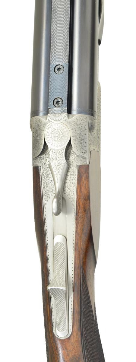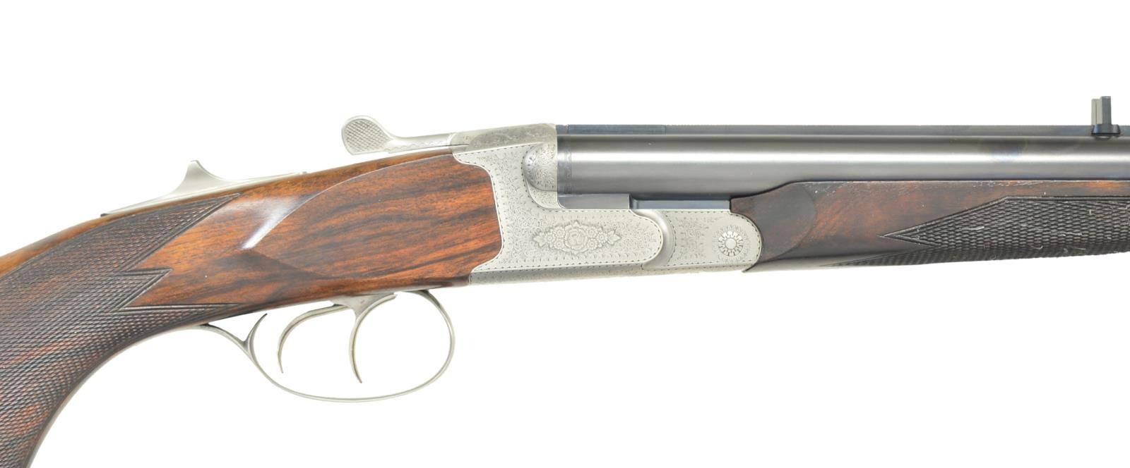 Cal. 500/416 NE. S# 020371. Bbls. 23-1/2’’ ramp mounted bead front sight & quarter rib mounted standing V notch rear sight. Satin finished boxlock top lever action w/ top tang cocking lever. Full coverage traditional English rose & scroll engraving. Double triggers, front trigger is articulated. Extractors. Schnable tipped forearm & pistol grip stock of satin finished Turkish walnut w/ hand checkering. LOP: 14-5/8’’ over a thin black Old English pad. Toeline of stock & bbl. have swivel eyes. WEIGHT: 10 lbs, 7 ozs. Introduced in 1995. CONDITION: near excellent retaining over 98% metal finish. Wood has very good original finish showing scattered marks. Bright near excellent bores. (23-739/DS). MODERN. $7,000-11,000.