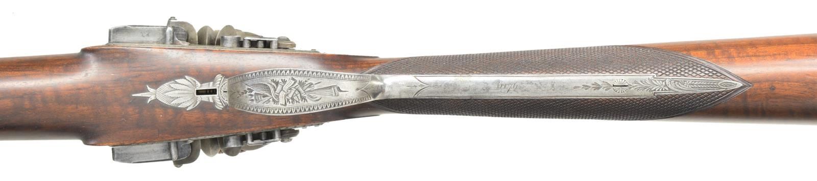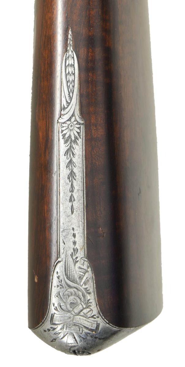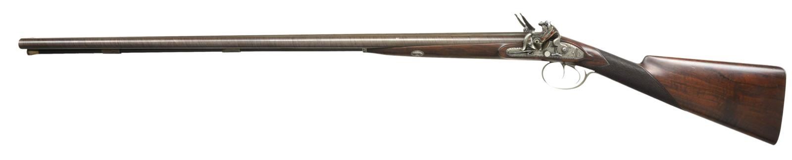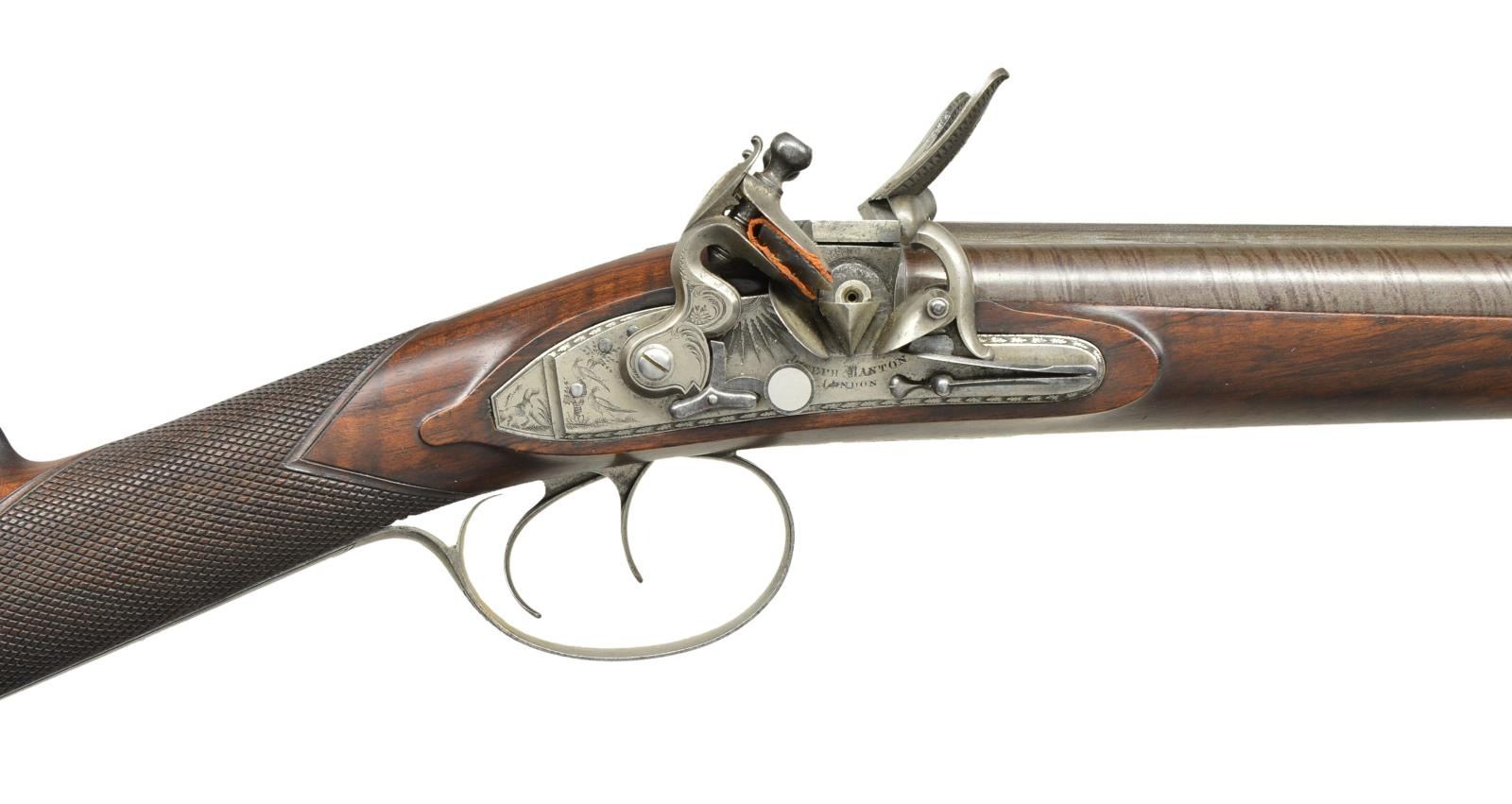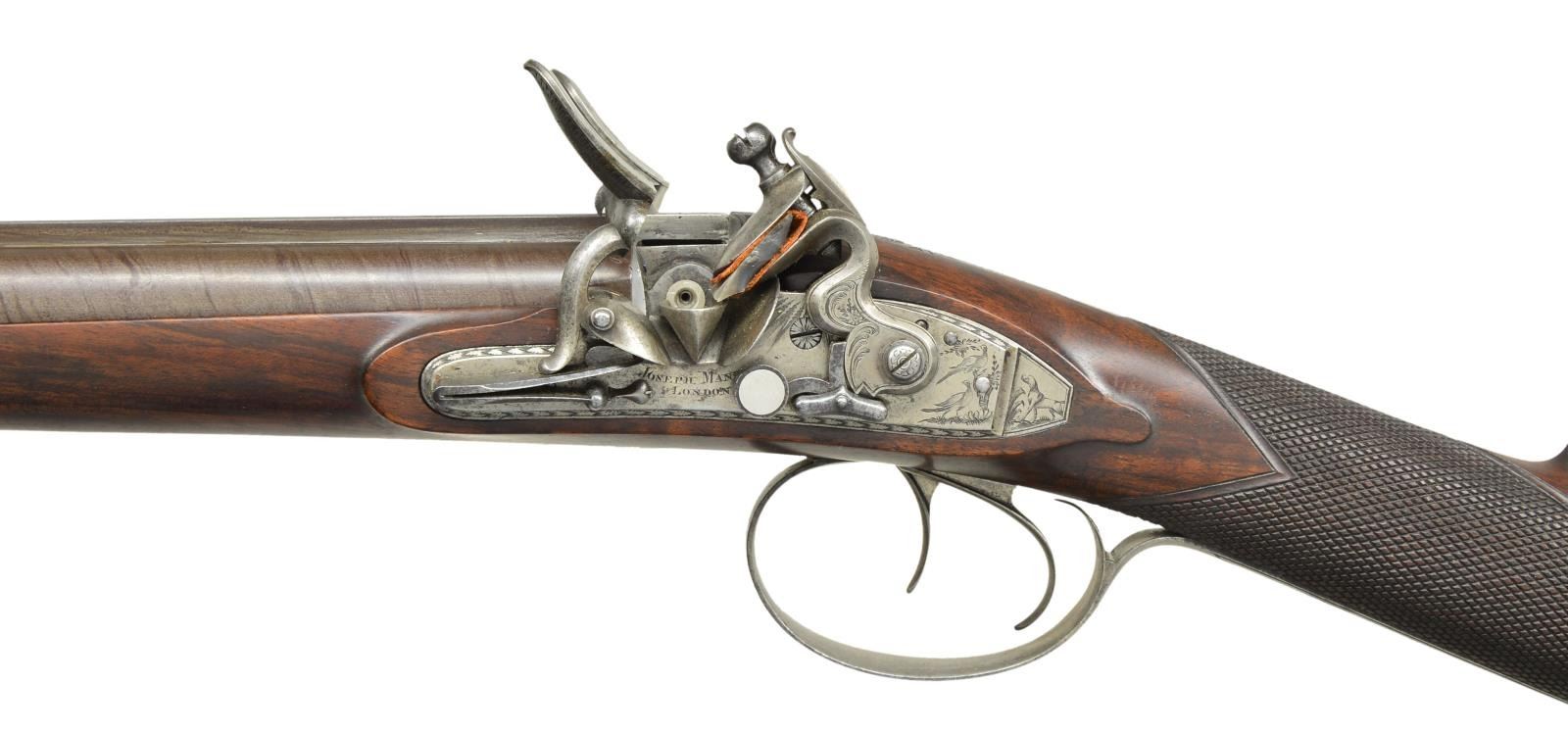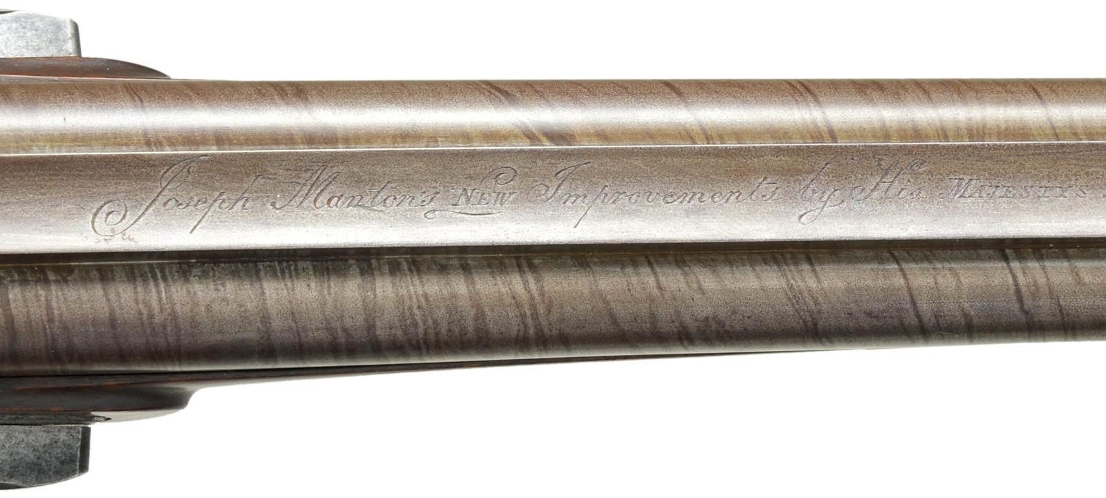 GUN WITH "NEW IMPROVEMENTS" EX. KEITH NEAL COLLECTION. Cal. 20 bore. S# 6176 (1813). The beginning of the 19th century saw gunmakers doing their best to improve the flintlock. Joseph Manton, as the top London gunmaker became obsessed with making the locks waterproof. His other improvements were to make sighting easier and guns safer. This gun shows most of these features. The 32" stub twist barrels are fitted with his "elevating" rib which is engraved "Joseph Manton's NEW Improvements by His Majesty's Patent". Bottoms of barrels are stamped with S# and "CL" (Charles Lancaster noted barrel forger). Inset patent breeches are a fine example of Manton's attempts to make guns waterproof and have large rectangular openings either side of rib extension for any water running down outside barrel to pass through. Water would be channeled to the bottom of gun and exit through a rectangular hole behind trigger plate pineapple. Platinum lined touchholes are on circular bosses which were covered by extensions on frizzens to channel water out and away from pan. Breeches are also stamped with S#'s and "CL". Breech iron is near fully engraved with attractive sweeping scrolls and floral highlights. Locks with feather engraved chamfered plates are fitted with waterproof pans of latest style. Bridled roller frizzens with aforementioned waterproofing improvements are engraved "Joseph Manton" and "PATENT" around use numbers 6301 and 6302. Rollers are on frizzens and engage high lumps on tops of feather springs. Late style Manton cocks have notches which engage platinum weighted Manton patent gravitating stops. These were intended to be a safety feature. When the gun was put in vertical position, as when being loaded, these "safeties" would pivot automatically into position to keep cocks in place with no danger of accidental discharge. Hunters who shot high pheasants and overhead waterfowl were not overly happy with this mechanism. Locks and cocks are engraved with feather bursts, some scroll and game scenes, which consists of well executed bird dog on tails and two pheasant toward rear of cocks. "Joseph Manton" "LONDON" is under pans. Stock of lightly figured and marbled European walnut measures 13 3/4" over steel buttplate with long top tang engraved with flags and shields. Trigger plate has late style pineapple finial, trigger guard with feather engraved borders has flags, etc. on bow. S# is on tang. Flat top point pattern checkering is at grip and stock attaches to barrels with captive side bolt through silver oval escutcheons. Rosewood ramrod with brass tip and tail (worm under cap) mounts through two plain pipes and pineapple thimble matching trigger plate. MEASUREMENTS: STOCK: DAH: 2 1/4". DAC: 1 7/16". CAST: neutral. LOP: 13 3/4". WEIGHT: 6 lb. 7 oz. UNATTACHED ACCESSORIES: copy of Christie's auction info. CONDITION: good as lightly refinished. Barrels retaining nearly all of a rebrown, engraving remains clear. All iron and steel parts cleaned to silver gray over some light pitting. Stock with light oil refinish has some subsequent marks and scratches, checkering recut. Bores are shiny with light pitting, mechanically fine. PROVENANCE: Ex. Keith Neal Collection, tag on trigger guard bow with number G242. Described on pg. 253 "THE MANTONS Gunmakers". Sold Christie's Oct. 24, 2001 Lot 90. (01-21977/MGM). ANTIQUE. $7,500-15,000.