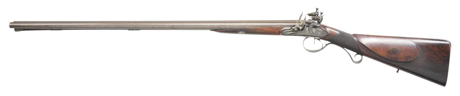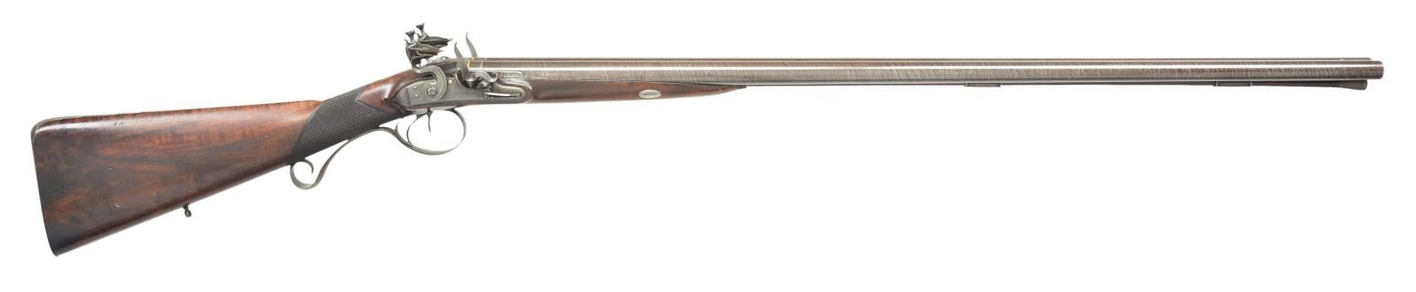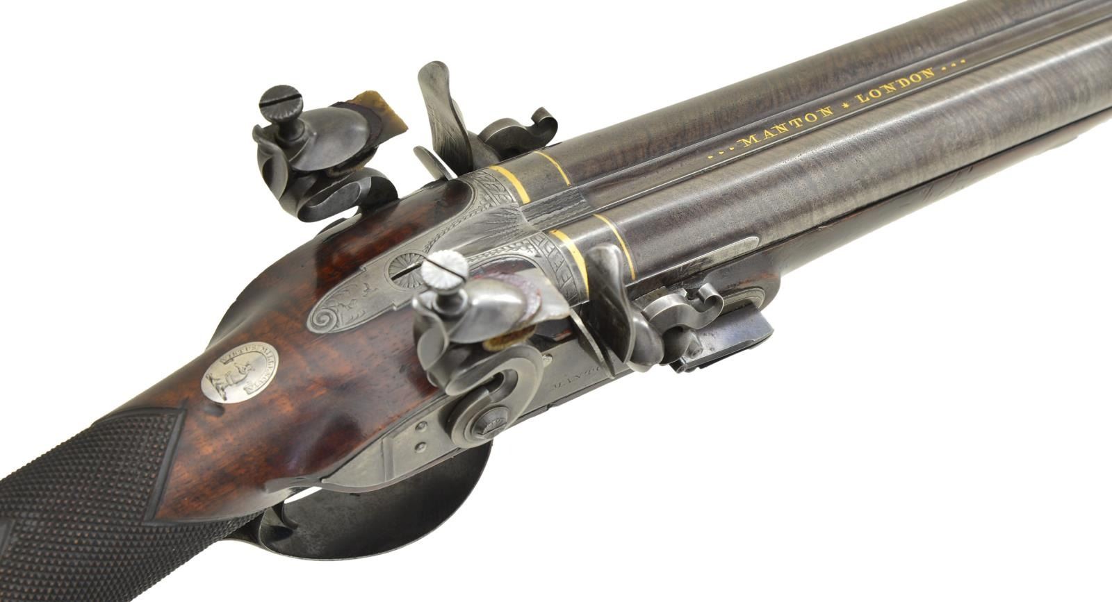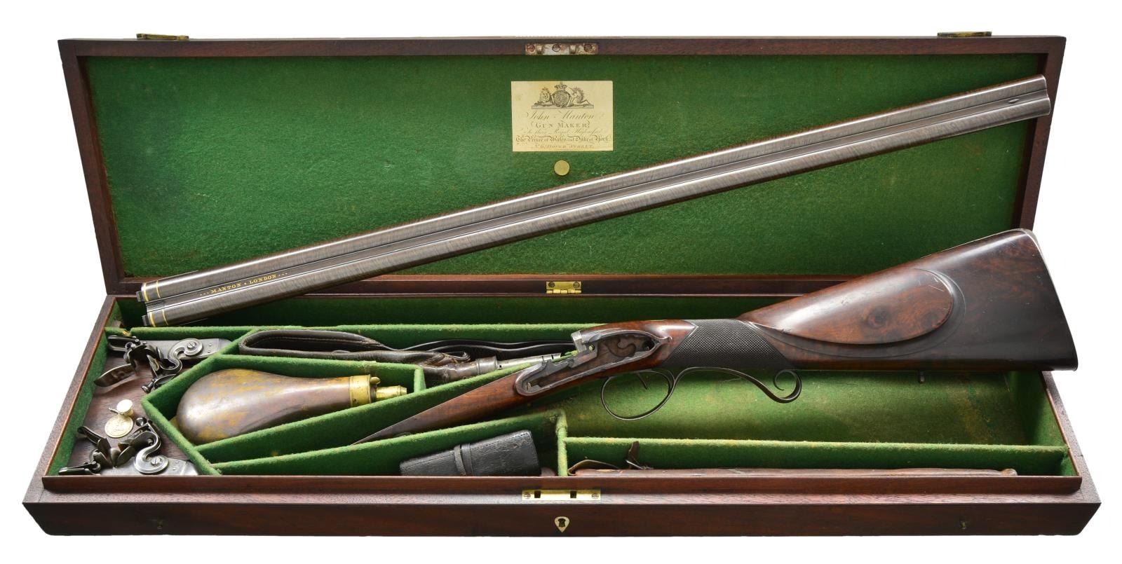 Cal. 17 bore. S# 3331 (1800). The 32" skelp twist barrels are gold inlaid ---MANTON*LONDON--- on full length swamped rib. Bottoms of barrels are stamped with London proofs and S# which is also on patent breech plugs that are not inset. Plugs are inlaid with gold lines on tops and have gold touch holes. Locks with beveled plates having rebated pointed tails are fitted with serpentine cocks, waterproof pans, bridled frizzens and feather springs with large rollers and bulbous finials. Locks have double line border engraving on chamfers and "MANTON" is under pans. Borders of cocks are filed in usual late 18th century "Best" style with ovolo moulded edges. Top spurs turn backward. Trigger plate has early style wide pineapple finial. Trigger guard, engraved with dog on bow, has curl at rear forming grip which is engraved with S#. Well streaked and lightly figured European walnut stock measures 14 3/8" over steel buttplate with long top tang engraved with a pair of hanging birds. Stock features swept shadow line right hand cheekpiece, square grip checkering and a silver oval at top of grip engraved with a greyhounds head under the motto "VIRTUS MILLE SCUTA"(possibly the Clifford family). Stock attaches to barrels with captive sidebolt through oval silver escutcheons. A greenheart ramrod with steel tip and steel worm tail mounts through two beaded pipes and pineapple thimble. MEASUREMENTS: STOCK: DAH: 2". DAC: 1 5/16". CAST: neutral. LOP: 14 3/8". WEIGHT: 7 lb. 6 oz. UNATTACHED ACCESSORIES: gun is housed in an original John Manton mahogany case with pendular hook and key fastener (key escutcheon is inverted teardrop shaped bone). Top is fitted with circular "D" ring handle, central medallion is unengraved. Case is lined in green cloth and a small John Manton label in lid is of the type used between 1801-15. Bottom compartment has lift our lock tray with bone knob affixed with an original W. Keith Neal Collection tag number "C193". Case contains some early accessories including Sykes marked leather shot snake, three piece brass and rosewood cleaning rod in leather case, steel powder and shot container, walnut handled combination turn screw, early type dimpled wad punch marked "20" and a leather wallet for flints (containing five unused "Best" Brandon flints), unmarked copper bodied powder flask in a compartment with removable bottom. Another flint wallet is in this compartment contains four used flints. Space under lock platform contains lock pin. CONDITION: fine as partially refinished. Barrels retaining over 90% very well done re-brown over some light pitting. Locks have traces of original case hardening color. Trigger guard and lockplate also have traces of original blue but all are mostly gray-brown. Most bright blue remains on feather springs. Stock retains over 80% original oil finish with a large number of light marks and scratches. Bores are bright and shiny retaining most of their straight scratch "rifling". Exterior of case is fine with many scratches. Interior cloth is very good to fine with compressions and fading. Barrel partition has some later cuts. Accessories are generally good to fine. This gun is listed in "THE MANTONS GUNMAKERS" but a case is not described. A very lovely early John Manton. 01-21995/MGM). ANTIQUE. $8,000-15,000.