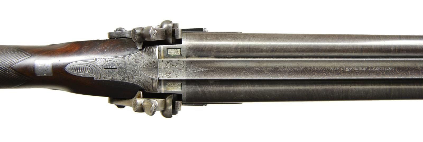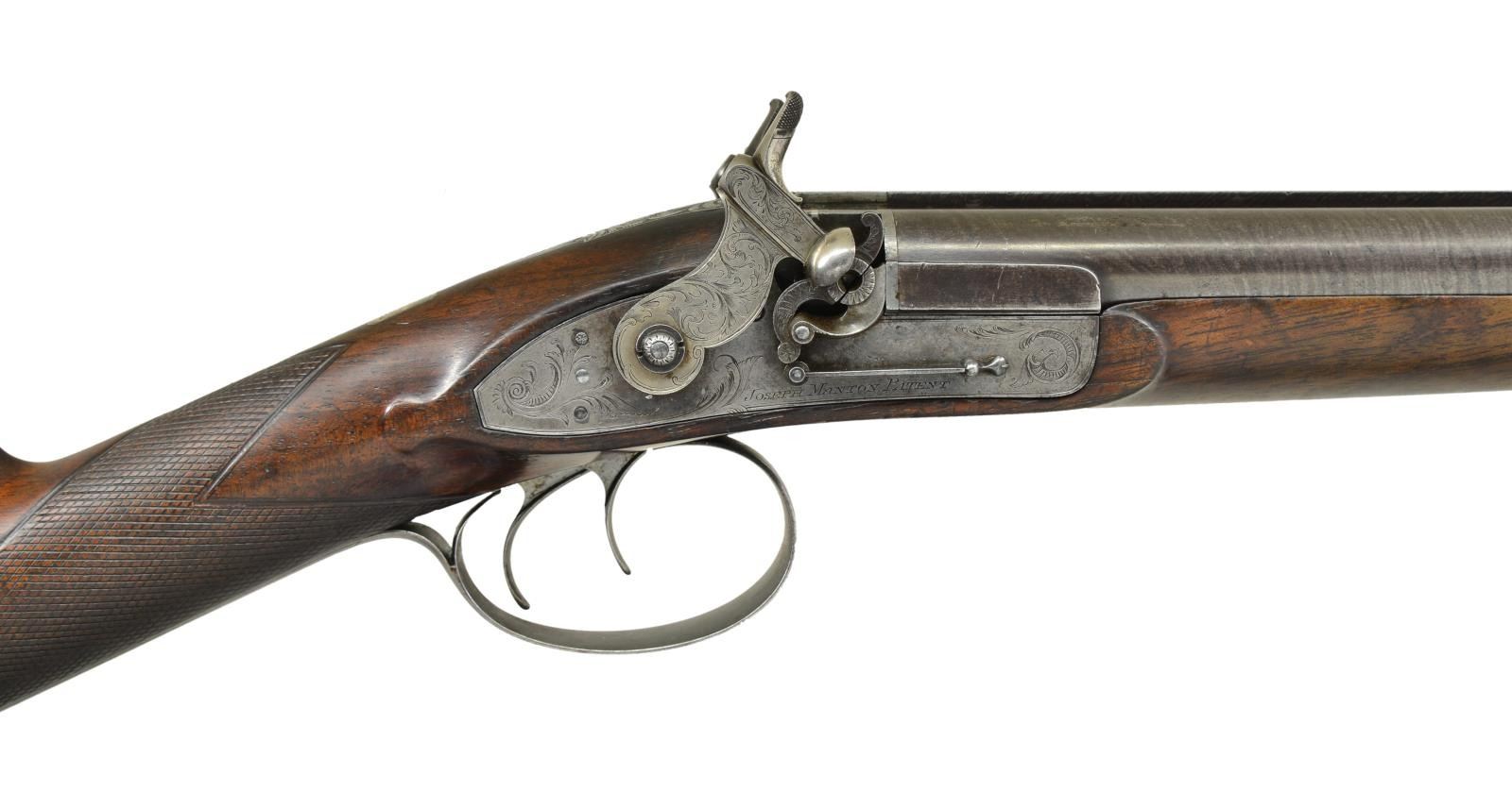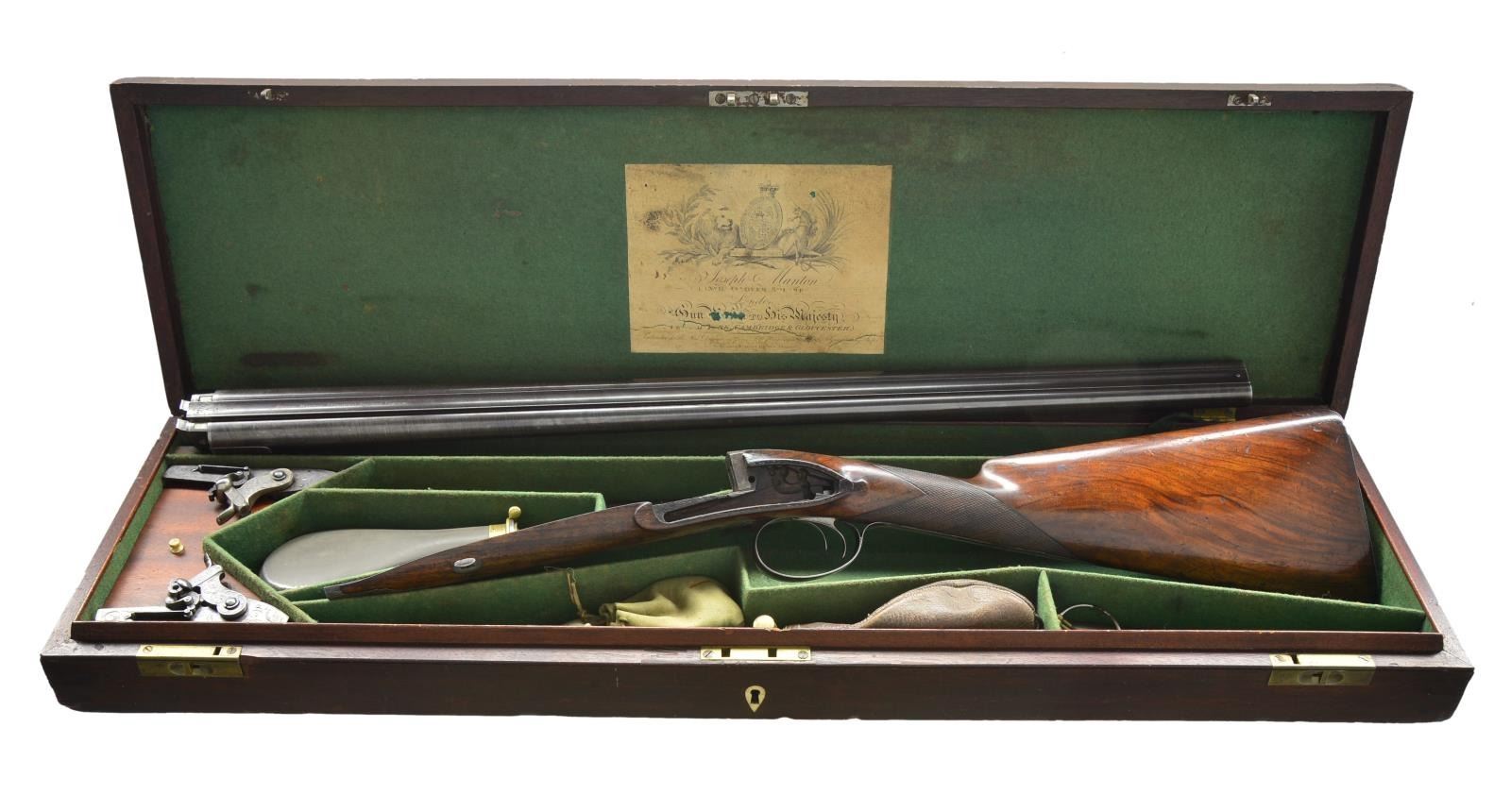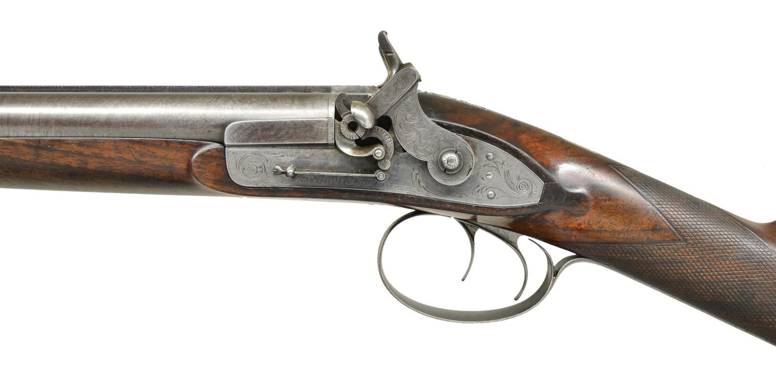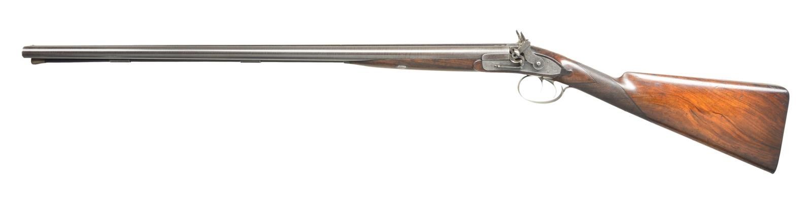 Cal. 16 bore. S# 8884 (1821). Among early percussion systems the tubelock obtained a good following as ignition was generally fast and sure. This gun has 29 5/8" skelp twist barrels engraved "Joseph Manton, Hanover Square. London." on slightly raised rib. Bottoms of barrels are stamped with S#'s London proofs and "WF" (noted barrel maker William Fullerd). Patent breeches with deeply inset platinum touch holes have platinum poincon on tops stamped "JOSEPH" "MANTON." "PATENT." under a crown. Breech iron is engraved with open shaded scroll. Locks with flat plates having square tails are fitted with broad faced hammers with heavily shielded noses to partially enclose tube mechanism. Pivoting tops are controlled by straight feather springs with rollers. Locks and hammers are engraved with open flowing scroll. "Joseph Manton Patent" is under feather springs and fronts of plates are engraved with coiled sea monsters with eagle heads. Trigger plate has usual pineapple finial. Trigger guard with arms on bow has S# on tang. Stock of lightly veined European walnut measures 14 5/8" over steel butt plate with long tang engraved with arms. Flat top point pattern checkering is at grip. Stock attaches to barrels with captive sidebolt through oval silver escutcheons. A greenheart ramrod with brass tip and tail (worm under tail) mounts through two plain pipes and pineapple decorated thimble. A rectangular silver crest plate at top of grip is engraved with a horses head rampant. MEASUREMENTS: STOCK: DAH: 2 5/8". DAC: 1 3/4". CAST: neutral. LOP: 14 5/8" WEIGHT: 7 lb. 6 oz. UNATTACHED ACCESSORIES: gun is housed in its original mahogany case with sliding lock fastener and key lock having teardrop shaped bone escutcheon. Top of case is fitted with circular "D" ring handle, central medallion is engraved with horses head matching crest found on gun. Case is lined in green cloth and Joseph Manton label in lid is of the type used between 1820-1825. Bottom compartment is fitted with platform for locks and contains a fine array of accessories that appear to be original; including tin and brass powder measure with angeled spout marked "PATENT", a shot flask with pullout spout, correct for period two piece greenheart and brass cleaning rod with flattened handle, two shot and powder containers by Sykes, steel ring with holders for tubes, wad punch marked "16" and the original key. CONDITION: fine as somewhat refurbished. Barrels retaining over 85% old re-brown most likely done when barrels were shortened for some reason as they are 2" short of fitting their original case. Breech iron and locks retain about 30% of their case hardening color. Trigger guard and buttplate retain about 30% of their original blue. Stock retains most of its original finish with considerable wear at grip and forend. Bores are bright, lightly frosted. Locks are fine. Case shows a large number of bumps and scratches of what appears to be its original finish. A two foot crack is along front edge. Interior cloth is good to very good with many rubs and marks, label is considerably foxed and with some rubs through. Accessories are generally very good to fine. (01-22000/MGM). ANTIQUE. $6,000-12,000.