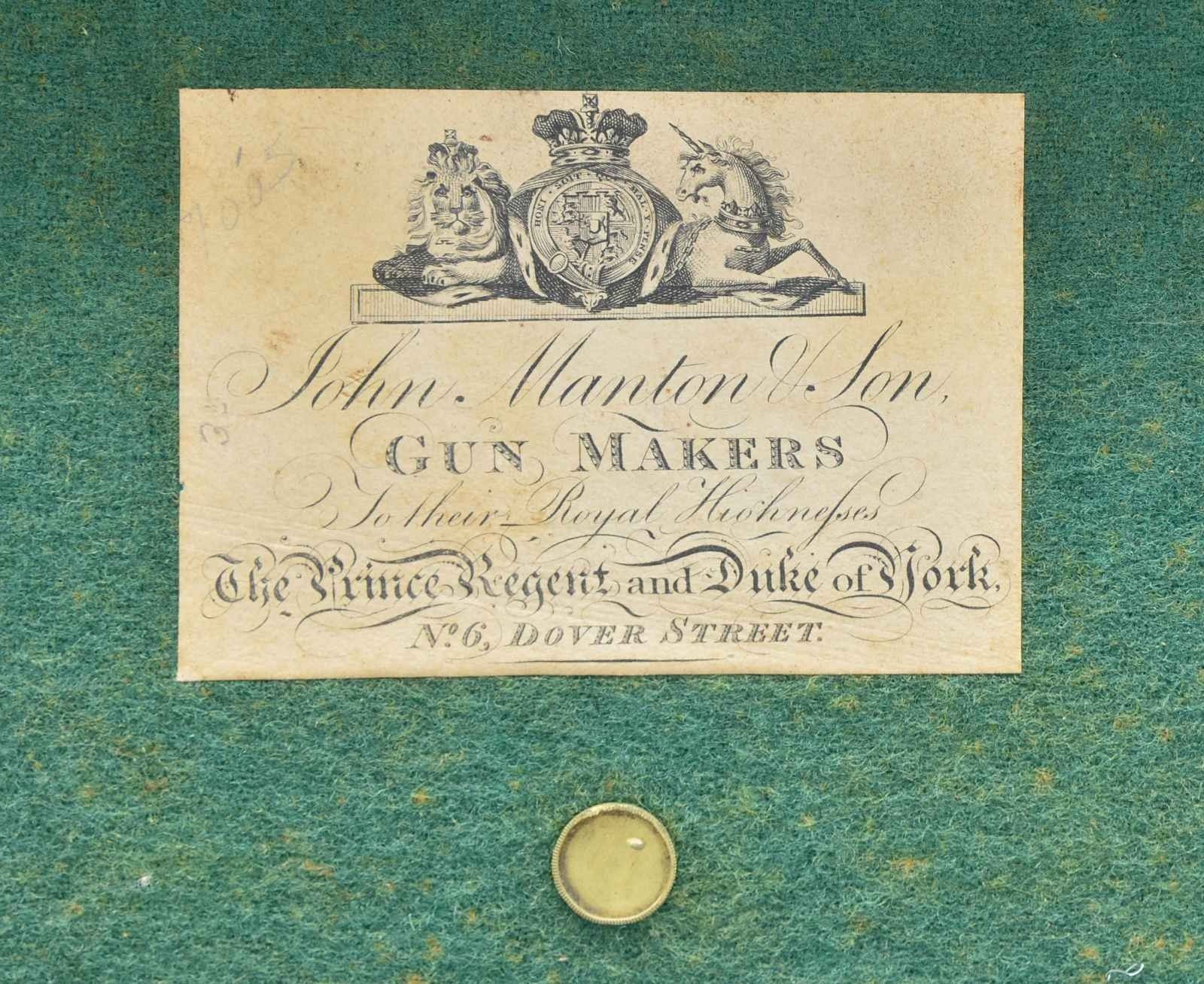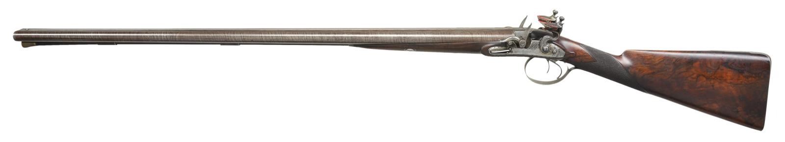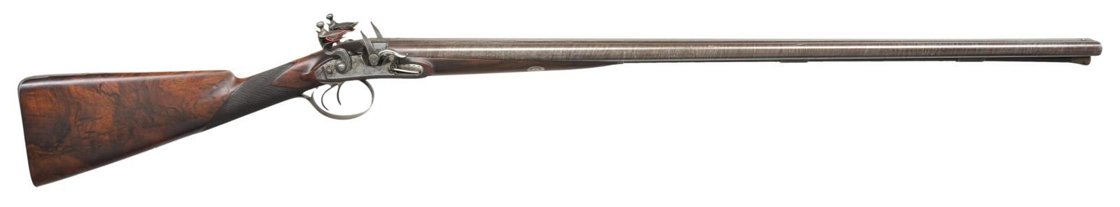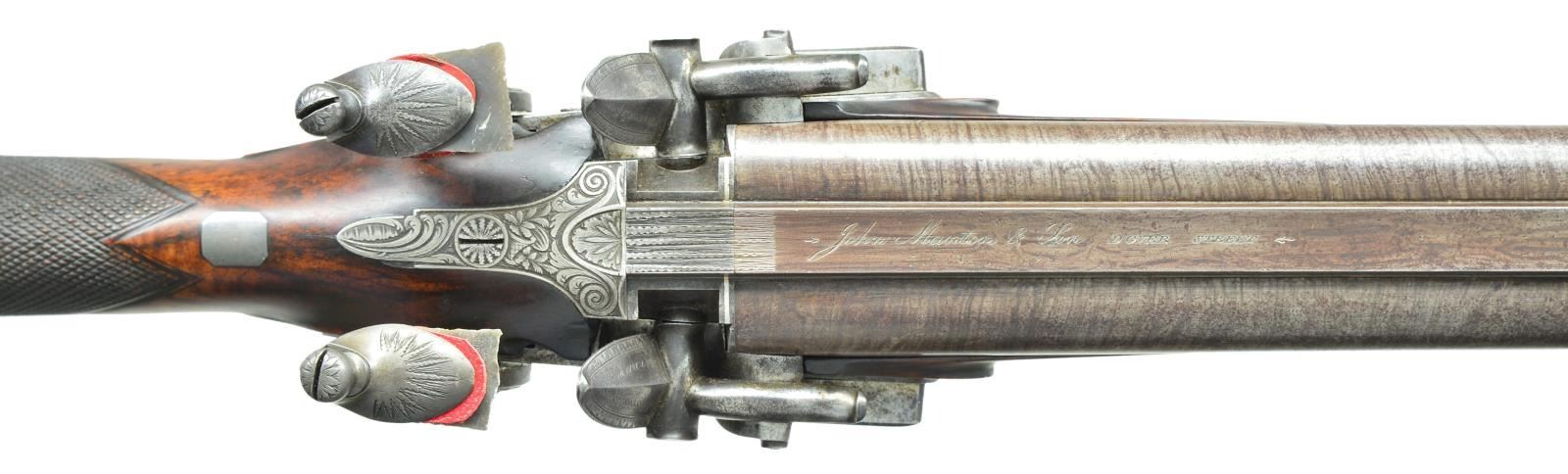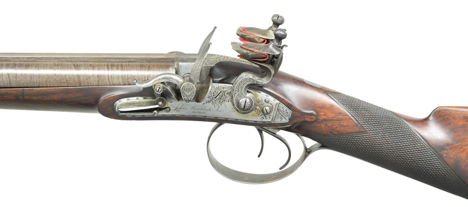 Cal. 20 bore. S# 7005 (1819). The 32" skelp twist barrels are engraved "John Manton & Son DOVER STREET" on slightly raised rib. Bottoms of barrels are stamped with S# and London proofs. Deeply inset patent breeches have some inlaid platinum lines and platinum touch holes. Rib extension is feather engraved. Breech iron is engraved with semi relief acanthus scrolls and floral highlights. Locks with chamfered plates having rebated tails are fitted with serpentine cocks, Manton patent "V" waterproof pans, lipped bridled frizzens, engraved "Jno Manton & Son" "Patent" and feather springs with large rollers and bulbous finials. Locks are engraved with feather borders, sprays of scroll and arrows in quivers. Maker's name over "Patent" is at centers. Trigger plate has usual pineapple finial, trigger guard with armorial designs on bow, has S# on tang. Stock of attractively marbled stump figured European walnut measures 14" over steel buttplate with long top tang engraved with arms. Point pattern checkering is at grip and a vacant silver rectangle is at top of grip. Stock attaches to barrels with captive sidebolt through oval silver escutcheons. Rosewood ramrod with brass tip and tail (worm under tail) mounts through two plain pipes and pineapple decorated thimble. MEASUREMENTS: STOCK: DAH: 1 5/8". DAC: 1 3/8". CAST: neutral. LOP: 14". WEIGHT: 6 lb. 11 oz. UNATTACHED ACCESSORIES: gun is housed in an old Manton case with pendulum hook and key closure (key escutcheon is teardrop shaped and made of bone in usual Manton fashion). Top has circular "D" ring handle. Case is lined in green cloth and there is a small J. Manton label in lid of the type in use between 1815-1820. Case has platform for mounting of locks and contains an acanthus embossed copper bodied powder flask by Dixon, BGI powder measure, three piece brass and walnut cleaning rod and four etched Sykes type steel powder and shot containers marked "Patent". Design on exterior shows hunter in various poses on one side with birds, acanthus, etc. on other. Case also contains a key which does operate lock. CONDITION: very good as lightly refinished. Barrels retaining over 80% re brown with good definition to pattern, engraving softened. Locks and other iron parts show cleaning to bright toning back to silver and gray brown. Stock retains most of an old oil refinish over some deep marks and some subsequent marks. Bores are bright and shiny, locks and frizzens are fine. Case exterior retains most original finish, interior cloth is fine with some discoloration, rubs and soiling. Accessories are good, powder and shot containers very fine. This gun would most likely make a very fine shooter. (01-21928/MGM). ANTIQUE. $5,000-10,000.
