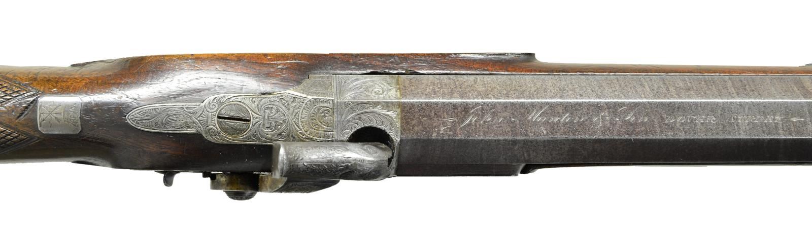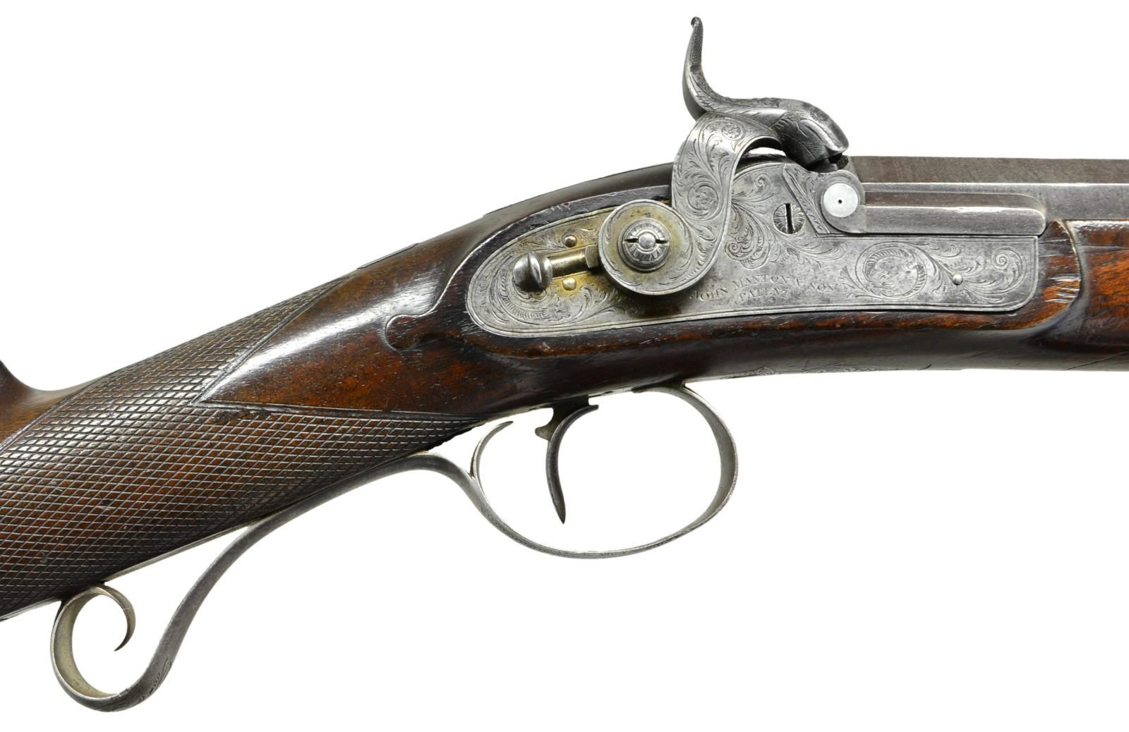 Cal. 61. S# 9894 (1830). The 32" octagon twist steel barrel with underrib is engraved "John Manton & Son DOVER STREET" on top flat behind single standing "U" notch rear sight. Front bead is platinum. Bottom of barrel is stamped with S#, British proofs and "23". Patent breech with S# on hook and vented platinum blow out is engraved with acanthus and scroll. Breech iron without fence is also engraved with acanthus scroll. Lock of usual Manton type for the period, which attaches to patent breech with screw from left is fitted with early style flat bodied hammer with stylized dolphin head. Lock is fitted with back sliding safety that engages hammer at half cock. A fly is fitted into tumbler. Lock is engraved with 70% coverage open scrolling acanthus with coiled sea monster highlights. "JOHN MANTON & SON" "PATENT" is at center. Trigger plate with set trigger has acanthus engraved pineapple finial, trigger guard with acanthus scroll on bow has S# at top of scrolled tang forming grip. Lightly figured dense European walnut stock measures 14 1/8" over steel buttplate with acanthus engraved long top tang. Stock features flattened toeline, swept right hand shadow line cheekpiece and flat checkering at grip. Top of grip is set with silver rectangle engraved with the crown of an Earl over three fanned arrows tied at center. Forend tip is horn and stock attaches to barrel with captive sidebolt through oval silver escutcheons. An ebony ramrod with horn tip and brass tail mounts through two plain pipes and beaded steel thimble. CONDITION: very good. Barrel retaining a considerable amount of its original brown with good definition to pattern under lightly pitted surface. There are traces of original color on breech plug and lock plate. Engraving remains clear. Other metal parts show cleaning to dark gray. Stock shows a considerabe number of marks and dings in the remainder of its original finish. Bore is fine to very fine, shiny with some light scattered pitting. Lock is fine, safety is operable. Set trigger works. Rifle is not listed in "THE MANTONS: GUNMAKERS". It appears that John Manton made very few rifles either double or single. This rifle would be an ideal companion for any primitive weapon hunting season. (01-23001/MGM). ANTIQUE. $5,000-9,000.