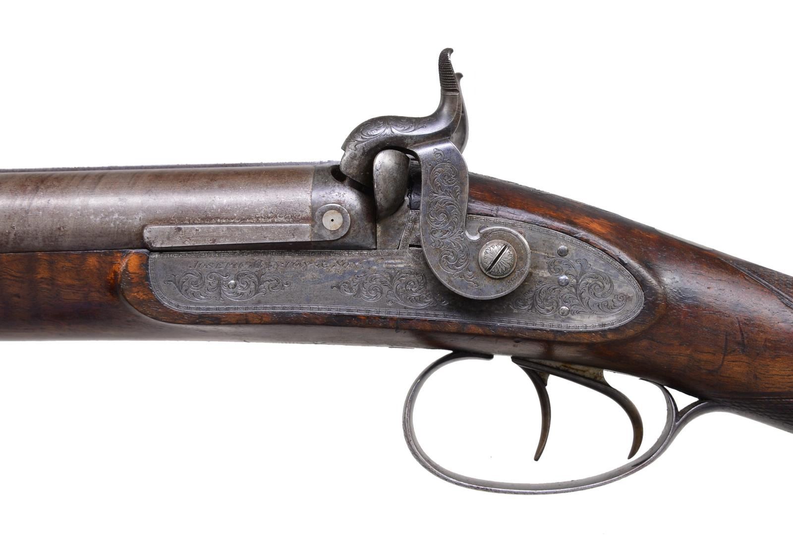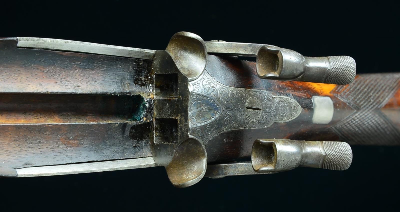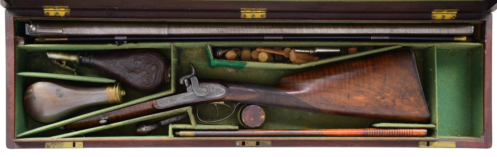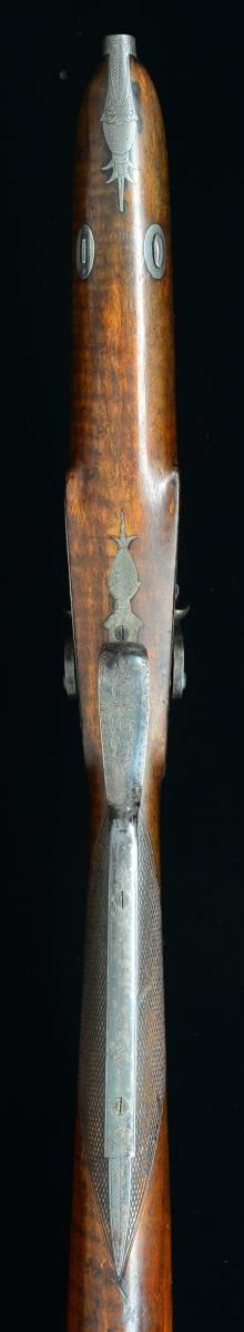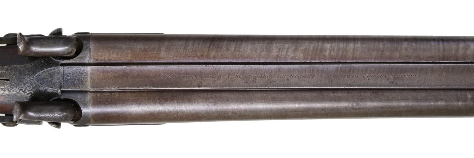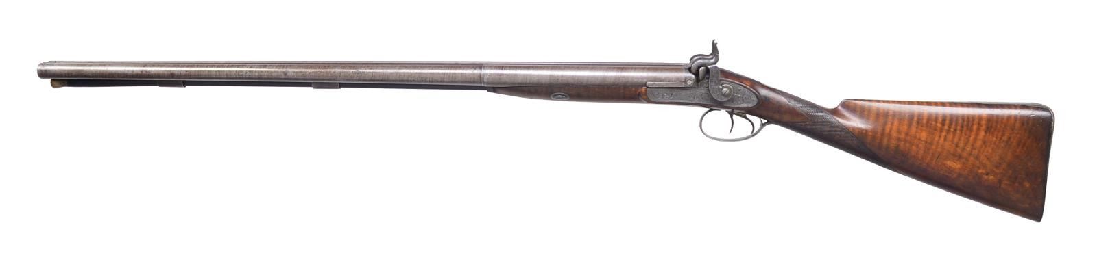 Cal. 16 Ga. S# 10514. Bbl. 30". The famed Joseph Manton, despite his genius for fine gunmaking, was always in debt. After his release from debtor's prison in 1831, he & his son started gunmaking again at 6 Holles St. in London & business continued there after Joseph's death (in 1835) for another few years. It appears this gun was made around 1837 & incorporates many features found in Joseph Manton's later guns. The 30" laminated steel bbls. have a heavy reinforced breech section which ends about 21 1/2" from muzzles. Top rib is engraved "Joseph Manton & Son" & with Holles St. address. Bottoms of barrels. are stamped with London black powder proofs for 16 bore, S#s & bbl. makers initals "TE" (Thomas Evans). An ebony ramrod with brass head & tail (worm under tail) is held by two plain pipes. Patent breeches with scroll engraving on rib extension have vented platinum plugs. Case hardened breech iron is nicely engraved with shaded scroll. Locks with rounded tails are fitted with flatfaced serpentine hammers. Locks & hammers are engraved with very well cut open scroll. "Joseph Manton & Son" is on each lockplate. Trigger plate has stylized pineapple finial with pineapple engraving matching thimble. Trigger guard with open scroll on bow has S# on tang. Stock is of nicely fiddle figured light colored European walnut & measures 14 3/8" over steel buttplate with long scroll engraved top tang. Flat top point pattern checkering with mullered borders is at grip & a vacant truncated rectangular silver crest plate is at top of grip. Stock attaches to bbls. with captive sidebolt through oval silver escutcheons. MEASUREMENTS: BBLS: Bore diameter: R 674. L 672. Min. Wall Thickness: R .040. L .042. STOCK: LOP: 14 3/8". DAC: 1 7/16". DAH: 1 9/16". Cast: neutral. WEIGHT: 7 lbs. 11 oz. UNATTACHED ACCESSORIES: gun is housed in what is possibly its original figured mahogany case with central brass medallion on lid & dual sliding bolt closure. Case is lined in green cloth, original label has been removed & replaced by bookplate of Reverend E. C. Alston, possibly "The Fishing Vicar" who died in 1977, but most likely another Reverend E. C. Alston who died in 1871. Case contains a wad punch, leather shot flask, copper bodied powder flask by James Dixon & some cleaning equipment. CONDITION: very good to fine, original "as found". Bbls. retaining most of their original brown with good definition to pattern with some scattered marks & a few stains. Locks & breech iron retain most of their original case hardening color quite strong, where protected. Trigger guard retains 30-40% original blue with many areas of flaking & browning. Buttplate has about the same amount of blue, also browned & flaked. Stock retains most of its original varnish finish, grain somewhat raised & open with numerous marks & scratches, checkering lightly worn. Bores are fine, shiny with some scattered pitting. Locks are very fine. Case retains what appears to be a very old refinish, possibly original with subsequent marks & scratches. There are some small repairs to rear section of lid at left. Interior cloth is fair to good, considerably faded with many rubs & marks. Label lightly foxed with compressions. Partitions are good with some repairs, accessories are fair to good, flask fine but missing thumb lever & nozzle. A "best" quality, most likely shootable specimen by London's most famous early 19th century gun maker whose tomb is partially inscribed "The greatest artist in firearms ever the world produced". (01-18138/MGM). ANTIQUE. $3,000-6,000.