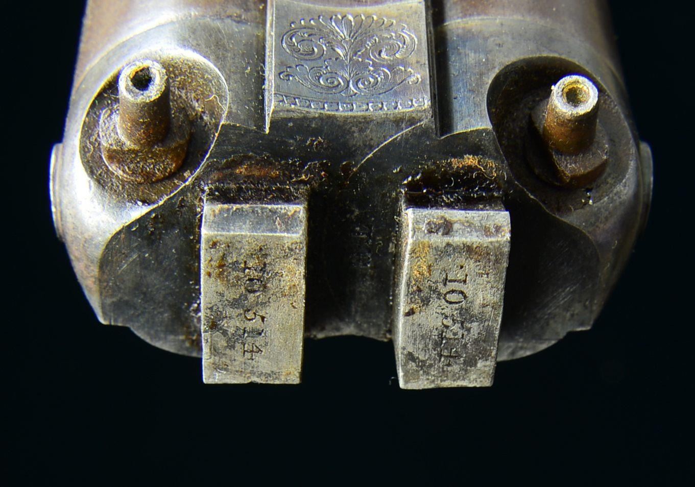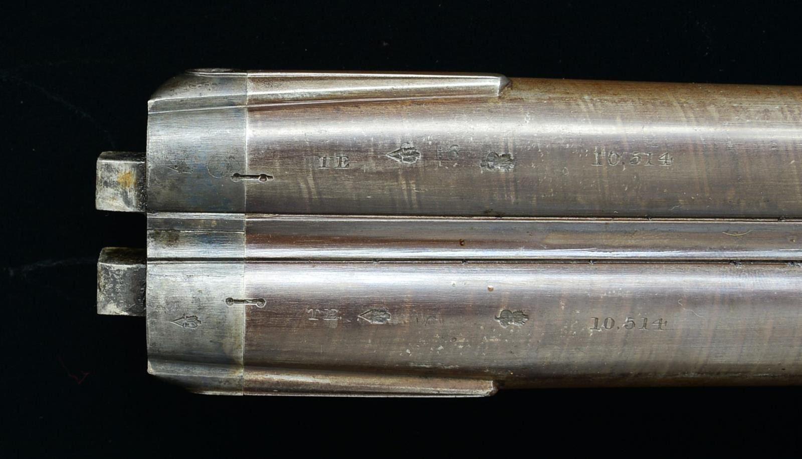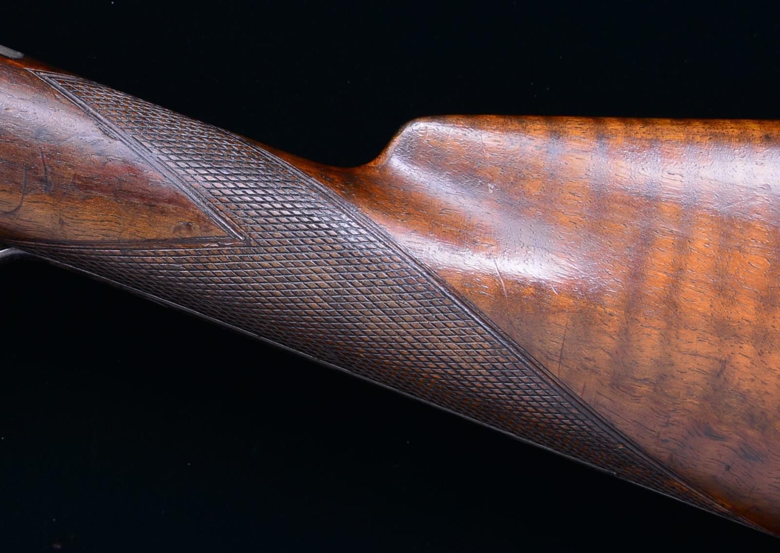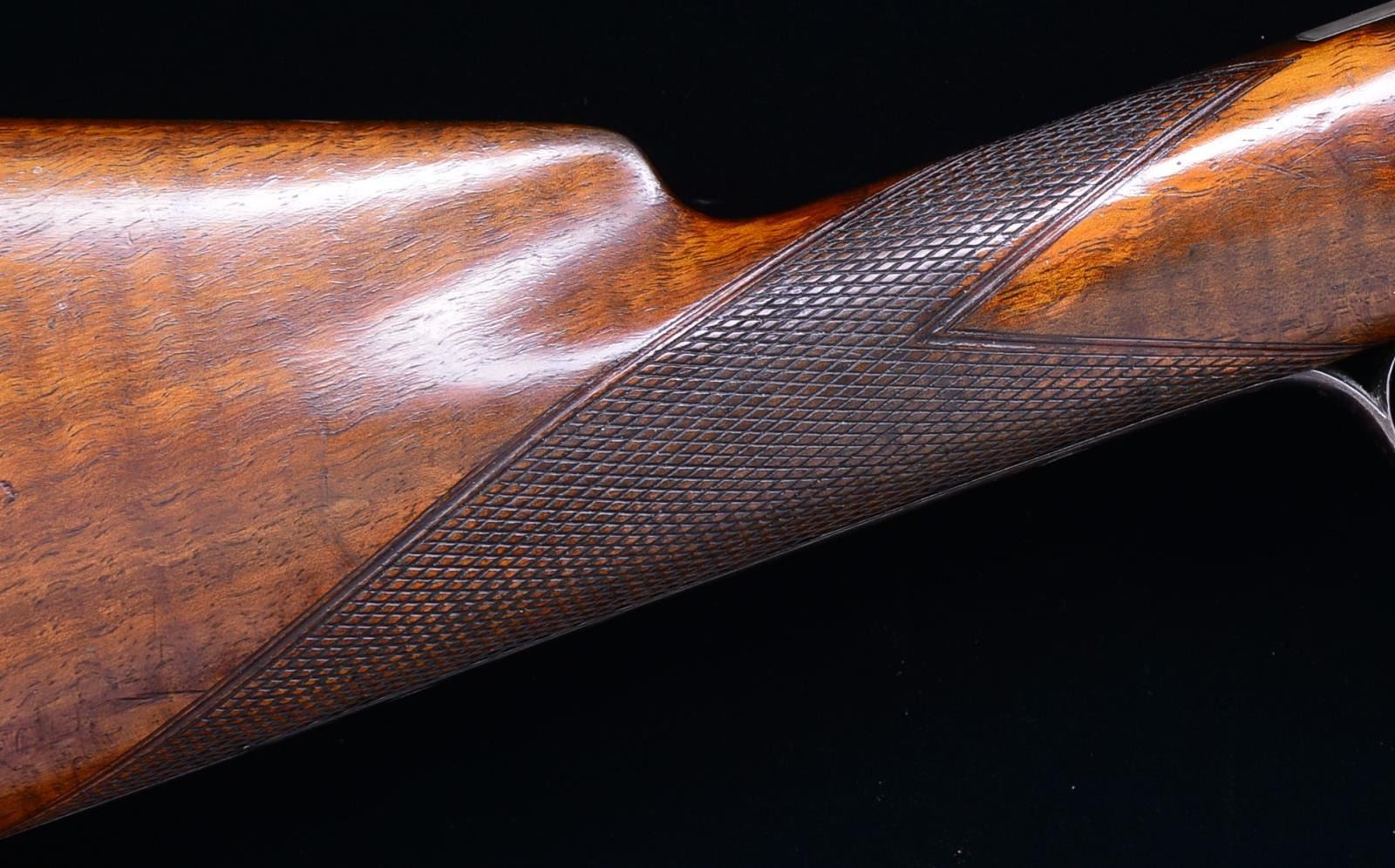 Cal. 16 Ga. S# 10514. Bbl. 30". The famed Joseph Manton, despite his genius for fine gunmaking, was always in debt. After his release from debtor's prison in 1831, he & his son started gunmaking again at 6 Holles St. in London & business continued there after Joseph's death (in 1835) for another few years. It appears this gun was made around 1837 & incorporates many features found in Joseph Manton's later guns. The 30" laminated steel bbls. have a heavy reinforced breech section which ends about 21 1/2" from muzzles. Top rib is engraved "Joseph Manton & Son" & with Holles St. address. Bottoms of barrels. are stamped with London black powder proofs for 16 bore, S#s & bbl. makers initals "TE" (Thomas Evans). An ebony ramrod with brass head & tail (worm under tail) is held by two plain pipes. Patent breeches with scroll engraving on rib extension have vented platinum plugs. Case hardened breech iron is nicely engraved with shaded scroll. Locks with rounded tails are fitted with flatfaced serpentine hammers. Locks & hammers are engraved with very well cut open scroll. "Joseph Manton & Son" is on each lockplate. Trigger plate has stylized pineapple finial with pineapple engraving matching thimble. Trigger guard with open scroll on bow has S# on tang. Stock is of nicely fiddle figured light colored European walnut & measures 14 3/8" over steel buttplate with long scroll engraved top tang. Flat top point pattern checkering with mullered borders is at grip & a vacant truncated rectangular silver crest plate is at top of grip. Stock attaches to bbls. with captive sidebolt through oval silver escutcheons. MEASUREMENTS: BBLS: Bore diameter: R 674. L 672. Min. Wall Thickness: R .040. L .042. STOCK: LOP: 14 3/8". DAC: 1 7/16". DAH: 1 9/16". Cast: neutral. WEIGHT: 7 lbs. 11 oz. UNATTACHED ACCESSORIES: gun is housed in what is possibly its original figured mahogany case with central brass medallion on lid & dual sliding bolt closure. Case is lined in green cloth, original label has been removed & replaced by bookplate of Reverend E. C. Alston, possibly "The Fishing Vicar" who died in 1977, but most likely another Reverend E. C. Alston who died in 1871. Case contains a wad punch, leather shot flask, copper bodied powder flask by James Dixon & some cleaning equipment. CONDITION: very good to fine, original "as found". Bbls. retaining most of their original brown with good definition to pattern with some scattered marks & a few stains. Locks & breech iron retain most of their original case hardening color quite strong, where protected. Trigger guard retains 30-40% original blue with many areas of flaking & browning. Buttplate has about the same amount of blue, also browned & flaked. Stock retains most of its original varnish finish, grain somewhat raised & open with numerous marks & scratches, checkering lightly worn. Bores are fine, shiny with some scattered pitting. Locks are very fine. Case retains what appears to be a very old refinish, possibly original with subsequent marks & scratches. There are some small repairs to rear section of lid at left. Interior cloth is fair to good, considerably faded with many rubs & marks. Label lightly foxed with compressions. Partitions are good with some repairs, accessories are fair to good, flask fine but missing thumb lever & nozzle. A "best" quality, most likely shootable specimen by London's most famous early 19th century gun maker whose tomb is partially inscribed "The greatest artist in firearms ever the world produced". (01-18138/MGM). ANTIQUE. $3,000-6,000.