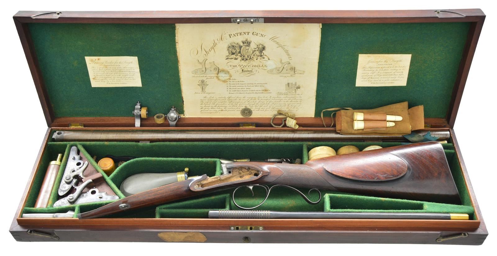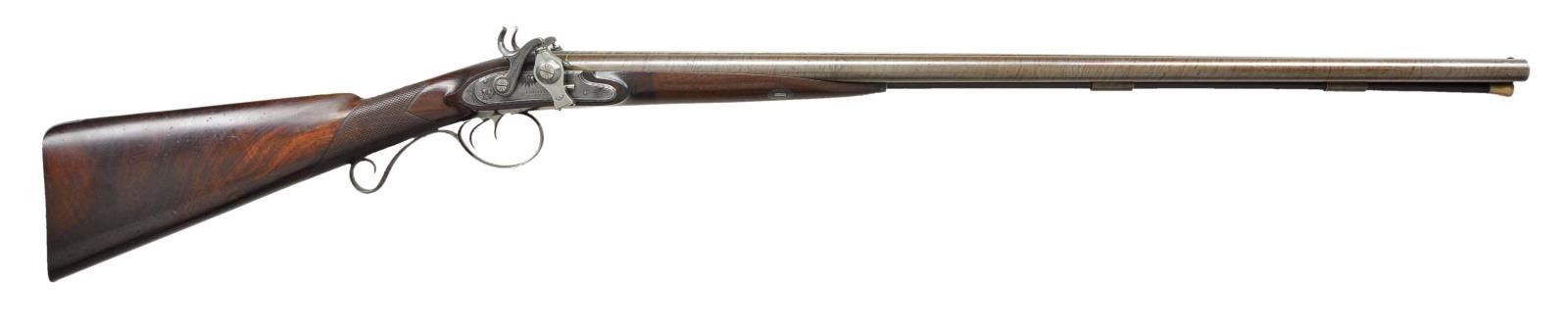 Cal. 14 Bore. S# 266/267. The Forsyth patent marked the beginning of the modern percussion system utilizing a fulminating powder or mixture to ignite a main powder charge. The Rev. Alexander Forsyth patented this system in 1807 and the scent bottle or roller type is the earliest form. This gun is fitted with an early form of the roller type with mechanisms that mount through the lockplates and must be taken out of the barrels before the barrels can be removed from the stock. A very time consuming and delicate task. The 30" skelp twist barrels are engraved "FORSYTH-PATENT-GUN-COMPANY-LONDON". This is the earliest known Forsyth company and only found on guns made between 1808-9. Bottoms of barrels are stamped with London gunmakers proofs and patent use numbers "266 & 267". Patent breeches with feather engraving on rib extension have gold lines and front and back. In place of touch holes sides are tapped to accept scent bottle percussion mechanisms. Each bottle is marked with patent use number and has deep stamp on front with an "F" over "PATENT" on a ribbon. Rear of each bottle is stamped "JP" (James Purdey worked for Forsyth as a lock filer until starting on his own in 1814). Breech iron is fully engraved with shaded scroll. Locks with chamfered plates and rebated rounded tails are fitted with typical second style Forsyth hammers and are engraved with feather borders and bursts along with some floral and bird engraving. Center of each lock is engraved "FORSYTH" "PATENT". After about 1810 locks were generally engraved "FORSYTH & CO." Locks have patent use numbers on tops of plates. Gun is iron mounted; trigger plate having pineapple finial, trigger guard has curl on tail forming grip and buttplate has long top tang. Mounts have traditional engraving with dog scenes on trigger guard bow and at top of buttplate. Stock of lightly figured European walnut features right hand shadow line cheekpiece and square checkering at grip. Stock mounts to barrels with captive sidebolt through oval silver escutcheons. Greenheart ramrod has brass head and tail (worm under tail) and is held by two plain pipes and pineapple thimble. A rectangular crest plate with cut corners at top of grip is engraved with a crown surmounted by a crowned lion passant surrounded by the motto of the Order of the Garter. A note in case indicates that this gun was owned by the Duke of Cambridge. At the time this gun was made that was the title of Prince Adolphus, the seventh son of George III. UNATTACHED ACCESSORIES: gun is housed in its original mahogany case with dual hook closure and key lock. Top is fitted with circular "D" ring handle, central medallion engraved with the crest of the Duke of Cambridge. Interior is lined in green cloth and a spectacular 10" x 8 1/2" Forsyth paper label emblazed with the royal crest is in lid. It is of the second type with name changed to "FORSYTH & CO." and later style hammers on locks, however the lockplates do not have company name or "PATENT". Label also illustrates and explains the Forsyth patent. Two other labels explain the priming powder and instructions for greasing the mechanism. Case contains a wide array of old accessories which include an original rosewood handled turn screw for removing firing pins and springs, leather wallet containing turned bone containers for priming powder, brass and copper flask as found with other Forsyth cased guns for storage of priming powder, boxwood container with priming pins and springs with screw top; other slip top containers hold more pins and springs. One has original string of springs with tag inscribed "put small end of spring toward shoulder of piston". Other accessories include a correct style and vintage tin and brass powder flask, two bladed slip together turn screw with walnut handles and early dusting brush. Case also contains a later two piece brass and ebony cleaning rod and wad punch. Locks set on a mahogany platform which acts as a cover for a compartment that holds lock pin, broken key (which does fit the case), an auction tag dated 19 Dec 1979 and a hand written note inscribed "Forsyth Double Gun" "Duke of Cambridge" "Nov 20th 1949", as well as an original W. Keith Neal Collection tag number "C148". CONDITION: very fine. Barrels retaining over 80% original brown finish, breeches and locks retain most of their muted case hardening color. Trigger guard retains about 60% original blue, buttplate perhaps 20%. Stock retains most of its original finish, showing light wear at grip and with a good scattering of light marks. Bores are bright with some very light scattered pitting, locks and priming mechanisms fine. Case exterior retains most of its original finish with some fairly deep scratches and marks, key escutcheon is missing. Interior cloth is very fine with some marks and rubs, labels are also very fine, lightly stained and foxed. Accessories are generally very good to fine.