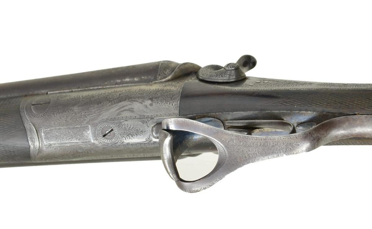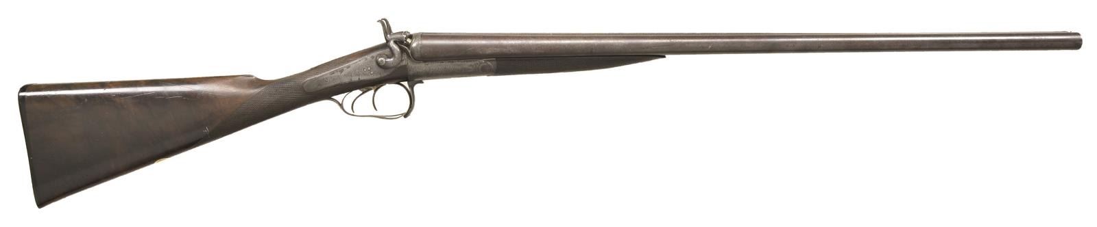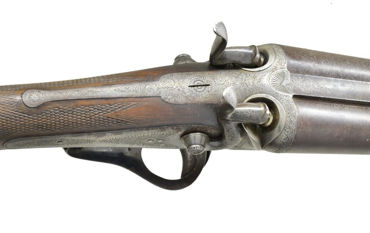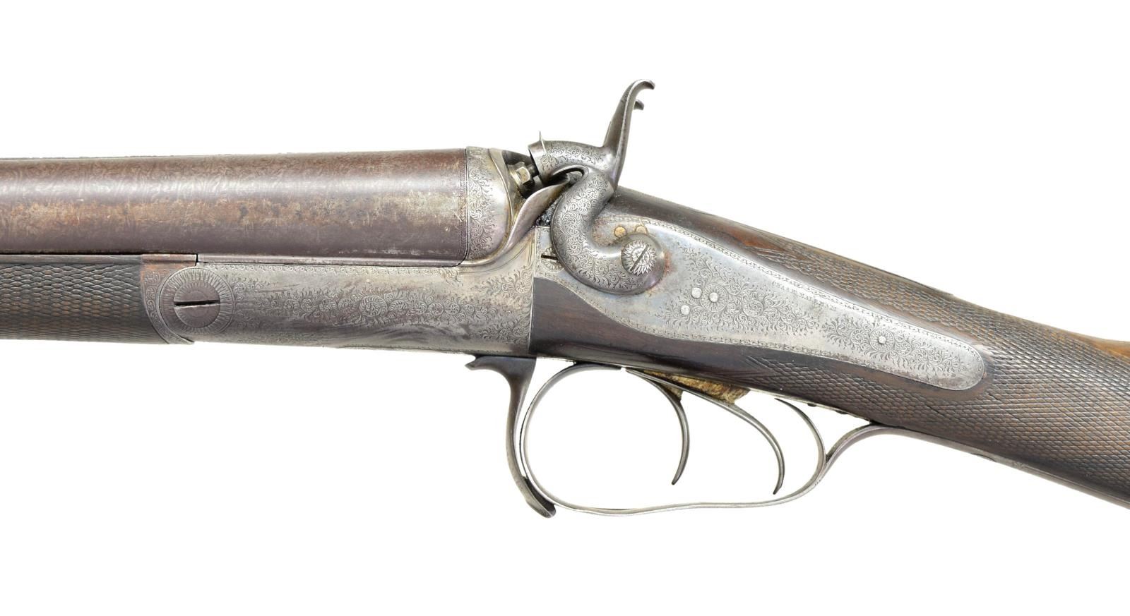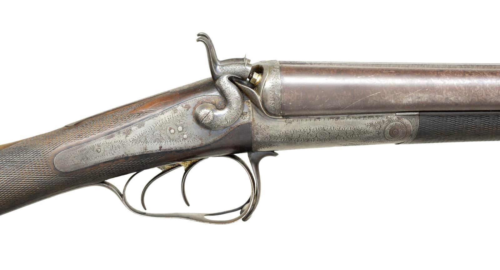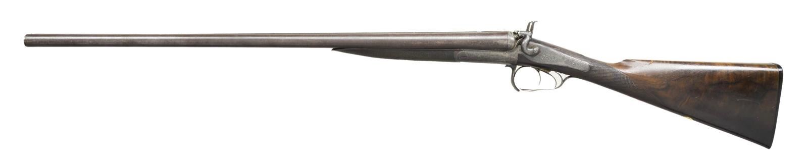 BY CHARLES MALEHAM. Cal. 12 Ga., 2 5/8". S# 1267. This fine gun built to Purdey's patent has 28" Damascus bbls. engraved "Chas H. Maleham 5 Westbar Sheffield. No 1267." on medium width game rib. Bbl. flats are stamped with London black powder proofs. Case hardened round bar Purdey third type thumbhole action is fitted with penninsula backspring locks with serpentine rebounding hammers. Water table is stamped "JP Patent No 1104" with use number "4242". It is also stamped "Patent Bolt". Action and lockplates are engraved with 80% coverage very well cut small scroll. Maker's name is at the top of each lockplate. Thumbhole trigger guard with scroll on bow has serial number on tang. Straight grip buttstock of well marbled and nicely stump figured European walnut measures 14 5/8" over original checkered horn buttplate. Flat top point pattern checkering is at grip and a gold oval engraved with the monogram "CDO"? is on toeline. Matching splinter forend with shaped steel tip has pushbutton Deeley type release. Button is stamped with W. C. Scott lighthouse logo over "PATENT". MEASUREMENTS: BBLS: Bore Diameter: R .734", L .735". Recess Choke: R .021" (MOD), L .021" (MOD). This treatment appears to be original and was an early method of concentrating shot pattern and is quite effective. Min. Wall Thickness: R .018" bottom of recess .027" elsewhere, L .018" top of recess, .025" elsewhere. STOCK: DAH: 2" DAC: 1 11/16". LOP: 14 5/8". CAST: approx. 1/4" off. WEIGHT: 6 lb. 14 oz. CONDITION: very good to fine original as found with bbls. retaining most of their brown with good definition to pattern. Finish is thinning on sides and there is some scattered light mottling. Action and locks retain 10-25% case hardening color; balance is handworn to gray/brown. There is also some brown spotting on right lockplate. Stocks retain most of their original oil finish with a large number of small and medium nicks and dings. Checkering is somewhat worn. Bores are mostly shiny with some considerable pitting toward breech ends. There are no noted repairs or dents. Action is tight. Locks are fine. (01-21618/MGM). ANTIQUE. $2,000-3,500.