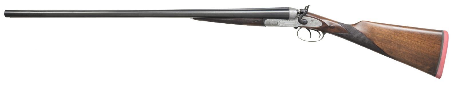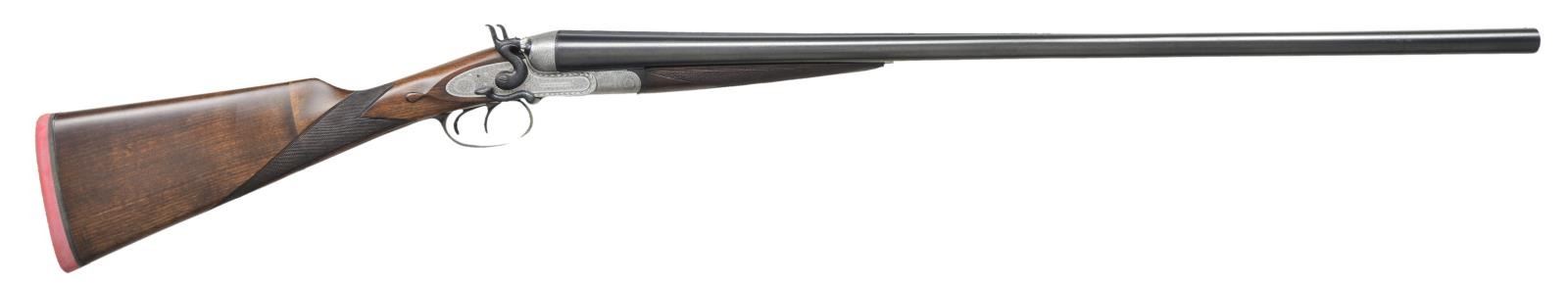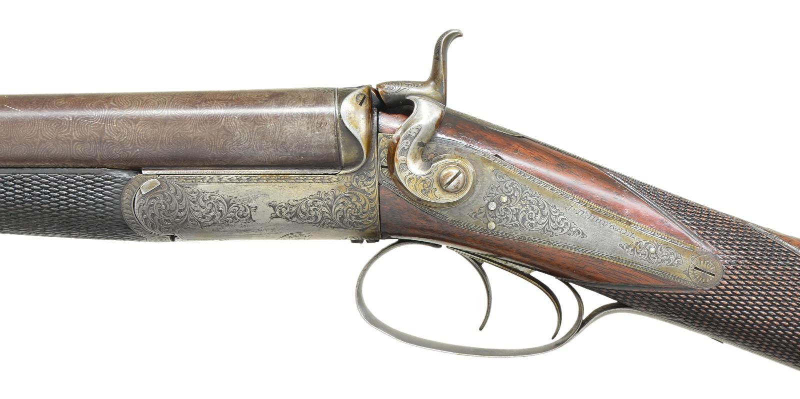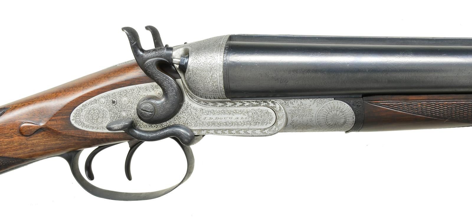 Cal. 12 ga. 2 3/4". S# 3934. The 30" Damascus dovetailed bbls. are engraved "J. D. Dougall Gun & Rifle Manufacturer to H. R. H. The Prince of Wales, 59 St. James's St. London" on broad slightly raised pigeon rib. Bbl. flats are stamped with London black powder proofs and "NOT FOR BALL" (pre-1891). Extra heavy sidelever action is fitted with front spring rebounding locks having serpentine hammers. Action and locks are engraved with near full coverage well cut small scroll within scroll and feather borders. Maker's name is on each lockplate and water table is stamped "HIGHEST" (referring to quality). Trigger guard with scroll on bow has serial number on tang. Newly made straight grip buttstock of plain European walnut measures 14 1/4" over "Silver" type pad and features drop points and point pattern grip checkering. Splinter forend with original wood has Anson release. MEASUREMENTS: BBLS: Bore Diameter: R .731" L .731". Recess: R. 030". L .040". Restriction: R .005", L .002". Min. Wall Thickness: R .022" overall (.020" in recess), L .025" overall (.015" at top of recess). STOCK: DAH: 2 1/2". DAC: 1 1/2". LOP: 14 1/4". CAST: neutral. WEIGHT: 6 lb. 14 oz. CONDITION: good as refurbished. Bbls. retaining nearly all of a reblue over pitting and Damascus pattern. Action cleaned to silver gray. New buttstock retains nearly all of its original oil finish. Forend refinished to match with checkering recut. Bores are bright but show general polishing overall with remnants of pitting visible throughout. Action is tight. Locks are good. Right hammer is loose on tumbler. (01-21626/MGM). ANTIQUE. $1,800-2,750.