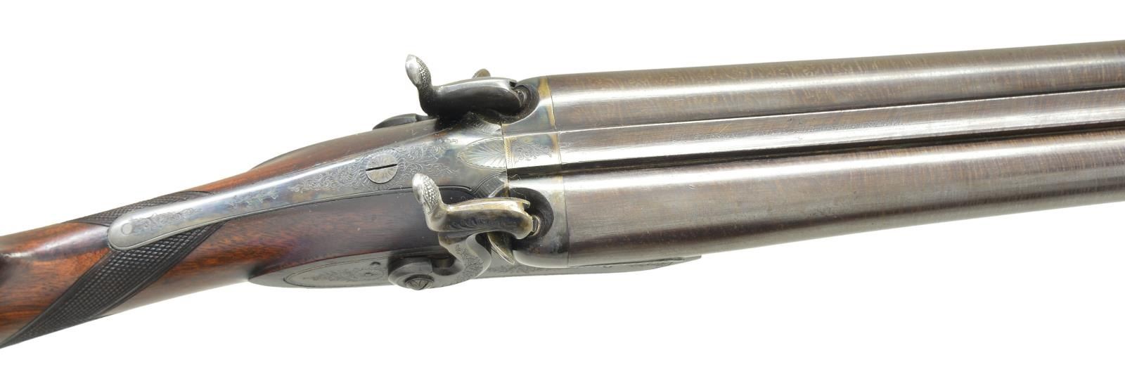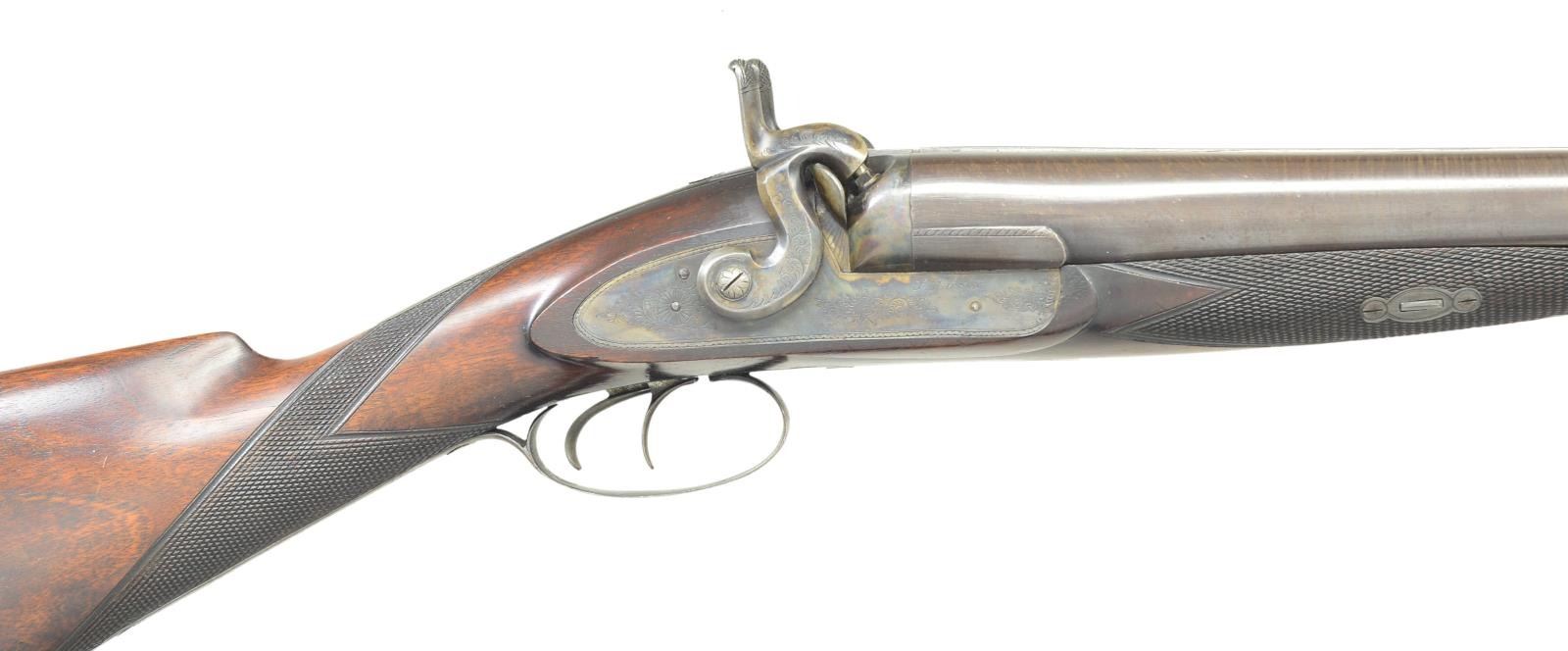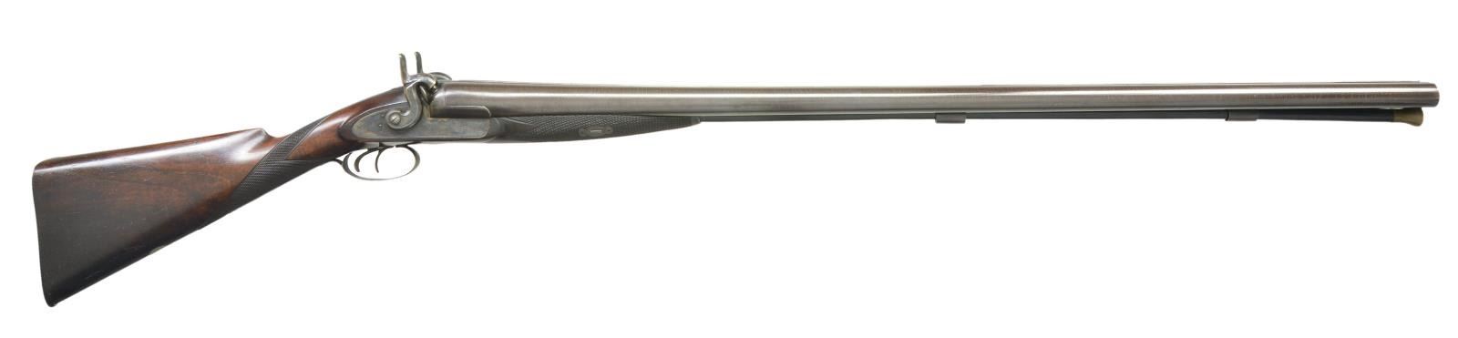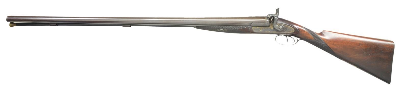 PERCUSSION SHOTGUN BY J. FARSON. Cal. 8 Ga. NSN. Large bore shotguns like this were generally used in harsh, salty, wet environments and are seldom found in high original condition. This good quality British double gun remains in exceptional original condition. It has 36" twist (laminated) steel barrels. Top of rib is engraved "J. Farson London Laminated Steel". Bottoms of barrels are stamped with Birmingham black powder proofs, gauge "9" and "ROSES PATENT No 20". (The Rose Brothers (Hales-Owen Mills & Forge) were barrel makers located in Halesowen, Worcestershire, operating between 1860 and 1892). Case hardened breech plugs have some scroll engraving on rib extention. Both hooks and bottom of right barrel are stamped with barrel maker's mark "JA". No blowouts are present. Case hardened breech iron is also scroll engraved. Front spring locks with tall chamfered serpentine hammers have geometric borders around sprays of scroll. "J. Farson" is on each lockplate. Trigger guard has extended vase shaped finial; it and trigger guard are also scroll engraved. Straight grip stock of relatively plain European walnut measures 13 7/8" over blued steel buttplate with short top spur. Point pattern checkering with mullered borders is at grip and forend. A vacant German silver oval is on toeline. Stock attaches to barrels with captive sidebolt through shaped and line engraved steel escutcheons. Ebony ramrod with brass tip and tail (worm under cap) mounts through two plain pipes and thimble which matches trigger plate. MEASUREMENTS: BBLS: Bore Diameter: L .826". R .826". Restriction: L .000". R .000". Wall thickness: L .040". R .050". STOCK: DAH: 3 1/8". DAC: 1 7/8". CAST: neutral. LOP: 13 7/8". WEIGHT: 12 lb. 4 oz. CONDITION: exceptionally fine. Barrels retaining over 95% original brown finish with some scattered light freckling and show good definition to pattern. Nearly all vibrant case hardening color remains on breech plug, breech iron, locks and trigger plate. Some sharp edge wear is noted on hammers. Breech iron tang has begun to silver at rear. Original blue on trigger guard is almost all flaked to brown and silver. A good amount of blue remains on inside of guard. Silvering is noted on barrel bolt and thimble from normal hand wear, as this is the balance point of this fairly heavy gun. There is about 70% original blue remaining on buttplate. Stock retains over 95% original oil finish with some scattered light marks, along with a 1/2" bump which is fairly deep on right side of comb. Bores are bright and shiny throughout. Gun does not appear to have ever been fired. Nipples remain bright. Locks are crisp. (01-21789/MGM). ANTIQUE. $5,000-8,000.