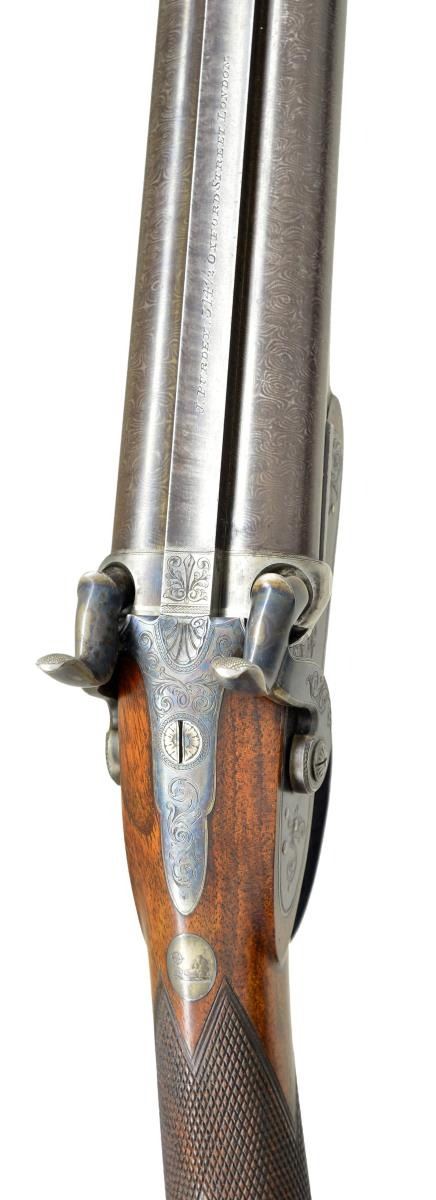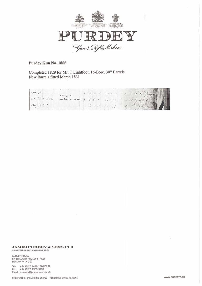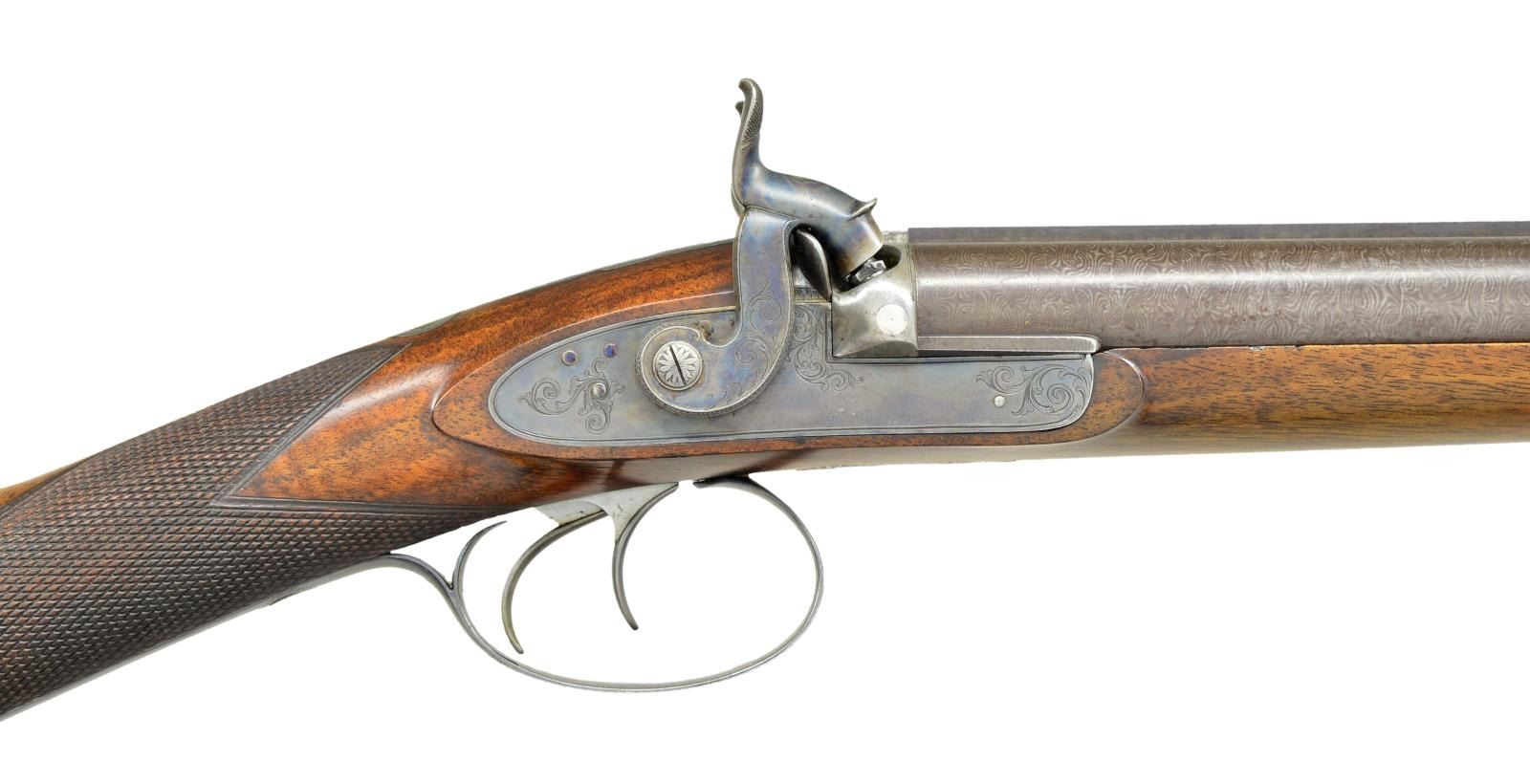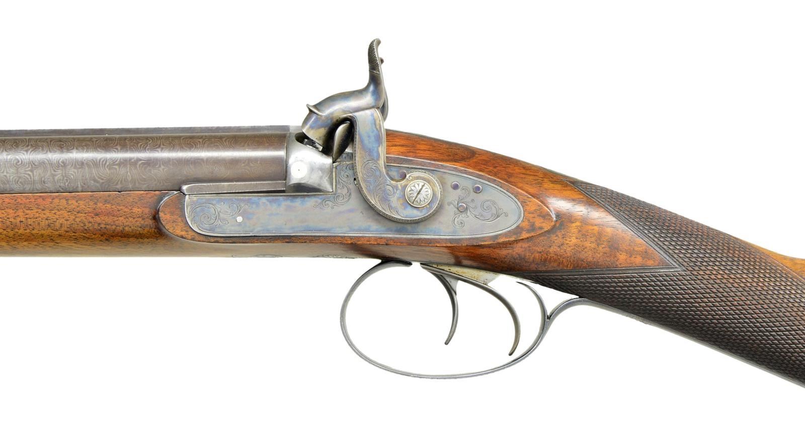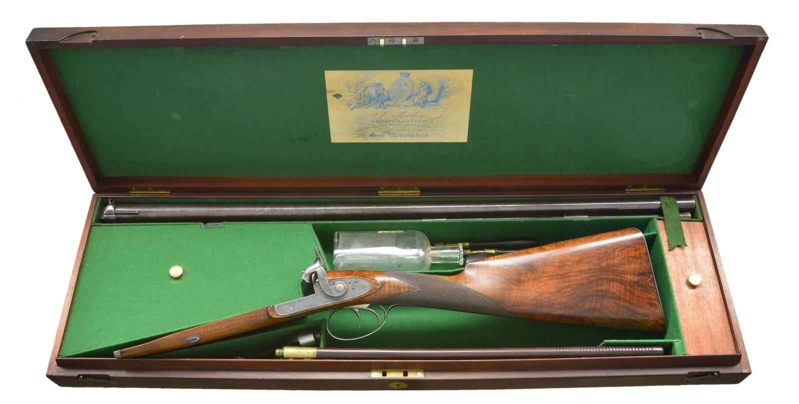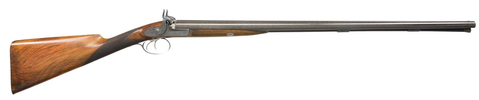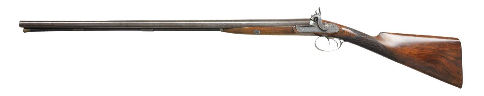 PERCUSSION SHOTGUN WITH CASE AND ACCESSORIES INCLUDING VERY RARE PATENT DENTED WAD PUNCH AND WADS. Cal. 16 Bore. S# 1866 (1829). Purdey records indicate that this shotgun is a 16 bore double with 30" barrels, sold on Oct. 1829 in conjunction with gun number 1837 for a total of 100 pounds. At the time the standard price for a double gun was 55 pounds. Records also indicate "New barrels fitted in March 1831" (info from Appendix 3 "The Early Purdeys"). The 30" two stripe Damascus barrels are fitted with raised game rib engraved "J. Purdey 314 1/2" Oxford Street. London." Bottoms of barrels are stamped with S#'s, London black powder proofs and the number "3". Bottom of left barrel is stamped "46". Breech plugs with vented platinum blow outs have platinum lines at breech ends. Hooks are stamped with S#'s, followed by a dot. (possibly as indication of rebarreling per factory records). Right plug is stamped with barrel maker's initials "TE" (Thomas Evans). Original nipples are stamped "L" & "R". Rosewood ramrod with brass head and tail (worm under cap) is stamped with S# on head and is held by two plain pipes. Case hardened breech iron with integral fences has simple but well cut open scroll engraving. Front spring locks with tall serpentine hammers are also very lightly engraved and are not engraved with maker's name. Purdey guns of this period did not show a large covering of engraving but this gun is exceptionally sparse. Stock of lightly marbled and somewhat fiddle figured dense European walnut measures 14 5/8" over blued steel buttplate with long scroll engraved top spur. Blued trigger guard has a simple spray of scroll on bow. Case hardened trigger plate has classic Purdey type pineapple finial engraved with a shell. Flat top point pattern checkering is around grip. Top of grip has small silver oval engraved with an armored fist holding a globe. Stock attaches to barrels with captive side bolt through oval silver escutcheons. MEASUREMENTS: STOCK: DAH: 2 1/16". DAC: 1 1/2". CAST: about 1" off (factory records indicate "stocked for left eye"). LOP: 14 5/8". WEIGHT: 6 lb. 12 oz. UNATTACHED ACCESSORIES: PROVENANCE factory letter with photocopy of ledger page listing this gun and notation "completed 1829 for Mr. T. Lightfoot, 16 bore 30" barrels. New barrels fitted March 1831". Gun is housed in its original mahogany case. Top has flush mounted "D" ring handle with central brass circle. Lid is secured by two pivoting hooks and key lock with round brass escutcheon. Interior is lined in green cloth with blue printed Purdey label in lid which has had "safety gunlock" info and address change cropped from bottom. Case contains a red Morocco leather covered powder flask by James Dixon, along with a James Dixon embossed leather shot flask and very interesting early brass capper with lathe cut decoration on top and three translucent horn windows on bottom for viewing caps. (all in large covered compartment, bottom of cover with brass knob has a dot inscribed with this guns S# "1866".) A large open compartment holds ebony handled nipple and hammer nose cleaning jags along with nipple wrench. A clear glass bottle is also included. Another compartment holds very rare Purdey patented dimpled or dented wad punch. The wads produced allowed air to escape while they were rammed into position over powder or shot. Some known examples are engraved with gun S# and "Detonator Purdey's". This later example only has maker's initials "SA" (Samuel Allen) and gauge "16". Another compartment with mahogany cover which also has gun S# underneath is filled with a large number of Purdey special wads of the type cut with this punch. Cleaning equipment includes a two piece Rosewood cleaning rod with worm & jag. CONDITION: truly exceptional. Barrels retaining over 90% original brown which shows some silvering at muzzles and some lightening of color from hand wear on sides above grip. Breech plugs retain most of their case hardening color. Locks, breech iron and trigger plate retain essentially all their case hardening color. Trigger guard retains well over 95% original bright blue. Buttplate about 85% with some loss at heel associated with loading. Stock retains nearly all its original oil finish with a few minor bumps and some oil rubbed in as maintenance. Bores are bright and shiny throughout, locks are crisp. Case is also exceptional, exterior only has a small number of scratches in its smooth original oil finish, interior cloth is very fine with some insect damage and light soiling. Label is fairly crisp and lightly foxed with rub through from contact with hammer screw. Accessories are also very fine. Wad punch with bright cutting cone has a small patch of oxidation, body retains most of its temper black. An exceptionally fine condition early Purdey. (01-21929/MGM). ANTIQUE. $6,000-9,000.
