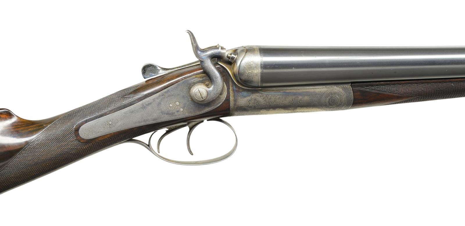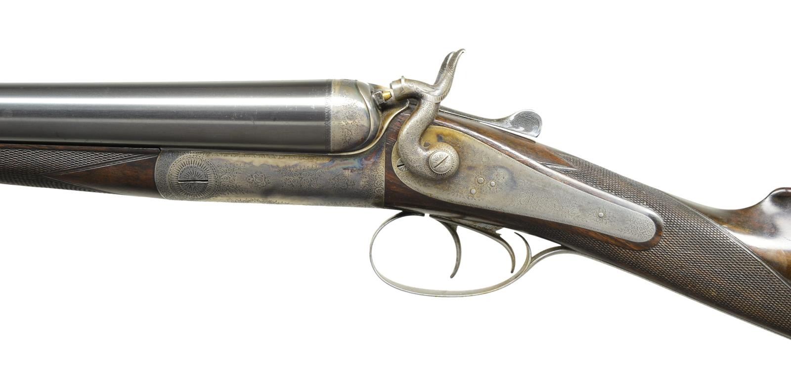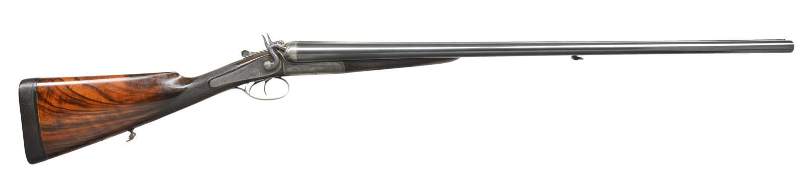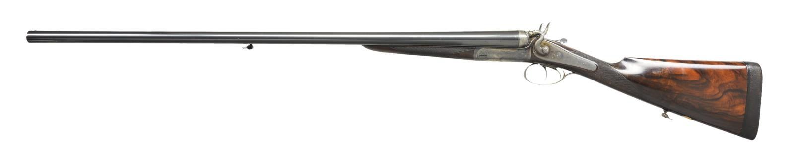 WITH ISLAND LOCKS AND RARE LOADED CHAMBER INDICATORS. Cal. 12 Ga., 2 3/4". S# 12158 (1885). Although this classic Purdey hammer gun was made in 1885 it is very interesting that it incorporates Purdey's patent # 1464 of 1866, a system by which a series of levers that causes pins to protruded from the top of the action when the gun is loaded. This feature went out of fashion soon after the advent of rebounding hammers around 1870. This fine gun has 30" dovetailed steel barrels engraved "J. Purdey & Sons, Audley House, South Audley Street, London. Made of Sir Joseph Whitworth's Fluid-Pressed Steel" on narrow swamped game rib. Rear portion of rib with scroll engraving is also engraved "2". A corresponding "2" is engraved on watertable and forend iron. Barrel flats are stamped with London blackpowder proofs and 1993 London re proofs for 2 3/4" chambers. Early proofs ("12B 12M") and "not for ball" are on bottoms of barrels along with S# and barrel maker's initials "GA" (G. Aston). A sling loop is screwed to bottom rib. Case hardened round bodied top lever action fitted with island back spring rebounding locks features hidden third fastener, loaded chamber indicators and double triggers. Action and locks are engraved in near full coverage Purdey house style rose and small scroll as most likely cut by James Lucas, head engraver. Top lever with matching scroll is engraved "PATENT". Bottom of action is engraved "PURDEY'S" "PATENT". Maker's name is on each lockplate. Attractively dark marbled and lightly figured European walnut straight grip buttstock measures 14 3/8" over dark brown leather covered pad. Closely spaced point pattern checkering is at grip. Sling loop and vacant gold oval are on toeline. Matching splinter forend has Anson release. Actioner's initials "A.M" (Matthews ?) are on the iron. MEASUREMENTS: BBLS: Bore Diameter: L .736". R .736". Restriction: L .020" (Mod). R .004" (IC). Wall thickness: L .031". R .029". STOCK: DAH: 2"+. DAC: 1 3/16". CAST: very slightly off. LOP: 14 3/8". WEIGHT: 7 lb. 0 oz. CONDITION: fine with some refinish. Barrels retaining nearly all of a good reblack most likely done at time of reproof, engraving remains good. Action and locks retain 50-60% original case hardening color, strong where protected. Traces of original blue remain on top lever and trigger guard, most loss is do to flaking. Stocks retain nearly all of a glossy oil refinish with some subsequent marks, checkering is lightly worn. Bores are bright and shiny without noted problems, right barrel with perhaps a hint of frosting. Action is tight, barrels on face, locks are crisp. A very nice "Best" hammer gun. (01-21992/MGM). ANTIQUE. $7,500-12,000.