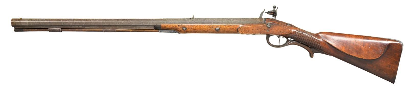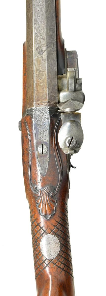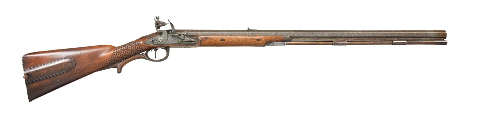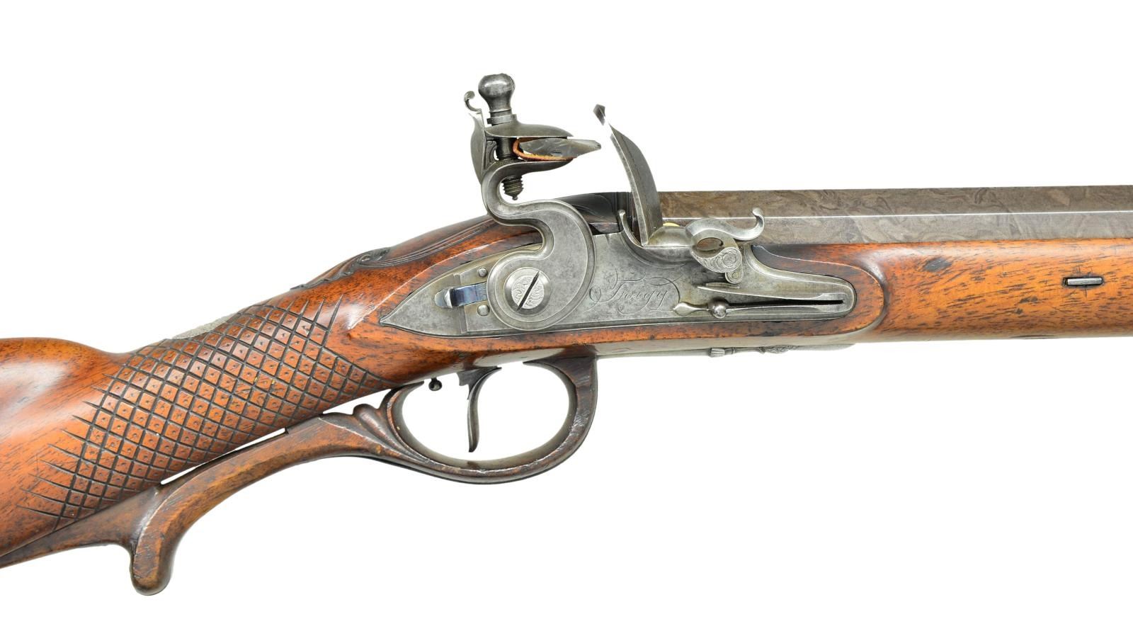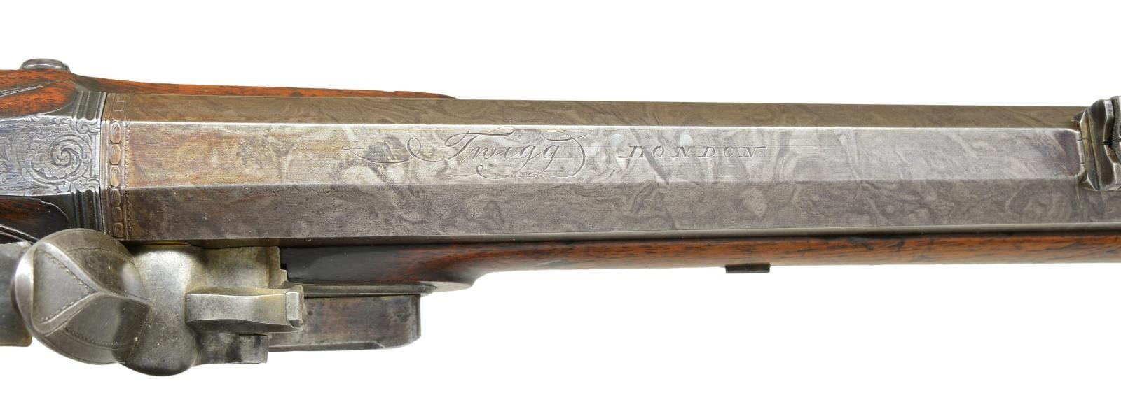 RIFLE EX. W. KEITH NEAL COLLECTION. Cal. 60. 9 groove rifling. S# NSN. John Fox Twigg was the preeminent London gunmaker from about 1770 until his death in 1790 when his business was continued by his nephew, John Bass who died in 1795. Twigg was responsible for beginning the high reputation given to the London gun trade. His apprentices included Durs Egg and John Manton who became his shop foreman until he went on his own in 1781. This fine rifle made around 1775 has 28 1/8" swamped octagon barrel of skelp twist with under rib. Top flat is engraved "Twigg" in script and "LONDON". Barrel is fitted with one standing and one folding leaf rear and brass bead front sights. Bottom right flat is stamped with London gunmakers proofs and "IT" under a crown. Touch hole is gold lined. Breech iron is nicely scroll engraved. Second Twigg style flint lock with rebated tail, flat faced serpentine cock, rounded pan, bridled roller frizzen and feather spring with bulbous finial and teat. Lock has file decoration behind fence and ovolo moulded edge to plate and cock. Center of plate is engraved "Twigg". Lock is fitted with back sliding safety which engages at half cock and also bolts frizzen. Trigger with bulbous blade is "set". Wooden trigger guard has inlet steel reinforcing band which ends in acorn finial. Steel buttplate has scroll engraving on top tang. A patchbox with sliding wooden cover is found on right side of butt which contains some cast balls, brass powder measure, steel worm and a note signed "W. Keith Neal 5/8/60" relating how well this rifle shot and with load information. Also included is an original W. Keith Neal Collection tag number "G395". Horn tipped half stock of plain European walnut features swept right hand cheekpiece, very widely spaced square checkering at grip with dot punched centers of diamonds and very nicely carved ribbons and shell in high relief around barrel tang. A silver oval at top of grip is engraved with the monogram "JHC" surmounted by a hedgehog passant. The crest of James Harris, Diplomat, created 1st Baron Malmesbury 1788. Stock attaches to barrel with two captive sidebolts without escutcheons. What appears to be the original hickory ramrod with horn tip and long steel tail mounts through two beaded pipes and matching thimble. CONDITION: very good, barrel retaining nearly all of a good quality re brown with fine pattern visible. Other iron and steel parts show light cleaning to relatively smooth light gray to silver patina. Stock appears to have had a light oil refinish over some fairly deep marks and a great number of subsequent light marks. Patchbox cover shows repair at rear behind thumbprint. Bore is bright and shiny with at few scattered light pits toward muzzle. Lock is very fine, safety operable. This rifle was offered at the 2001 Christie's sale of the W. Keith Neal Collection. (01-21900/MGM). ANTIQUE. $12,000-15,000.