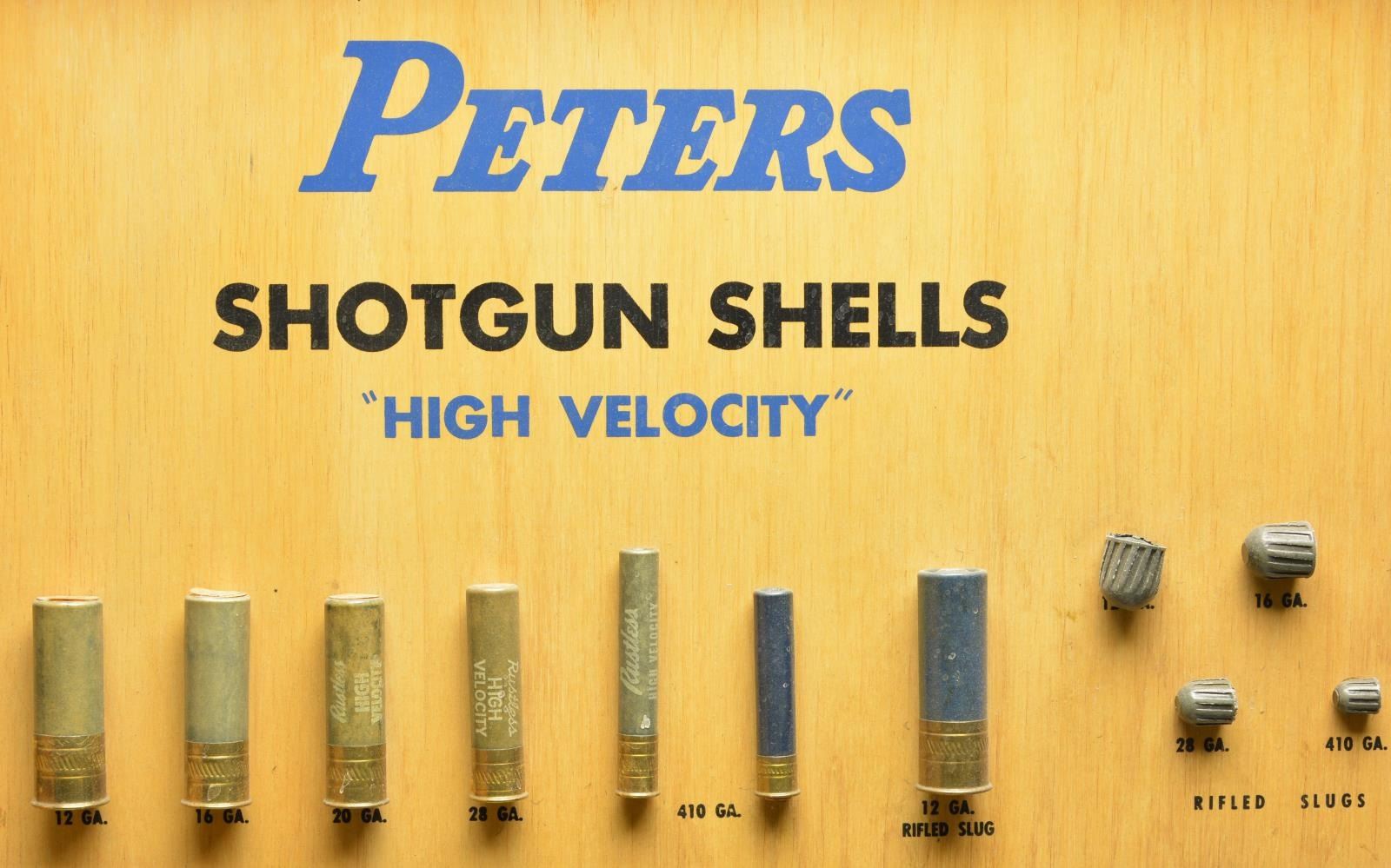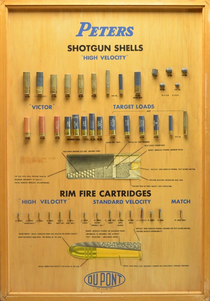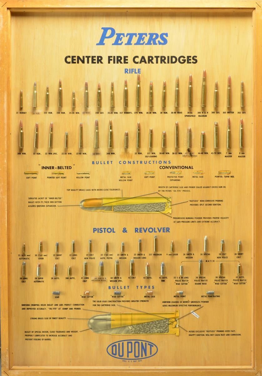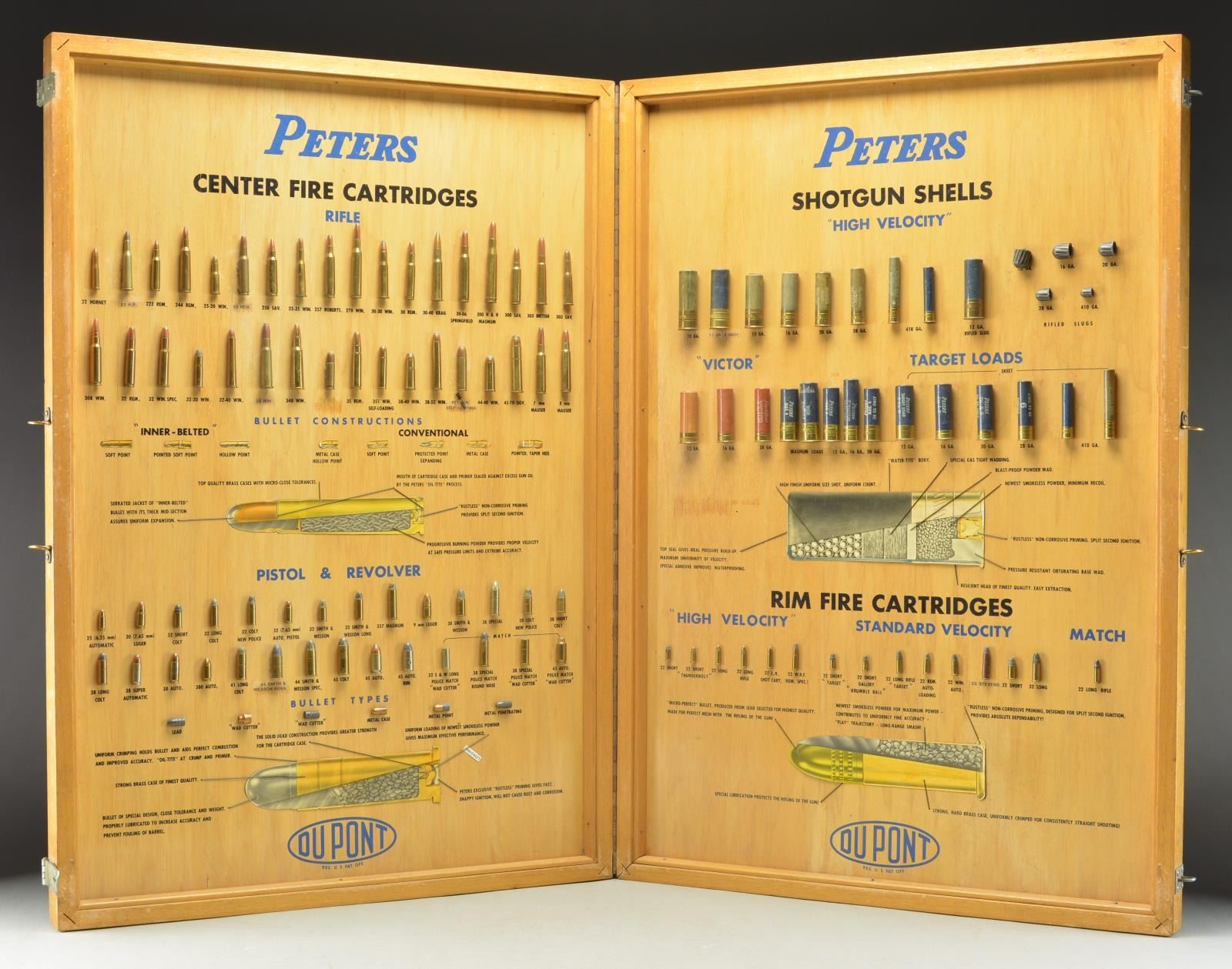 DISPLAY BOARD. Open dimensions: 50 3/4" x 36 1/4". Left panel is titled "PETERS CENTERFIRE CARTRIDGES". The 34 rifle cartridges displayed vary in size from the 22 Hornet up to the 45-70 including a wide variety of calibers & proprietary brands. The 2nd section is titled "BULLET CONSTRUCTIONS" and shows inner-belted & conventional style bullets. A cutaway cartridge diagram is labeled with parts identification & nomenclature. Third section is titled "PISTOL & REVOLVER", it displays 28 handgun cartridges ranging from the 25 Auto to the 45 Auto with Police Match Wadcutter bullet. Below that is a display of bullet types including lead, wadcutter, metal case & metal penetrating styles. Following is a cutaway revolver cartridge diagram with nomenclature labeling. Right panel is labeled "PETERS / SHOTGUN SHELLS / HIGH VELOCITY". 23 Paper shotshells in gauges 410 to 10 Ga. displayed along with rifled slugs in 12, 16, 20, 28 & 410. Cutaway shot shell diagram show parts nomenclature. The lower portion is titled "RIM FIRE CARTRIDGES". Style shown are high velocity, standard velocity and match. 15 Cartridges are displayed ranging from 22 Short to 25 Stevens as well as 32 Short & 32 Long. A rimfire cartridge cutaway is labeled with appropriate nomenclature. Bottom of both sections have blue oval marking "DUPONT" followed by "REG. U.S. PAT. OFF.". Upper right corner of right portion exterior is stamped "PROPERTY / REMINGTON ARMS CO. INC. / BRIDGEPORT CONN.". The 2 display panels are connected by a metal hinge with iron latches & brass handle rings. Many of the cartridges were produced in the 1936-1956 time period giving a clue to the board's age. CONDITION: Both interior sections are in very good clean condition. Some displays show evidence of reattachment with some labels are missing or changed. Exterior shows age related wear & handling marks. (02-18190/DS). $10,000-15,000.