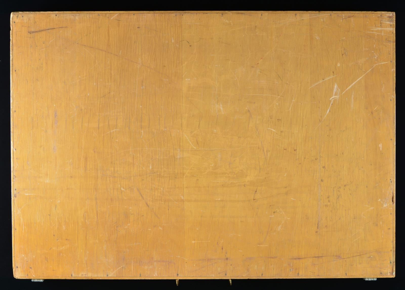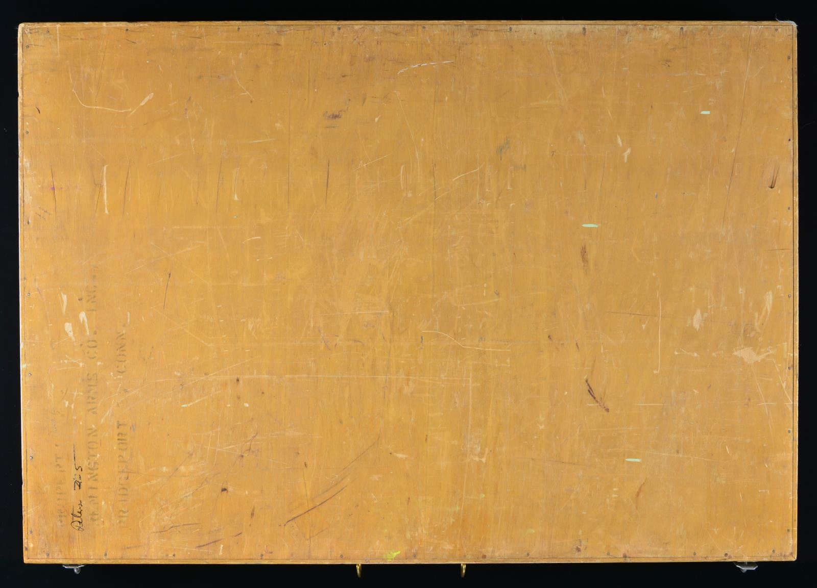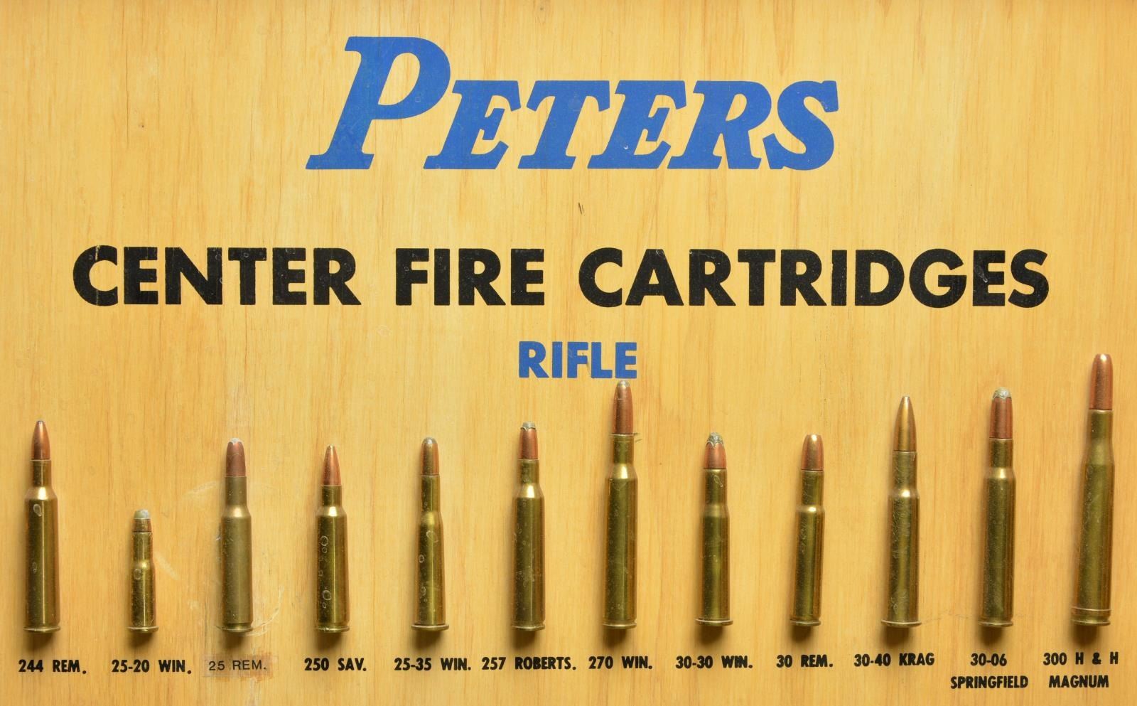 DISPLAY BOARD. Open dimensions: 50 3/4" x 36 1/4". Left panel is titled "PETERS CENTERFIRE CARTRIDGES". The 34 rifle cartridges displayed vary in size from the 22 Hornet up to the 45-70 including a wide variety of calibers & proprietary brands. The 2nd section is titled "BULLET CONSTRUCTIONS" and shows inner-belted & conventional style bullets. A cutaway cartridge diagram is labeled with parts identification & nomenclature. Third section is titled "PISTOL & REVOLVER", it displays 28 handgun cartridges ranging from the 25 Auto to the 45 Auto with Police Match Wadcutter bullet. Below that is a display of bullet types including lead, wadcutter, metal case & metal penetrating styles. Following is a cutaway revolver cartridge diagram with nomenclature labeling. Right panel is labeled "PETERS / SHOTGUN SHELLS / HIGH VELOCITY". 23 Paper shotshells in gauges 410 to 10 Ga. displayed along with rifled slugs in 12, 16, 20, 28 & 410. Cutaway shot shell diagram show parts nomenclature. The lower portion is titled "RIM FIRE CARTRIDGES". Style shown are high velocity, standard velocity and match. 15 Cartridges are displayed ranging from 22 Short to 25 Stevens as well as 32 Short & 32 Long. A rimfire cartridge cutaway is labeled with appropriate nomenclature. Bottom of both sections have blue oval marking "DUPONT" followed by "REG. U.S. PAT. OFF.". Upper right corner of right portion exterior is stamped "PROPERTY / REMINGTON ARMS CO. INC. / BRIDGEPORT CONN.". The 2 display panels are connected by a metal hinge with iron latches & brass handle rings. Many of the cartridges were produced in the 1936-1956 time period giving a clue to the board's age. CONDITION: Both interior sections are in very good clean condition. Some displays show evidence of reattachment with some labels are missing or changed. Exterior shows age related wear & handling marks. (02-18190/DS). $10,000-15,000.
