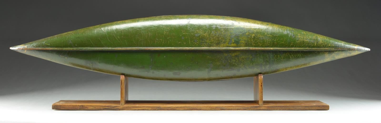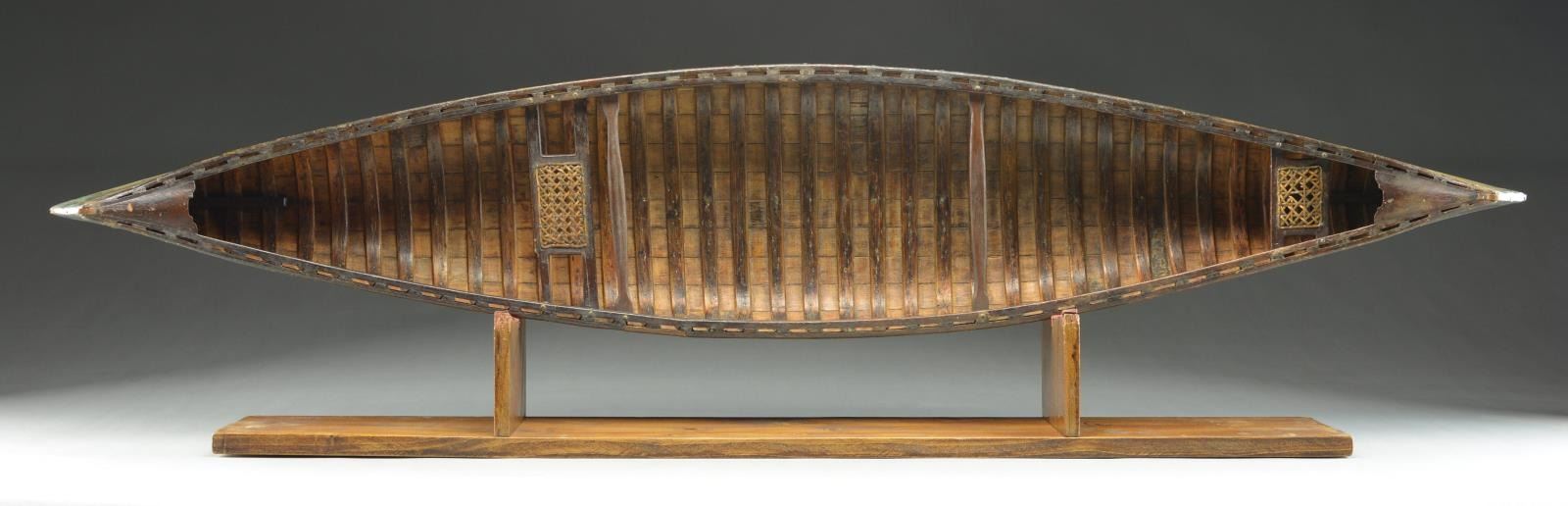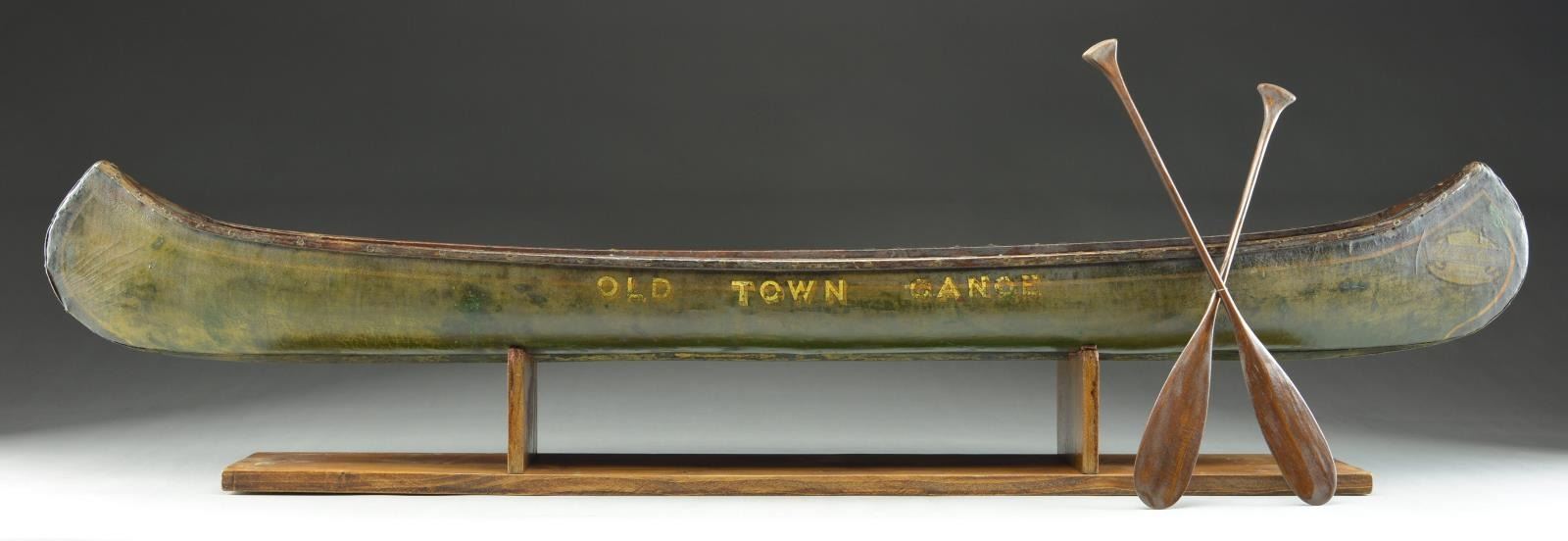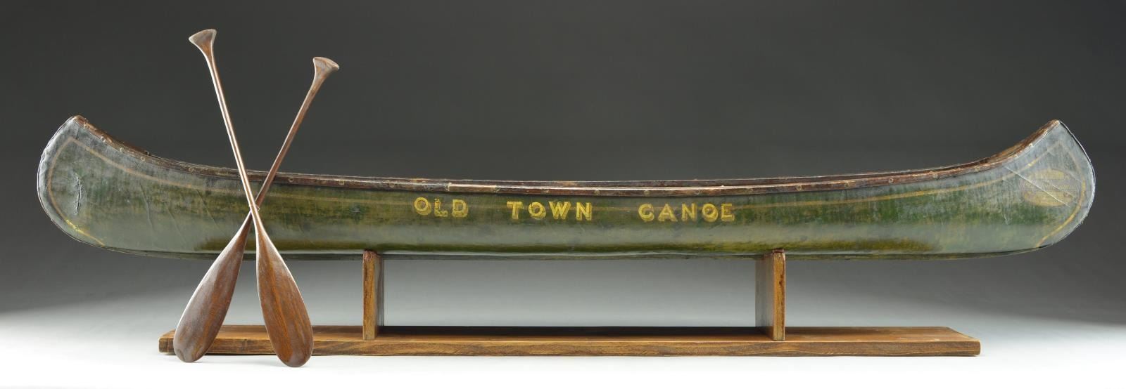 This canoe was discovered approximately 60 years ago near Hackensack, New Jersey. While researching the Old Town Canoe Co. files, a record (#88798) was discovered which quite likely relates to this model. Please note: most of the Old Town sample canoes do NOT contain serial numbers as do their full size items. The 'build cards' identify each item made with a serial number and description of size, paint, trim, etc.; however, these numbers exist on the sales slips but not always on the canoe itself. During the research it was discovered that only one Old Town Canoe sample manufactured in 1926 was shipped on Feb. 27 to J.W. Teshune Manufacturing Company, 239 Main Street, Hackensack, New Jersey. Few such examples remain today, and even fewer in original condition. REFERENCE: this exact canoe model is illustrated and described in a recent book titled, “Little Things That Matter: Collecting Antique Factory Sample Canoes” by Roger Young on page #80. In addition to this canoe, a great number of small canoes or salesman sample canoes from various companies are illustrated and described in this interesting book. UNATTACHED ACCESSORIES: a pair of sample paddles of appropriate size and vintage accompany the canoe along with a copy of above referenced book "Little Things That Matter" signed by author as well as inscribed to the next owner of this fine piece. Photocopy of Old Town 'build record' 88798 is included. Accompanied by a custom made stand for display. SIZE: 48". CONDITION: some small repairs and touch ups over the years. The paint is a little faded on one side which is to be expected as these examples were normally hung in the store window so the side was exposed to the sun. Most importantly the canoe retains its original fragile decals and lettering which is also original. PROVENANCE: From the personal collection of Roger Young. (05-1/JDJ). $15,000-18,000.