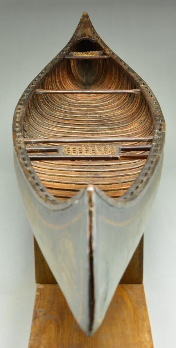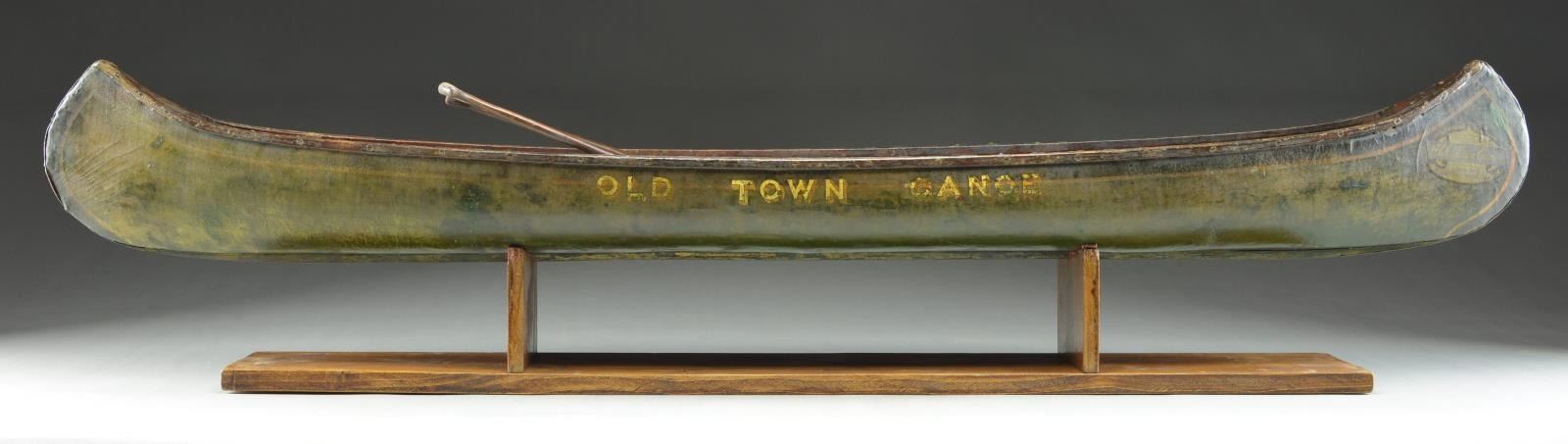 SALESMAN SAMPLE MADE IN 1926. This 48" Old Town Canoe sample in original condition is a wonderful sporting rarity. There were a number of early canoe manufacturers in the State of Maine around the turn of the 20th century including Old Town, which eventually became the leader. The company is still in business today but in the early 1900’s, they distributed a limited amount of these rare display samples. These samples were not simply given to anyone who handled Old Town canoes but only to those customers who purchased one or two car train loads of Old Town canoes. They received one of these 48" samples or possibly an 8 ft. example. According to records as can be best ascertained it is believed that less than 100 of these 48" models were made and distributed (it is also believed that 30-40 8 ft. examples were made and distributed).
