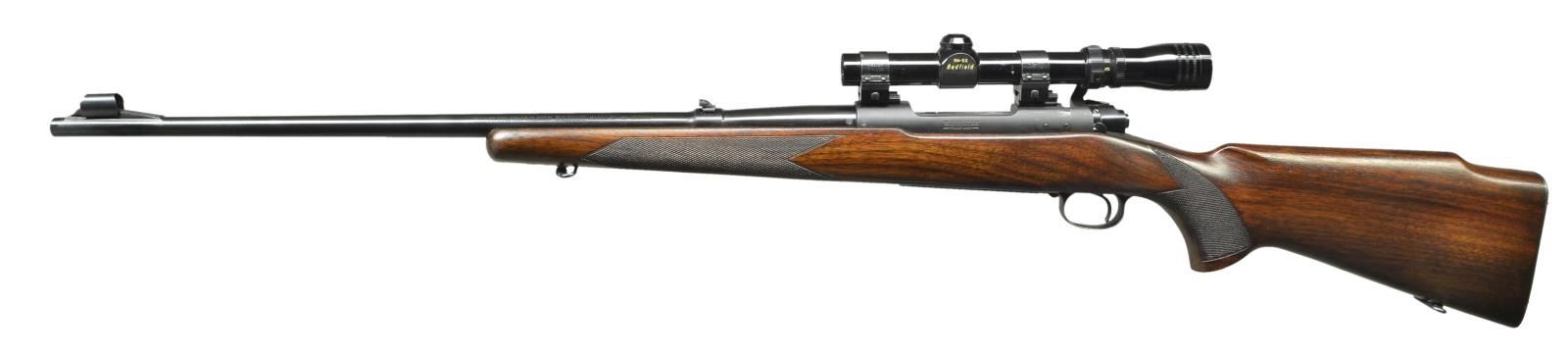 Cal. 30-06 SPRG. S#. 235252. Bbl. 24" with hooded ramp bead front sight and folding leaf rear sight. Redfield Widefield 1 3/4 - 5X20 gloss finished scope with post reticle on Weaver mounts. Bolt has claw extractor and is numbered to rifle. Monte Carlo walnut stock with hand checkering, sling swivels and checkered steel buttplate. 1953 Mfg. CONDITION: very good. Over 97% original blue showing small spots. Dark colored stock has very good original finish and checkering showing small marks. Bright near excellent bore. (22-5636/DS). CURIO. $1,000-1,500.