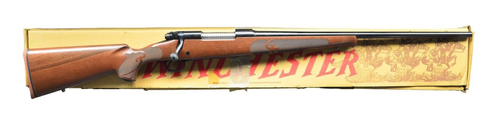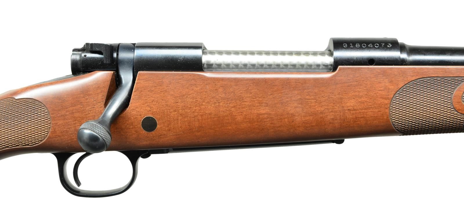 RIFLE. Cal. 7mm Mauser (7x57). S# G1804073 (1986). Bbl. 22" w/out sights. Drilled & tapped on top of receiver. Bolt electro penciled "073". Walnut sporter stock w/ XTR checkering & Win. buttpad. UNATTACHED ACCESSORIES: matching numbered box w/ hang tag & CONDITION: near excellent overall including bore. (23-154/MD). MODERN. $800-1,200.