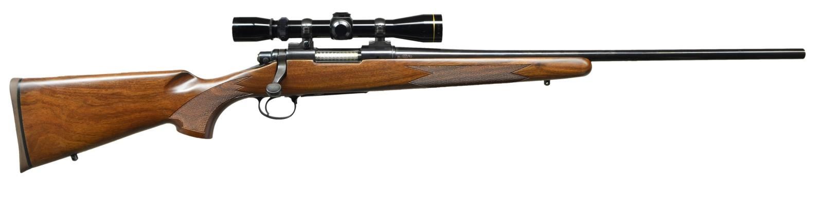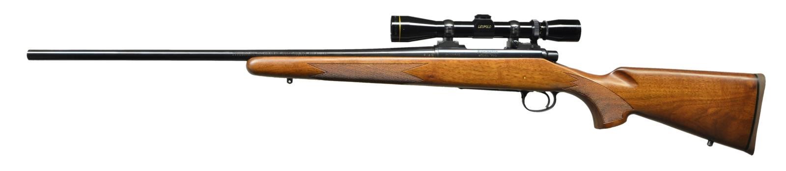 Cal. 250 Savage. S# B6538431. Bbl. 24". Mfg. Oct. 1983. Bright blued metal finish w/ beautiful hardwood stock. Checkered forend & pistol grip. Rubber factory recoil pad. Sling studs front & rear. Receiver drilled & tapped for scope bases, currently sporting Leupold VARI-X 3x9 Compact scope w/ duplex reticle. CONDITION: all aspects indicate very little use. No visible blemishing on stock. No metal finish wear aside from some extremely light thinning in areas of mechanical intervention. Bright bore w/ strong rifling. (23-129/JZ). MODERN. $800-1,200.