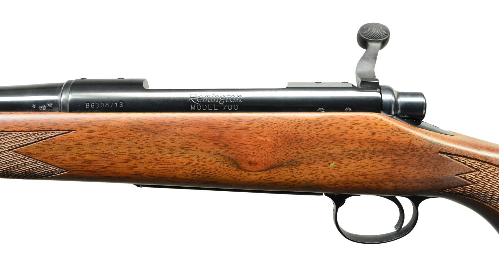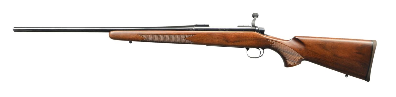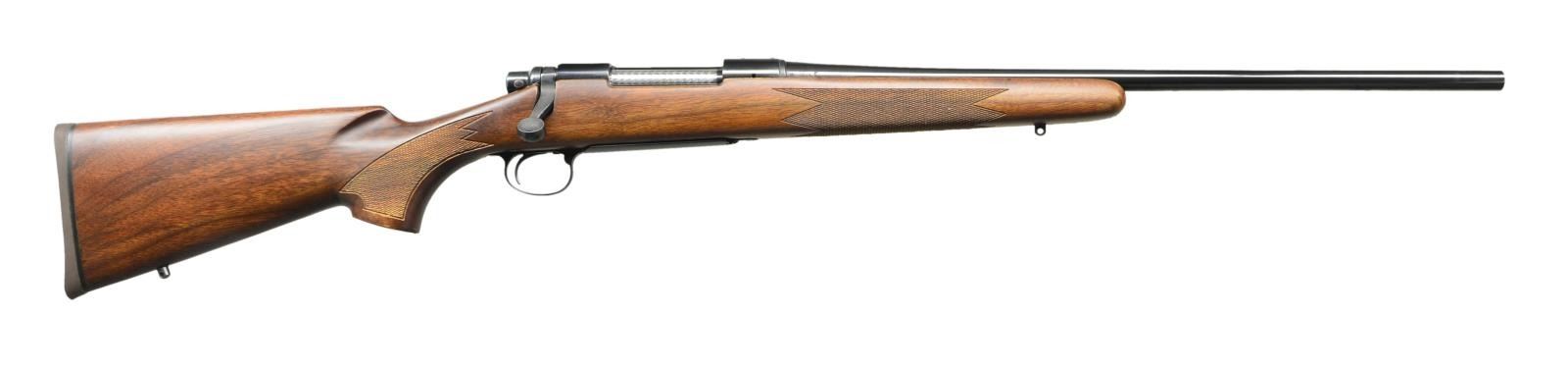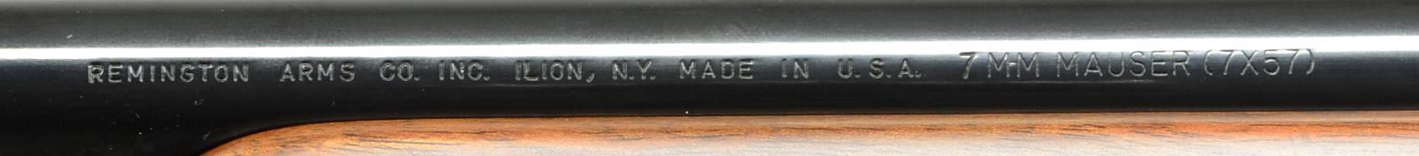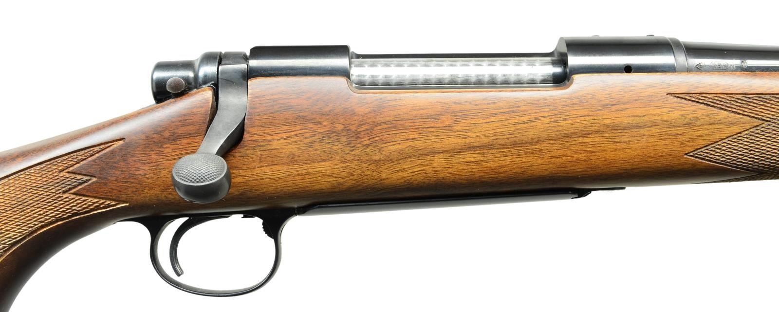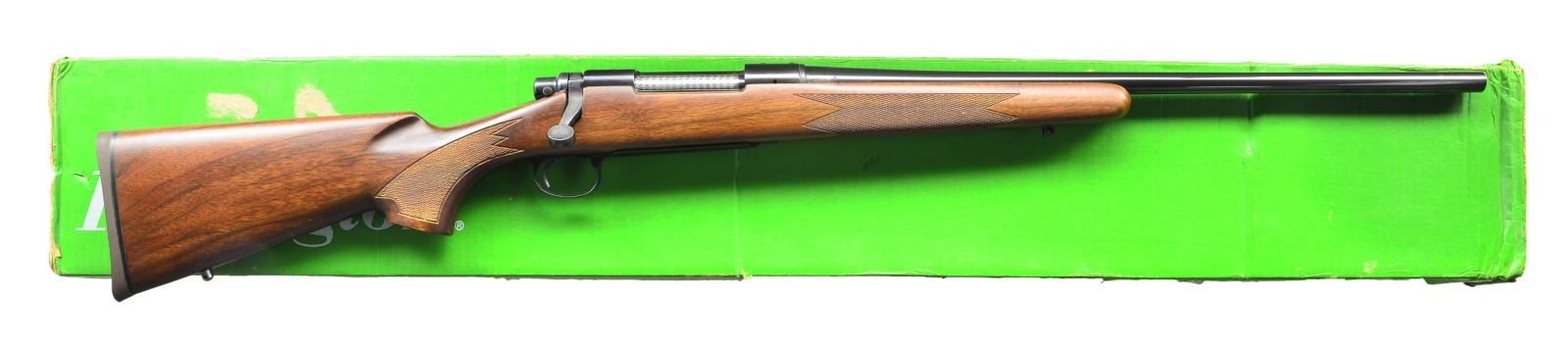 Cal. 7mm Mauser. S# B6308713. Bbl. 22". Mfg. April 1981. Bright blued metal finish w/ beautiful hardwood stock. Checkered forend & pistol grip. Rubber factory recoil pad. Sling studs front & rear. Receiver drilled & tapped for scope bases. No sights. UNATTACHED ACCESSORIES: factory cardboard box & paperwork. CONDITION: all aspects indicate very little use, if any. No visible blemishing on stock. No metal finish wear aside from some extremely light thinning in areas of mechanical intervention. Bright bore w/ strong rifling. (23-148/JZ). MODERN. $800-1,200.
