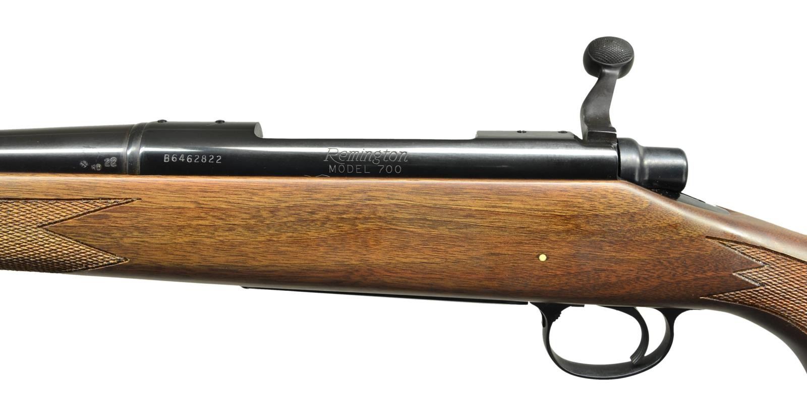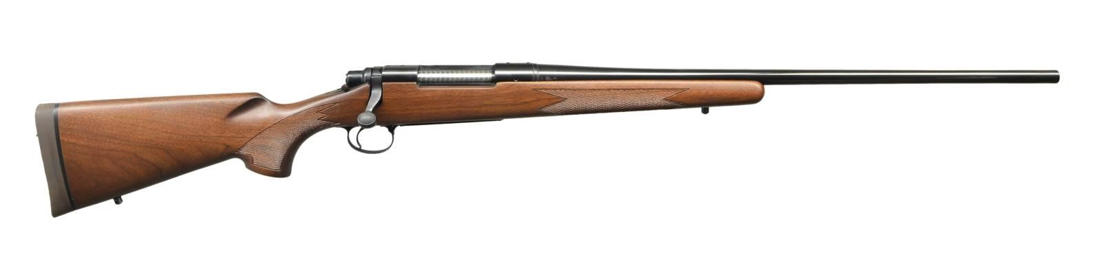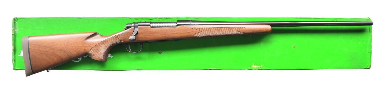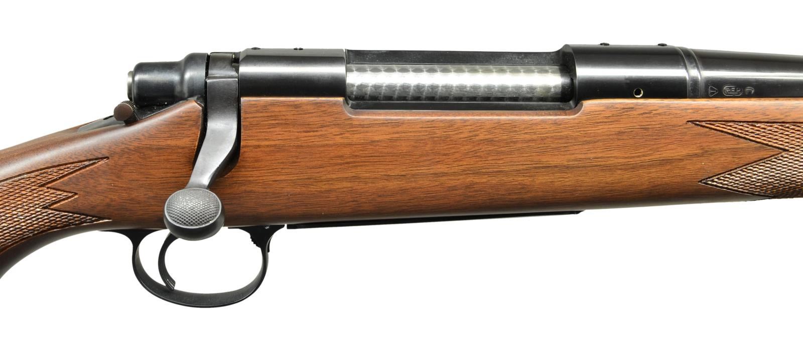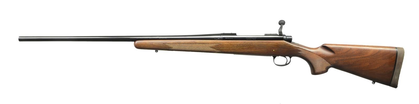 Cal. 300 H&H Mag. S# B6462822. Bbl. 24". Mfg. May 1983. Bright blued metal finish w/ beautiful hardwood stock. Checkered forend & pistol grip. Rubber factory recoil pad. Sling studs front & rear. Receiver drilled & tapped for scope bases. No sights. UNATTACHED ACCESSORIES: factory cardboard box & paperwork. CONDITION: all aspects indicate very little use, if any. No visible blemishing on stock. No metal finish wear aside from some extremely light thinning in areas of mechanical intervention. Still retains factory hang tag. Bright bore w/ strong rifling. (23-150/JZ). MODERN. $800-1,200.