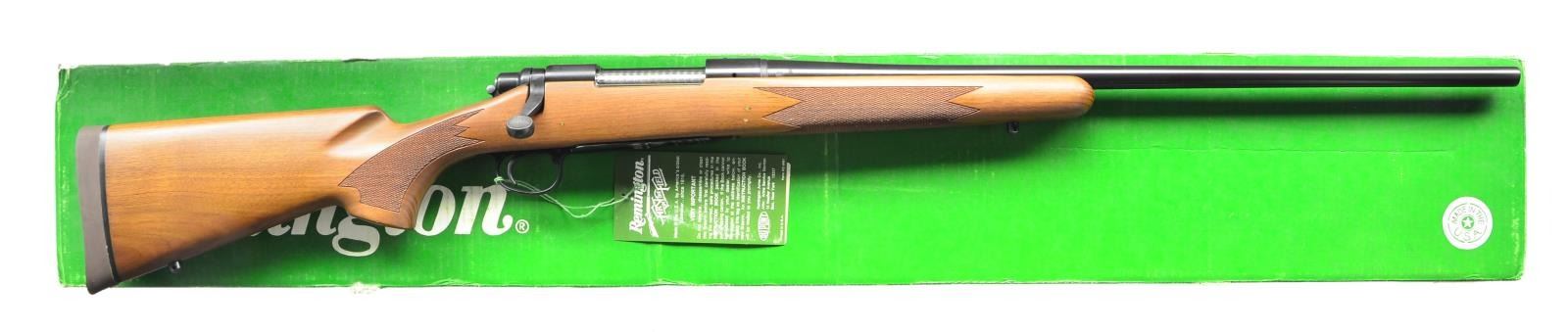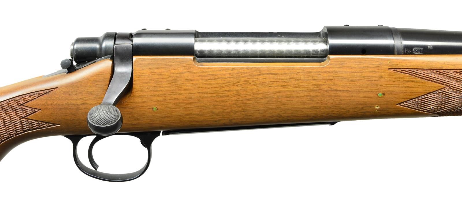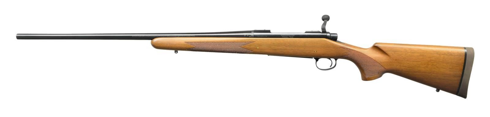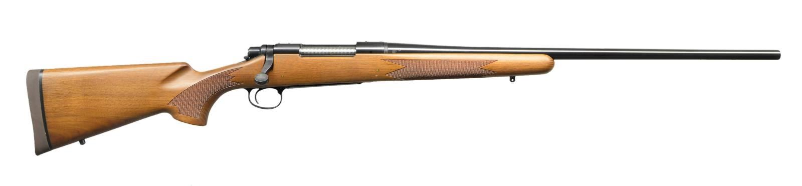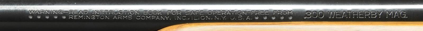 RIFLE. Cal. 300 Wby Mag. S# C6398576. Bbl. 24". Mfg. May 1983. Bright blued metal finish w/ beautiful hardwood stock. Checkered forend & pistol grip. Rubber factory recoil pad. Sling studs front & rear. Receiver drilled & tapped for scope bases. No sights. UNATTACHED ACCESSORIES: factory cardboard box & paperwork. CONDITION: all aspects indicate very little use, if any. No visible blemishing on stock. No metal finish wear aside from some extremely light thinning in areas of mechanical intervention. Still retains factory hang tag. Bright bore w/ strong rifling. (23-152/JZ). MODERN. $800-1,200.