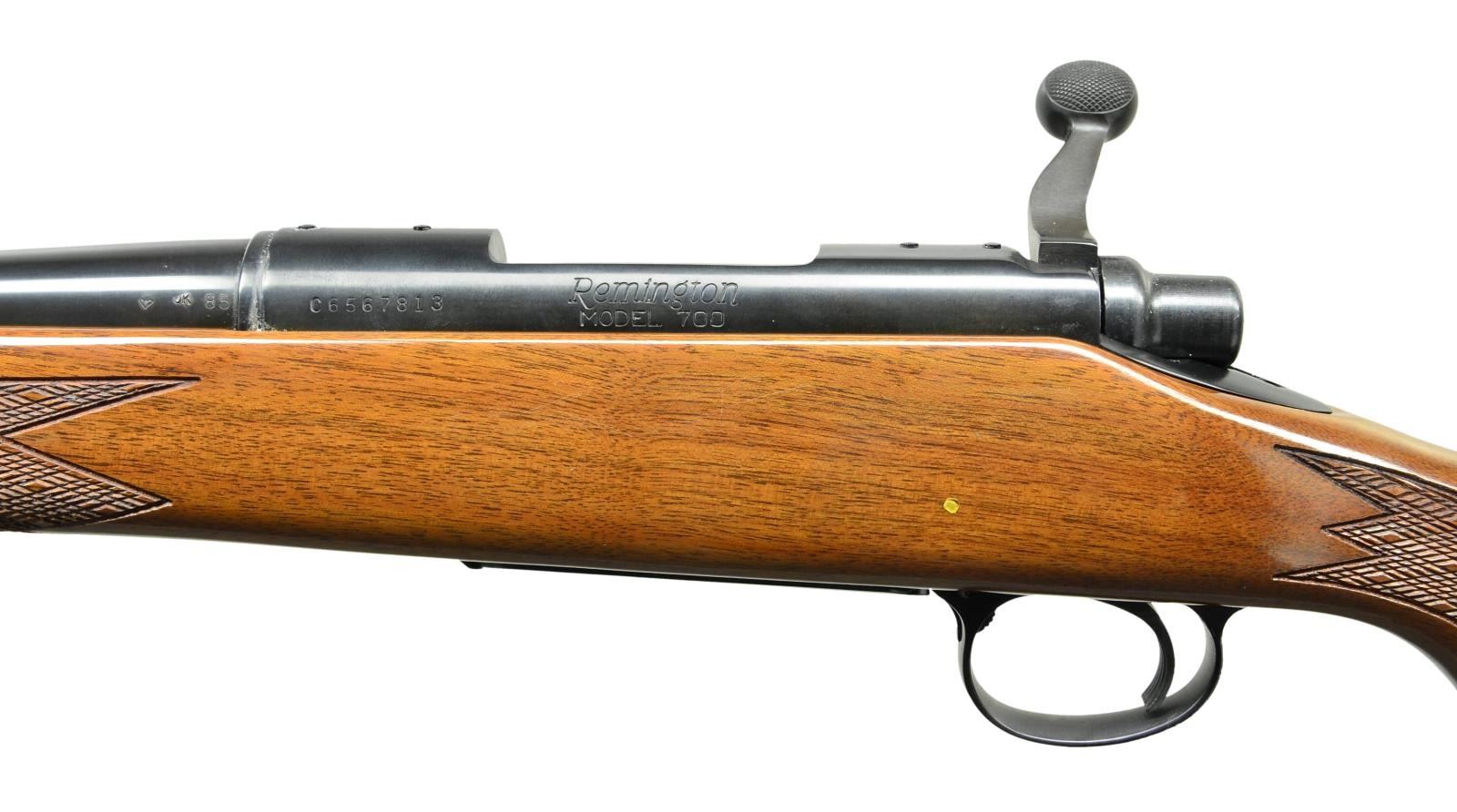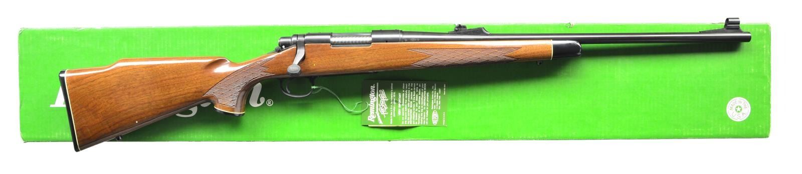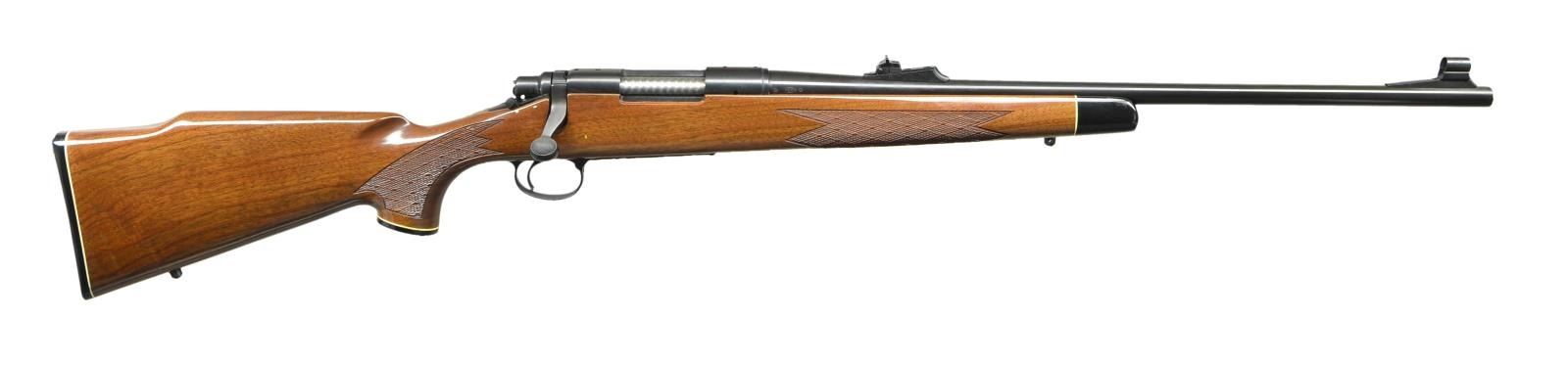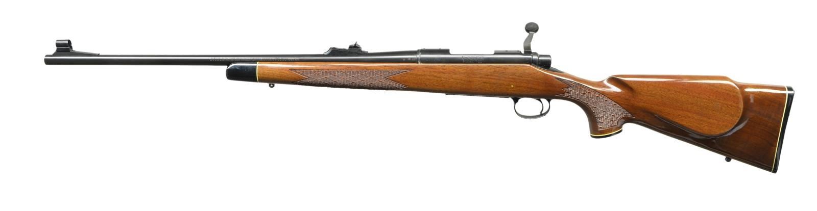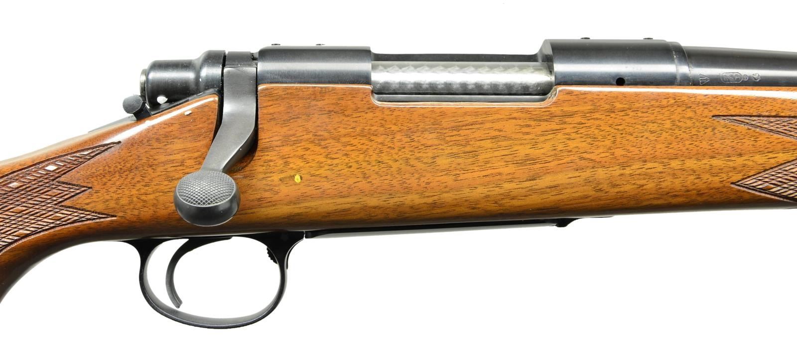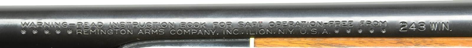 Cal. 243. S# C6567813 Bbl. 22". Mfg. 1990. Blued finish. Monte Carlo style American Walnut stock w/ high gloss finish & fine cut checkering on forend & pistol grip. White spacers w/ black forend, grip cap & butt plate. Sling studs front & rear. Hinged floorplate. Hooded blade front & adjustable rear sights. Receiver drilled & tapped w/ factory filler screws. UNATTACHED ACCESSORIES: factory box. CONDITION: all aspects indicate very little use, if any. Rifle still retains factory hand tag. No visible blemishing on any kind. Bright bore w/ strong rifling. (23-496/JZ). MODERN. $800-1,200.