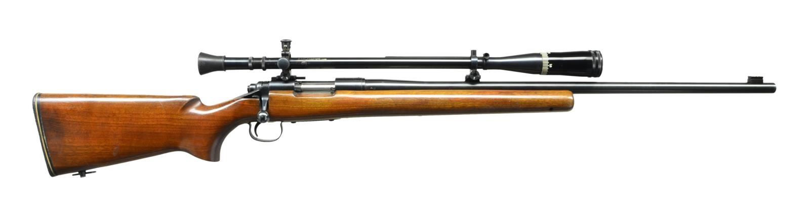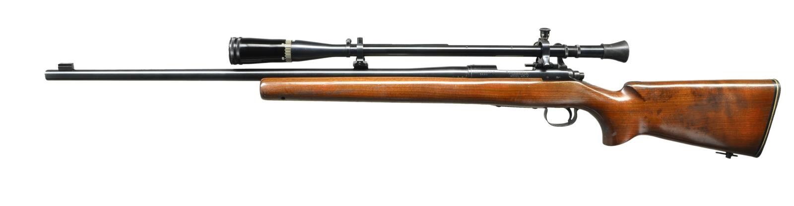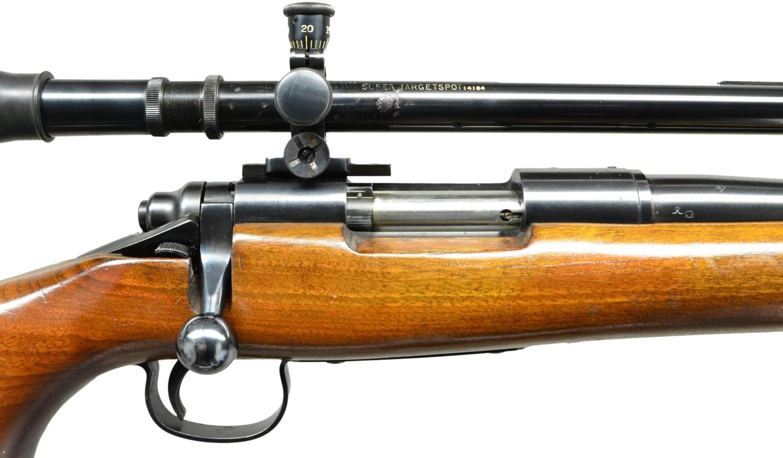 Cal. 22 LR. S# 0682. Bbl. 28". Early mfg. Bbl. code of “DB” Sept of 1955. No iron sights; a target scope block base installed near muzzle & a Lyman 15X Super Targetspot w/ crosshair reticle & slightly cloudy optics is also mounted. Target style wide one piece pistol grip stock w/ accessory rail bottom of forend, sling swivel in toe of butt & Whiteline recoil pad. CONDITION: metal is blued & retains about 90% original finish. Bottom of trigger guard seated with Philips head screws. Stock has a thick added coat of varnish over scattered scratches & light dings. Bore is very good, bright & strongly rifled. (23-754/CW). CURIO. $1,200-1,800.