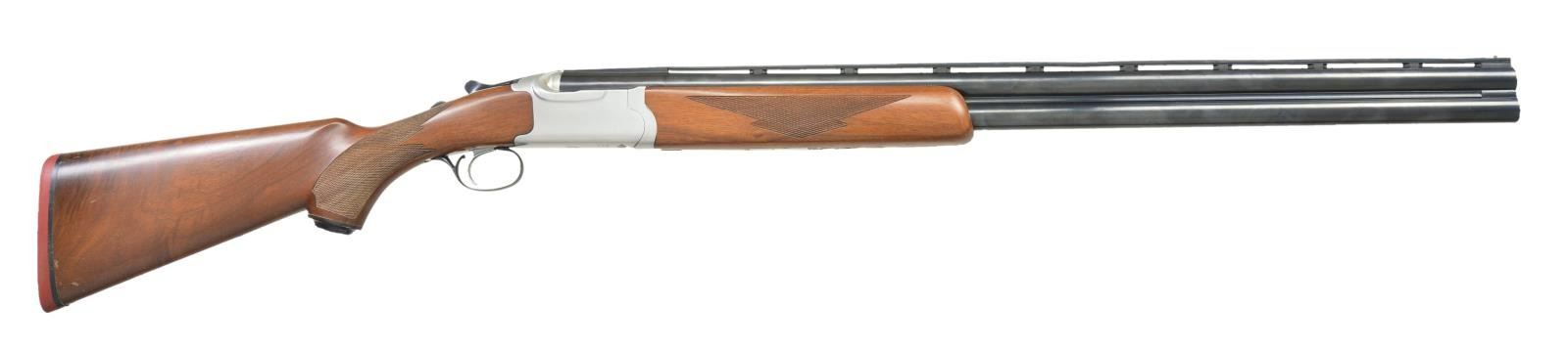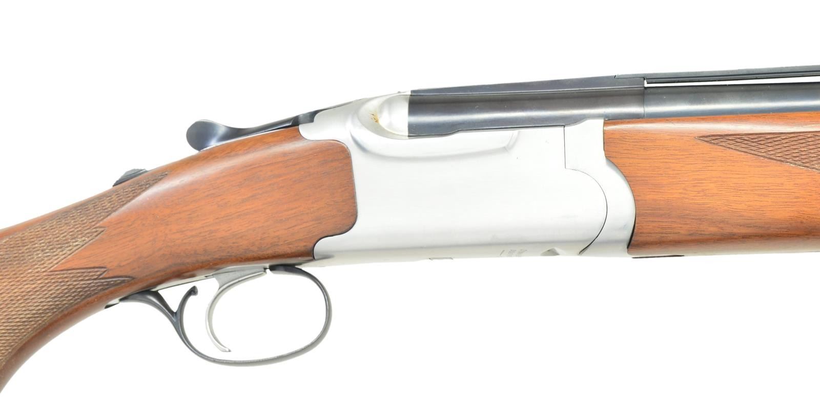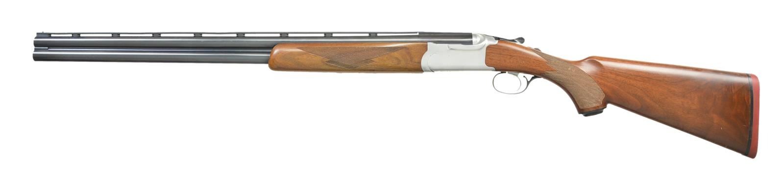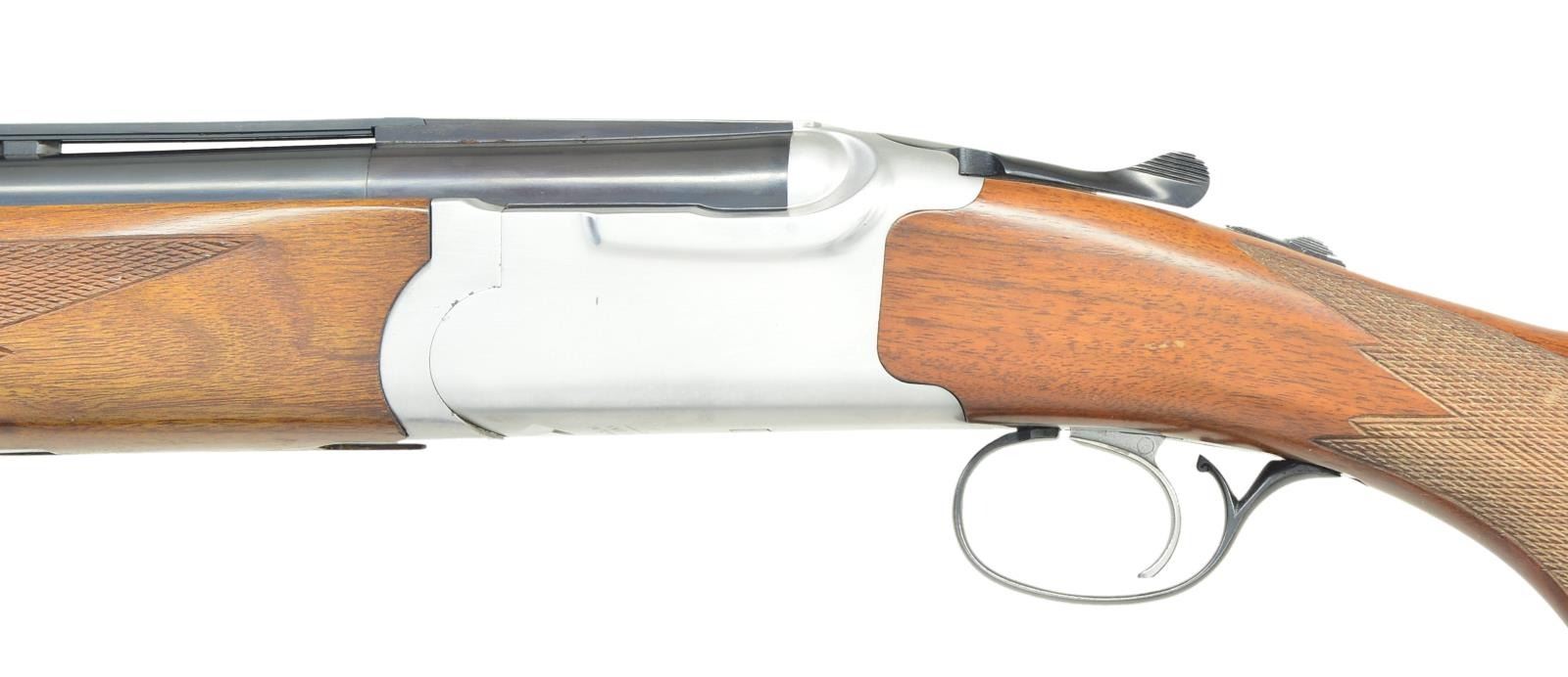 Cal. 12 Ga., 3". S# 410-16238. Bbls. 28" VR choked M&F. Mfg. 1986 (1982-date) w/ stainless single selective trigger, receiver & forend iron; balance blued. Checkered pistol grip stock set w/ grip cap & red pad; neutral cast off, 14" LOP, 1 1/4" DAC plus 2 1/4" DAH. CONDITION: good appearing w/ noticeable handling marks on rear half of comb, rear half of toe line plus abrasions on grip cap. Forend has amateur split (through bottom middle) repair & marks plus 5/32" gap along right side. All checkering panels near excellent. Bbl. rib has 4 dents: 1 1/2", 7" & 12 1/2" from muzzle plus just forward of monobloc. Metal finish is very good to excellent w/ very minimal marks. Near excellent bores. (23-57/NW). MODERN. $700-1,200.