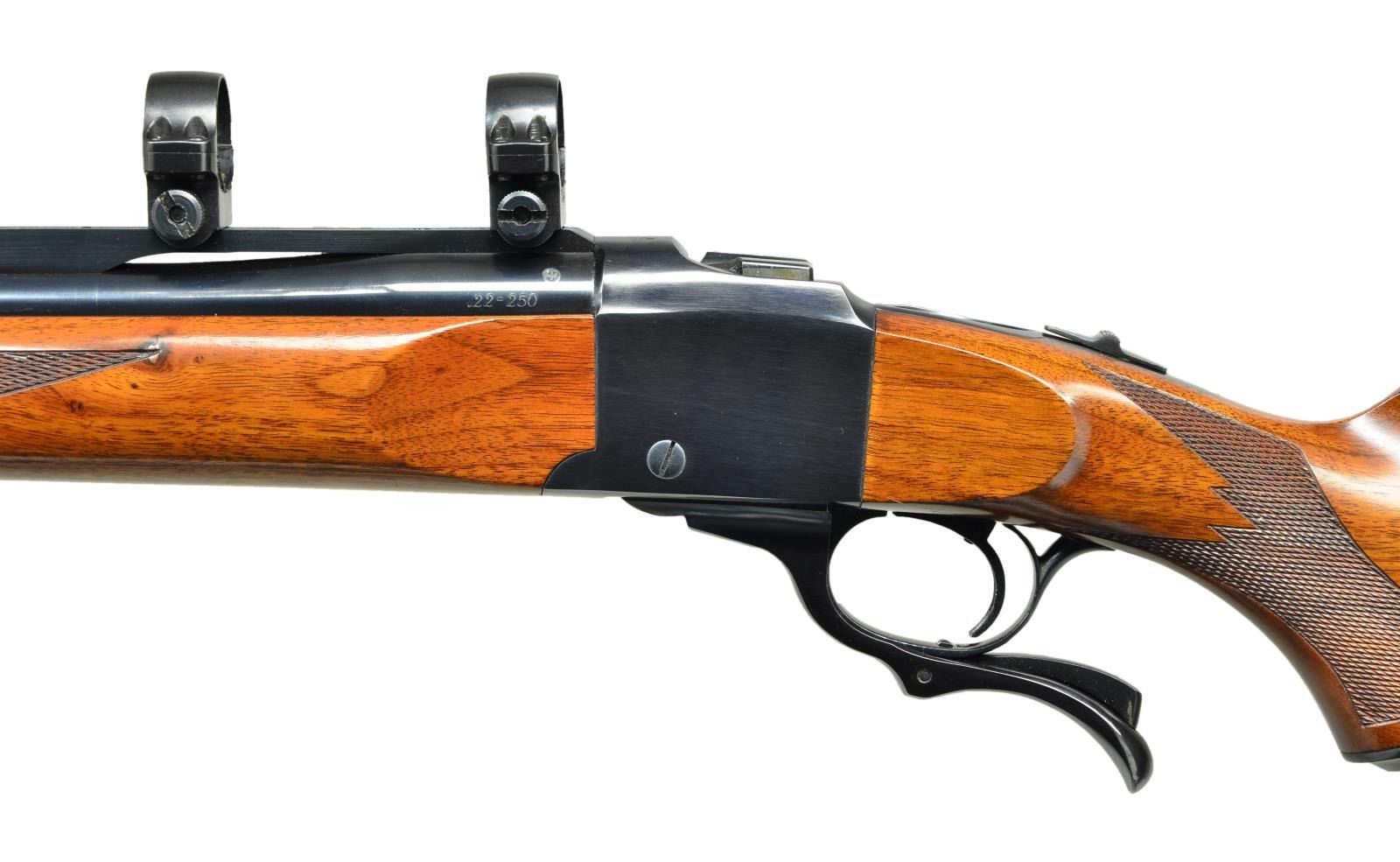 Cal. 22-250. S# 8242. Bbl. 26" w/ Southport markings & quarter rib having factory scope rings. Mfg. 1969 (1967 to date) w/ out S# prefix (1967-1969; S# 1-8437). Beavertail forend w/ early wrap around checkering plus distinctive first production multi point pattern in grip area. Steel grip cap, sling studs & early red Mershon pad having Ruger logo plus rounded edges. Some nice stock figure such as right side of butt. Highly collectable No. 1 w/ out S# prefix; only 8,437 produced. CONDITION: near excellent overall appearance having couple of extremely faint handling marks. Bottom attachment hole of pad has slight marks. Near excellent bore. (23-310/NW). CURIO. $1,000-1,500.