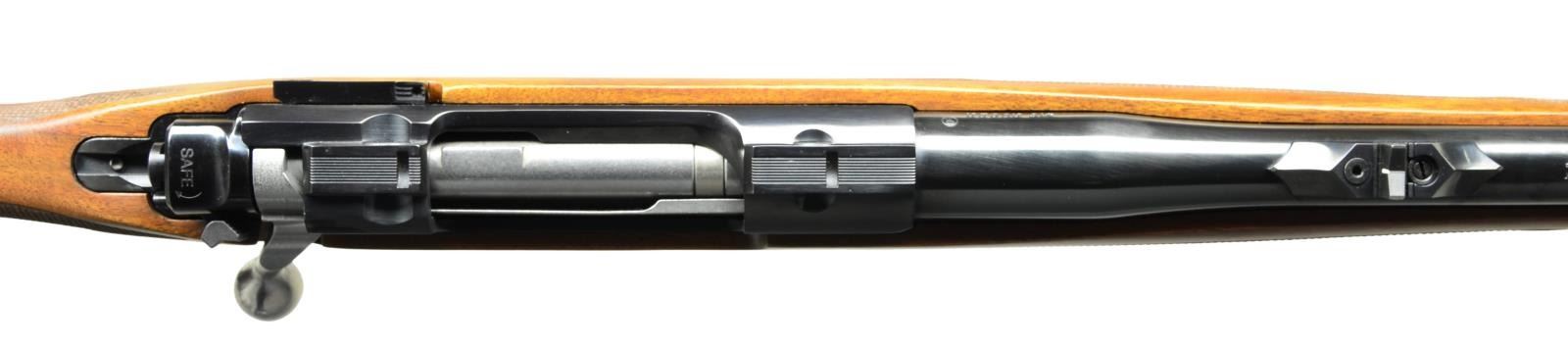 Cal. 416 Ruger. S# 712-37108. Bbl. 23" (24 1/2" including removable factory muzzle brake). Mfg. 2017 as model 37185 in Ruger’s biggest proprietary cartridge based on 375 Ruger which was a joint venture between Hornady & Ruger. The significance of the big Ruger cartridges is that they are designed for standard length actions & duplicate the power of 416 Rigby or 416 Rem Mag. These feats accomplished by having a case equal to diameter of belted magnum but w/out the belt which provides the needed extra case capacity for powder. These 416 cartridges develop 3 1/2 tons of muzzle energy & are totally adequate for any game animal on the face of the Earth. Walnut stock w/ red Ruger pad, grip cap, classic black forend tip, 2 reinforcing crossbolts & sling stud on butt; front stock sling stud position has oval headed Allen screw; front sling attachment incorporated into bbl. band. Deluxe wraparound checkering on forend & standard dual panels in grip area. Blued steel finish throughout w/ finely laser engraved Ruger logo & “RUGER” on hinged floorplate. Receiver machined for Ruger rings, positive 3 position bolt shroud safety & Ruger adj. L6 trigger. Raised base on bbl. having windage adj. jib locked express sight w/ vertical white line, matched w/ banded front sight base having white bead sight that appears to be by NECG (factory was brass). CONDITION: all aspects near excellent including bore w/ unfired appearance. (23-795/NW). MODERN. $1,000-1,700.