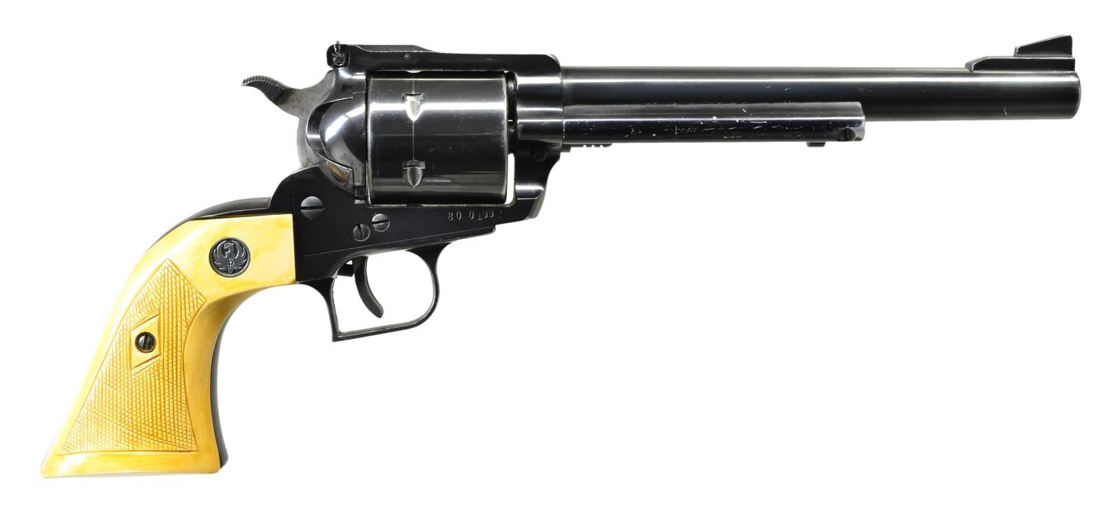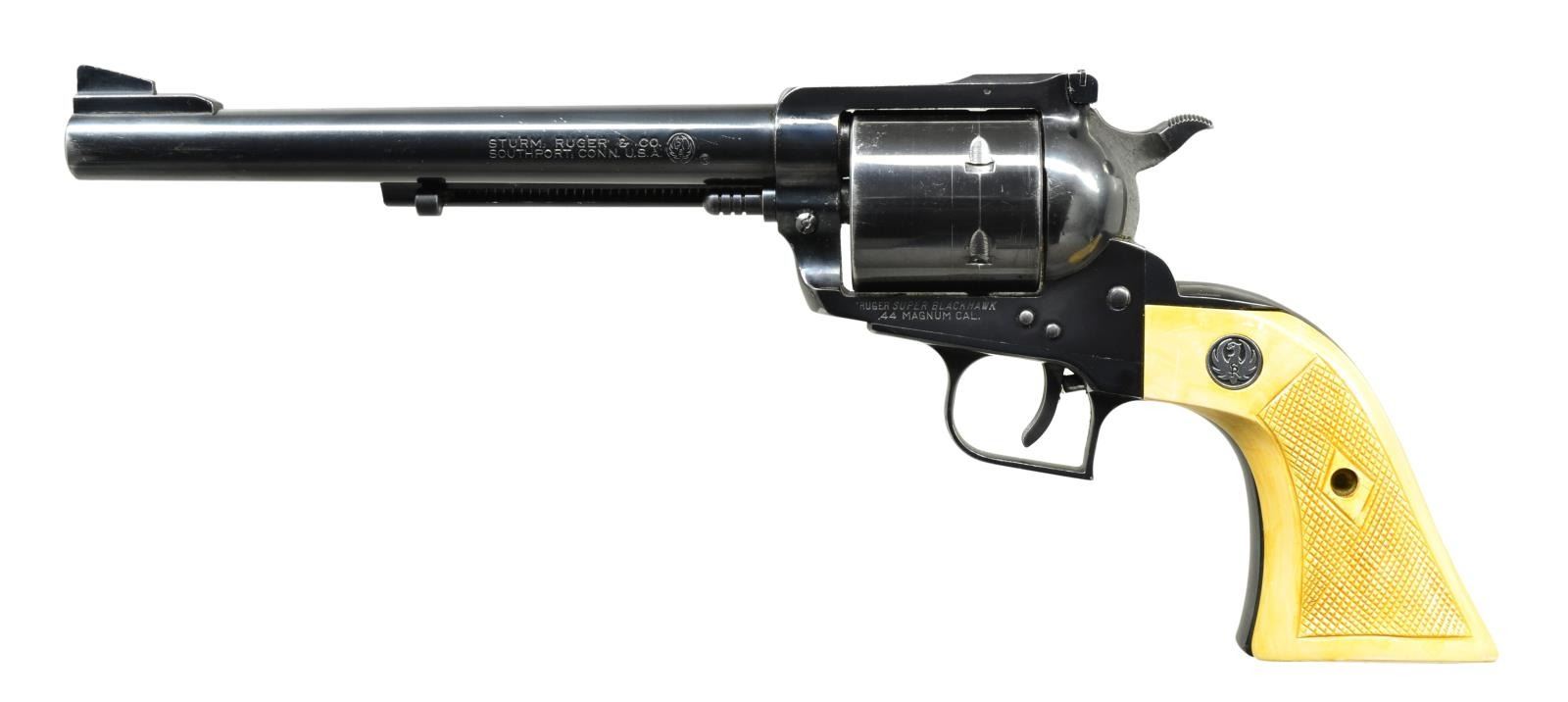 Cal. 44 Mag. S# 80-01992. Bbl. 7 1/2" w/ ramped serrated blade front sight & Ruger adj. rear. Mfg. 1969 w/ alloy ejector housing & eagle logo on bbl. Aftermarket checkered simulated ivory grips w/ Ruger silver medallions. Original lock work w/out factory safety update. CONDITION: good to very good overall appearance w/ holster like high point wear & factory quality refinish. Noticeable marks & wear on ejector housing. Very good grips w/ hobbiest quality checkering. Hammer & trigger engagement flawed, going to full cock noticeably before cyl. is indexed; appears likely top of trigger shortened or damaged plus abnormally light trigger pull. Near excellent bore. (21-4189/NW). CURIO. $350-500.