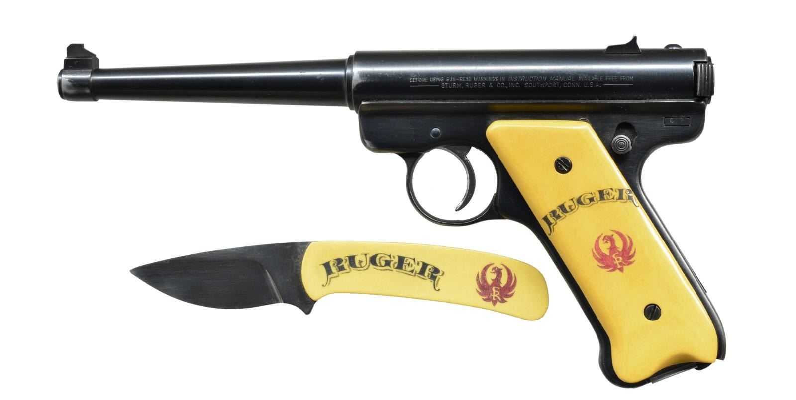 Cal. 22 LR. S# 16-24749. Bbl. 4 3/4" w/ blade front sight & drift adj. rear. Mfg. 1980 w/ chromed trigger. Replacement aftermarket polymer grips w/ Ruger logos. MAGS: 3 very good 10 rd. TOTAL; factory w/ silver base & red eagle, 2 unmarked aftermarket w/ black plastic bases. UNATTACHED ACCESSORIES: good Super Single Six 6 1/2" bbl. box numbered in 60-series w/ 3-1-67 manual . EACHES skinner style knife w/ 2 1/2" blade & slab handles that match pistol grips. CONDITION: good plus general appearance w/ high point holster like wear & random peppery oxidation. Top of front sight file lowered; very good grips & near excellent bore. (21-4202/NW). MODERN. $300-450.