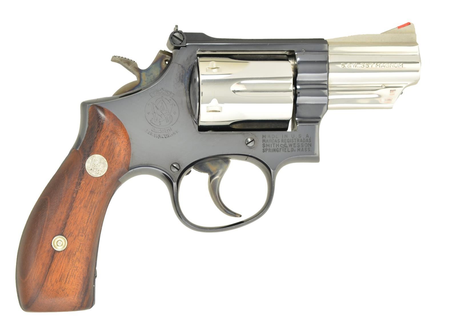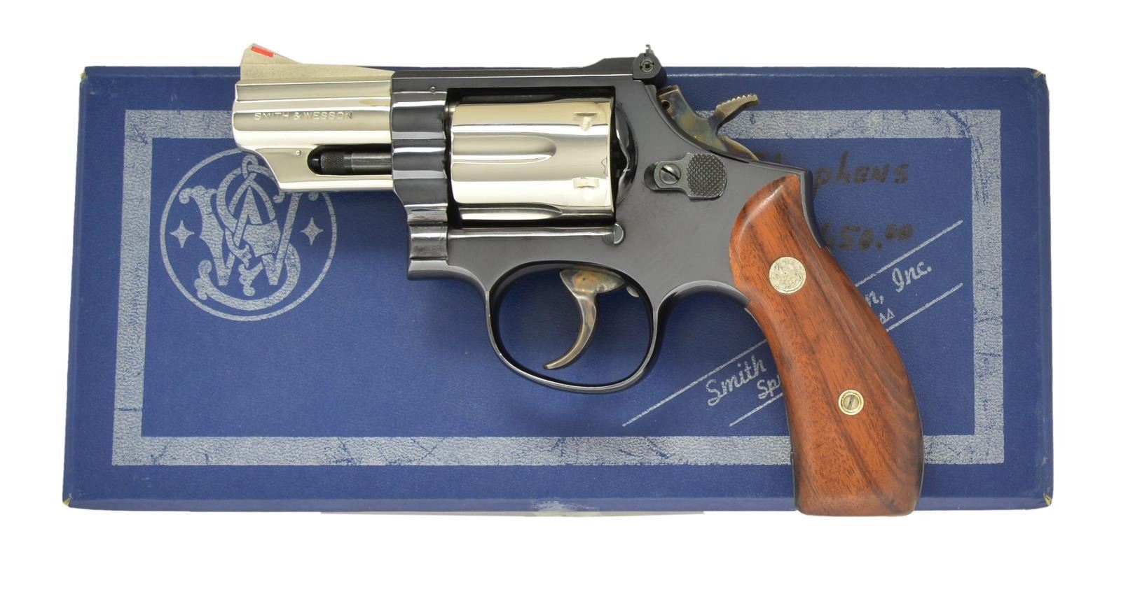 Cal. 357 Mag. S# K684245. Bbl. 2 1/2" pinned nickel w/ Baughman red insert sight & corresponding blued white outlined Micrometer rear. Shipped June 21, 1966 (1955-1999) to Walter F. Stevens Jr Co. of Franklin, OH w/ features described herein; -1 suffix of model number began 1959, -2 started 1961 & 2 1/2" models began 1966 as standard on rnd. butt frame. By references & features, this should be 19-2 but yoke area clearly "19" w/ out trace of dash. Recessed nickeled cyl. having blued extractor & ejector rod. Two toned variation called "Pinto" by collectors; not a S&W designation. Blued rnd. butt frame having smooth Magna grips of dark Goncalo Alves w/ nickeled medallions. .380" Checkered hammer spur & .400" smooth combat trigger; both case colored. UNATTACHED ACCESSORIES: good to very good blue 2 piece box having white end label w/ different S#, marked "SMT" for trigger, "BN" as finish, bbl. of "2 1/2" & front sight as "RR" w/ "WO" box checked. Second preprinted end label white grease pencil marked "2 1/2" plus "NIC" written before pre printed "BLUE". All paperwork & cleaning kit. Factory letter supporting previous information plus copy of original invoice. CONDITION: overall near excellent appearance w/ extremely faint cyl. turn line from functioning; appears unfired having near excellent bore & grips. PPROVENANCE: Estate collection of Fred Inganamort. (22-1519/NW). MODERN. $3,000-4,000.