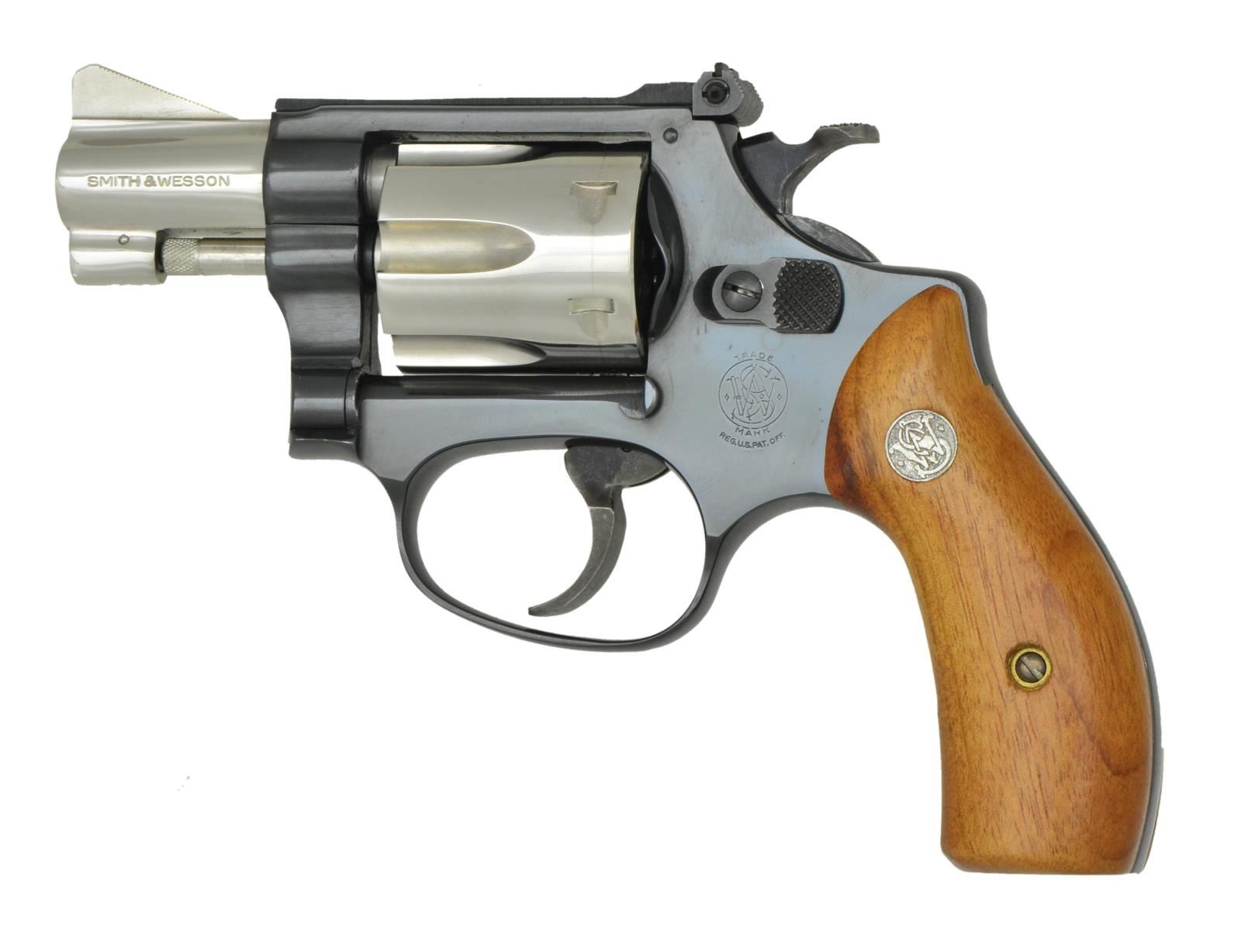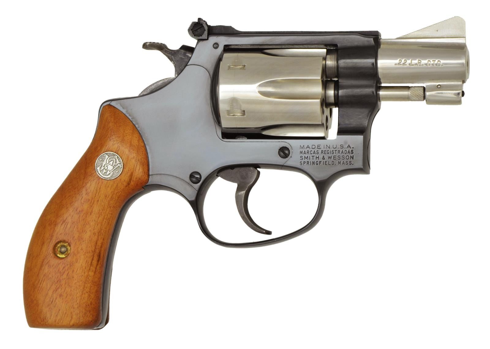 Cal. 22 LR. S# M200000. Bbl. 2" nickel w/ serrated ramped integral blade & corresponding blued Micrometer rear sight. Shipped Sept. 26, 1983 at milestone serial number. -1 suffix of model number began 1960, "M" serial number prefix started 1969 because of 1968 GCA , -2 models began 1988 & Model 34's discontinued 1991. Non pinned bbl., but recessed nickeled cyl. having blued extractor w/ nickeled ejector rod. Two toned variation called "Pinto" by collectors; not a S&W designation. Blued rnd. butt frame having smooth Magna grips of wood appearing to be cherry w/ nickeled medallions. .365" checkered hammer spur & .375" grooved trigger; both case colored. Originally sold to S&W employee (S, Lysik) w/ all blued finish, 4" bbl., & checkered walnut grips. UNATTACHED ACCESSORIES: fair to good (tattered edges) blue 1 piece hinged box having end label marked "SPECIAL" for features, "B" as finish, bbl. of "4" & Spec. Ord. of "M601". Second label on interior w/ finish of "BN" & bbl. having 2 overwritten 4. All paperwork & cleaning kit. Factory letter & copy of original employee invoice supporting above info. CONDITION: overall near excellent appearance w/ very faint cyl. turn line from functioning; appears unfired having near excellent bore & grips.