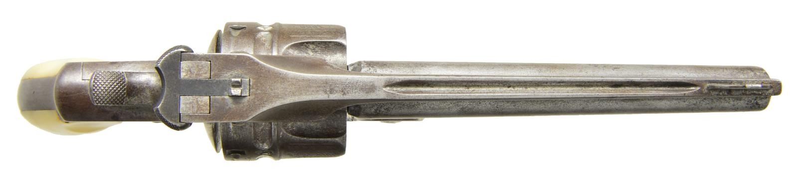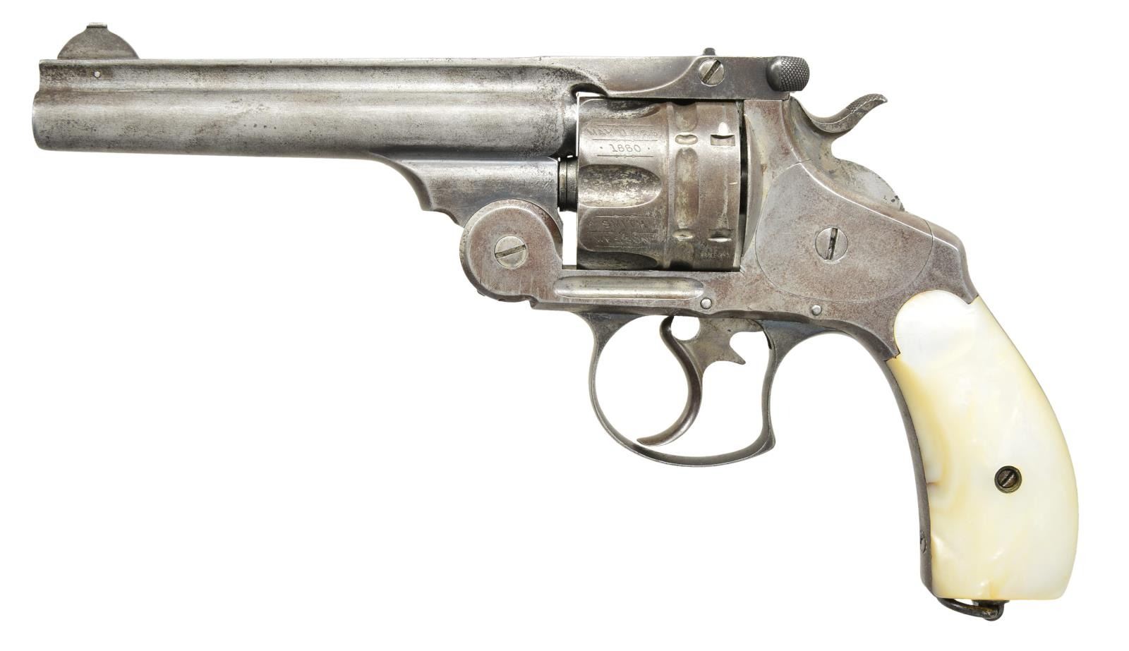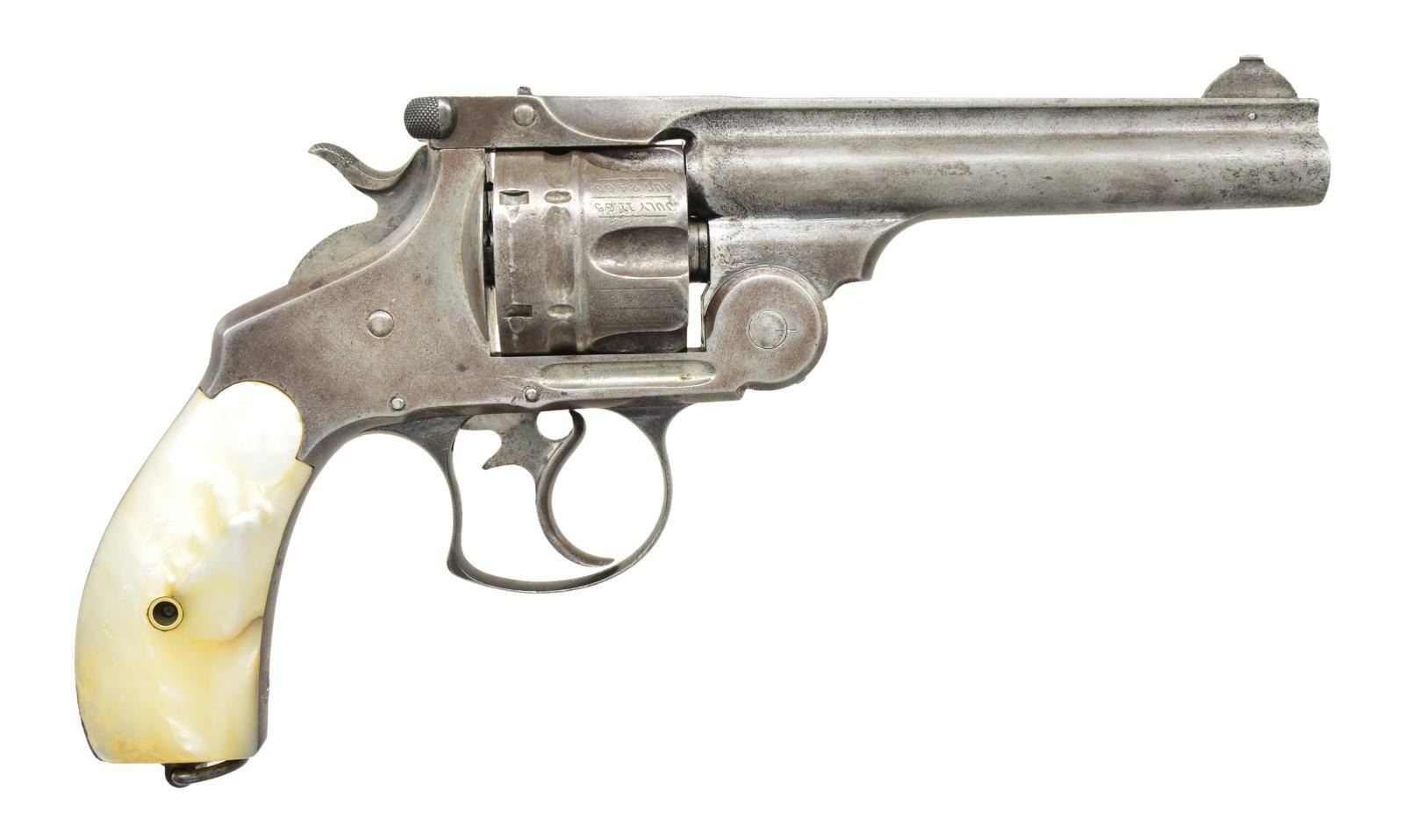 Cal. 44 Russian. S# 9630. Bbl. 5" having matching number to include latch; pinned bead blade sight plus notch rear in bbl. latch. Mfg. 1882-1883 as designed for Russia; order fell through so sales initiated in 1888 literature. Most were sold overseas so this is especially rare in the US. Main features are singular 5" thinner bbl. offering & various lightening cuts to reduce weight & improve balance. Only 1,000 produced from S# 8900-10100; mostly with nickel finish. Bbl. rib grooved along w/ both sides of frame under cyl.; bbl. patent dates moved to spaces between flutes of reverse rebated (also to reduce weight) matching numbered cyl. having double cocking notches. References state this model has internal lightning cuts as well; appears inside of frontstrap reduced plus thin backstrap. Because it has lanyard ring where S# would normally be located, S# is on lower left front side of frame under grip as w/ other observed lanyard loop Favorites. Most any grip material offered, but most examples seem to be pearl like this revolver; plain w/ out medallions. As this revolver was very desirable & innovative for its time, many were sold to prominent foreign figures much like the special Colt Gen. Patton carried. CONDITION: good general appearance w/ minimal nickel finish remaining; grey / brown patina tone w/ minimal light pitting. Proper very smooth action functioning w/ tight lock up. Noticeable slot damage to mainspring strain screw, & slight damage to sideplate screw. Mainspring appears to be late factory replacement. Fair to good bore w/ wear & scattered pitting. (01-22117/NW). ANTIQUE. $2,000-3,000.