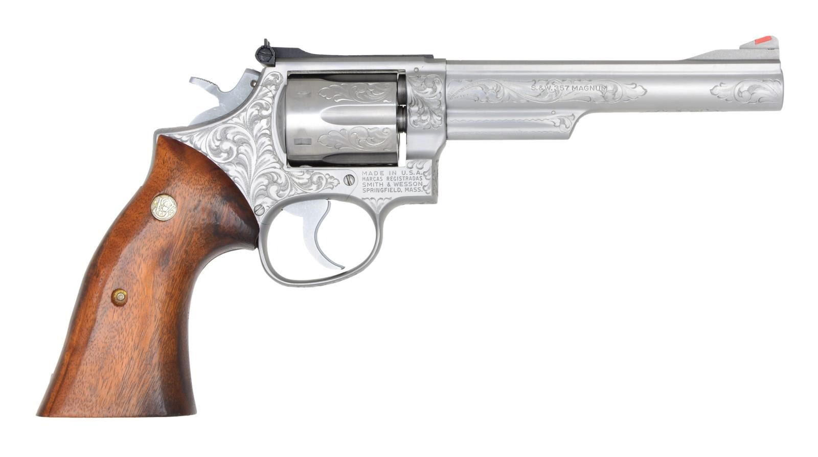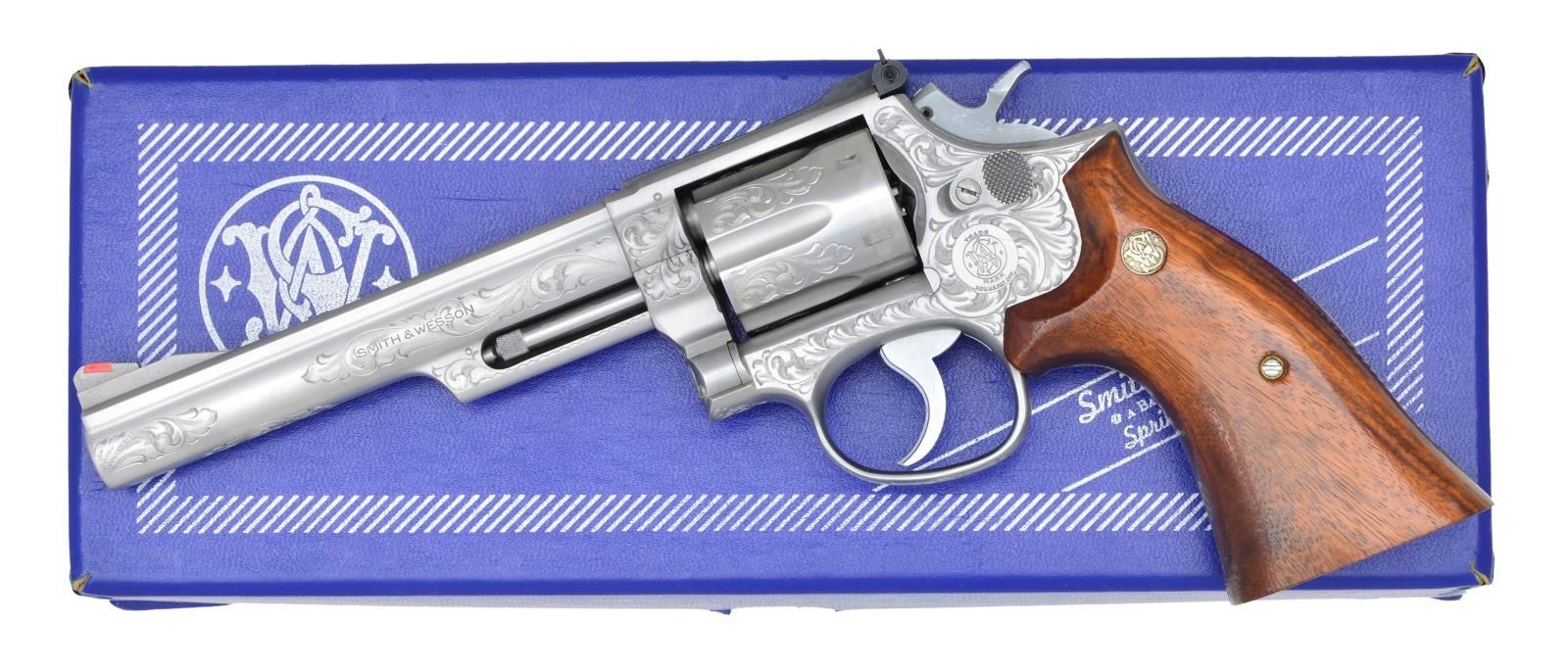WESSON 66-1 WITH ORIGINAL BOX. Cal. 357 Mag. S# 57K7705. Bbl. pinned 6" ribbed w/ shrouded hand ejector. Serrated red insert ramp front sight & adj. target rear sight. Three screw stainless square butt K target frame w/ attractive foliate scroll engraved coverage. Recessed 6 shot fluted cyl. Checkered semi-target hammer. Serrated trigger. Smooth S&W medallion target walnut stocks. UNATTACHED ACCESSORIES: original box w/ paperwork. CONDITION: all aspects like new w/ an extremely faint dragline & some minor handling marks. Bright bore, sharp rifling. Appears unfired. PROVENANCE: Estate collection of Fred Inganamort. (22-1533/ZAL). MODERN. $1,800-2,500.