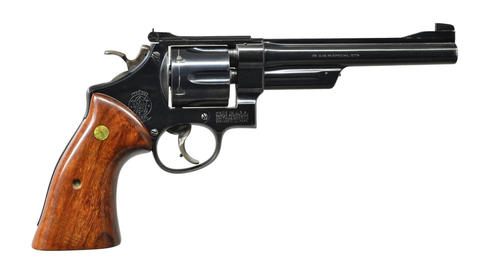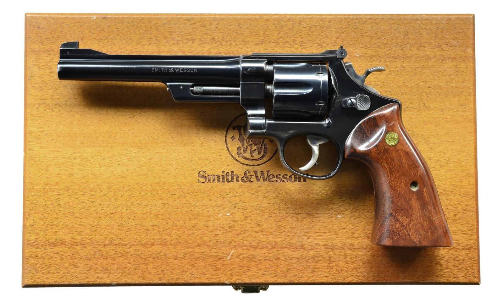 Cal. 38 Spl. S# S139944. Bbl. 6 1/2" pinned w/ Patridge front sight & Micrometer adj. rear. Mfg. 1955 (1950-1957; 6,039 units w/ S# 75000-261999). Blued 5 screw N frame w/ case colored target trigger having added over travel stop & target hammer. Matching numbered bbl., cyl. & extractor. Smooth walnut target grips w/ thumb recess. Often referred to as Pre Model 23 having short throw hammer & polished finish along w/ S&W logo on sideplate. UNATTACHED ACCESSORIES: modern S&W mahogany case w/ logo on lid & dark blue padded interior suitable for any shape of firearm. CONDITION: cyl. turn line, thinning on trigger guard & occasional random light mark. Function wear on trigger, hammer & ejector rod. Slight thinning at muzzle & visible line where sight base meets rib. Refinished grips w/ very good appearance but slight compromise to edges & contours. Near excellent bore. (21-4205/NW). CURIO. $900-1,400.