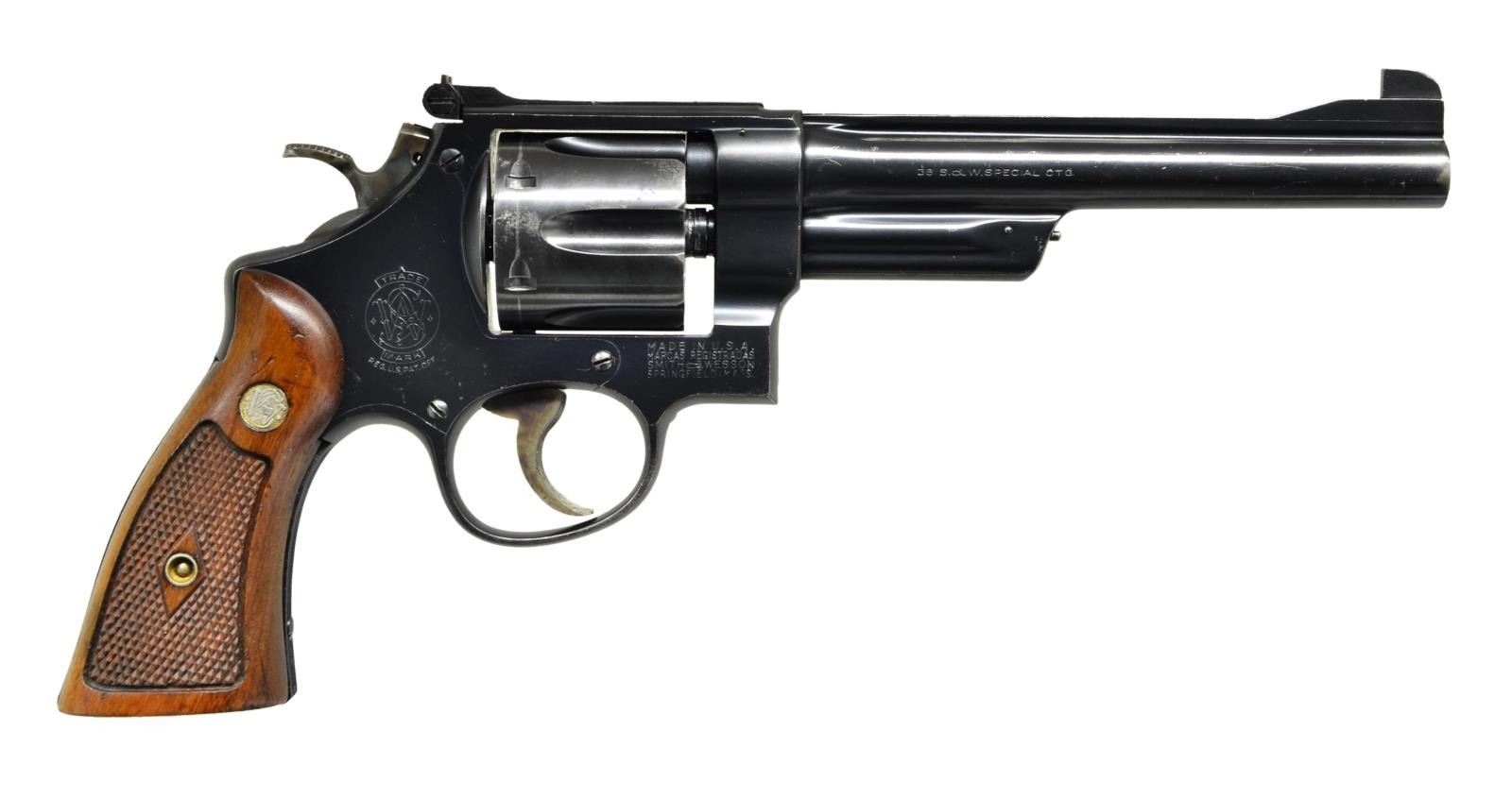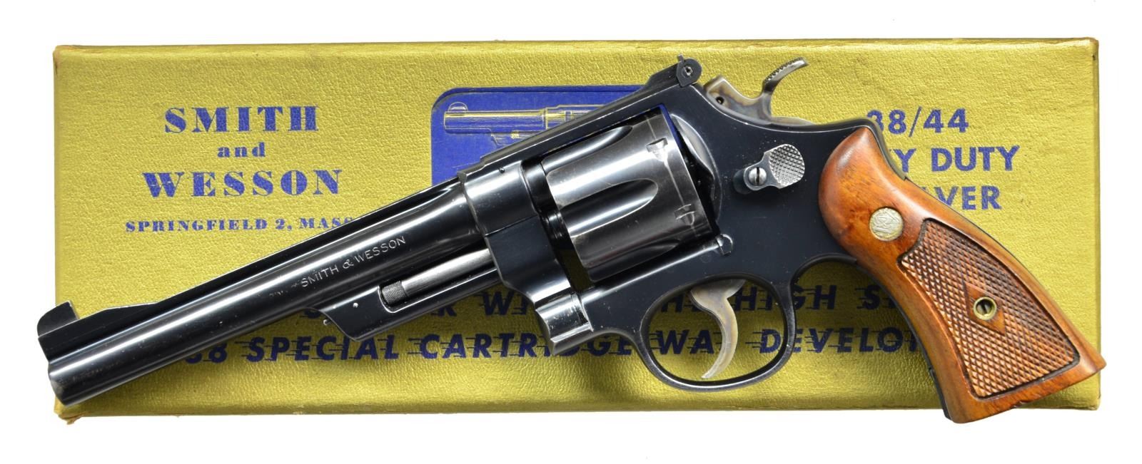 REVOLVER. Cal. 38 S&W Spl. S# S93824. Bbl. 6.5". Mfg. 1952-1953. 5 screw double action revolver built on the square butt N frame. Fluted, 6 shot cylinder. Matching numbers on frame, barrel, cylinder & ejector. Ribbed top strap & barrel. Patridge front sight & micrometer click adjustable rear sight. Shrouded extractor. Optional .500" checkered target hammer spur. Knurled extractor rod. 6-groove serrated backstrap & forestrap. Single diamond checkered grips w/ S&W medallions. Right grip stamped inside matching frame. UNATTACHED ACCESSORIES: Gold S&W box w/ steel corners. (Non-matching). CONDITION: blued finish complete & consistent w/ some thinning at muzzle, some small tiny scratches on both sides of the barrel w/ a drag line on cylinder. 1 chamber slightly out of time, so close that normal operation will easily overcome it. Grips retain strong, sharp checkering w/ some tiny impressions at edges. Bright bore w/ strong rifling. (22-6079/JZ). CURIO. $1,000-1,500.