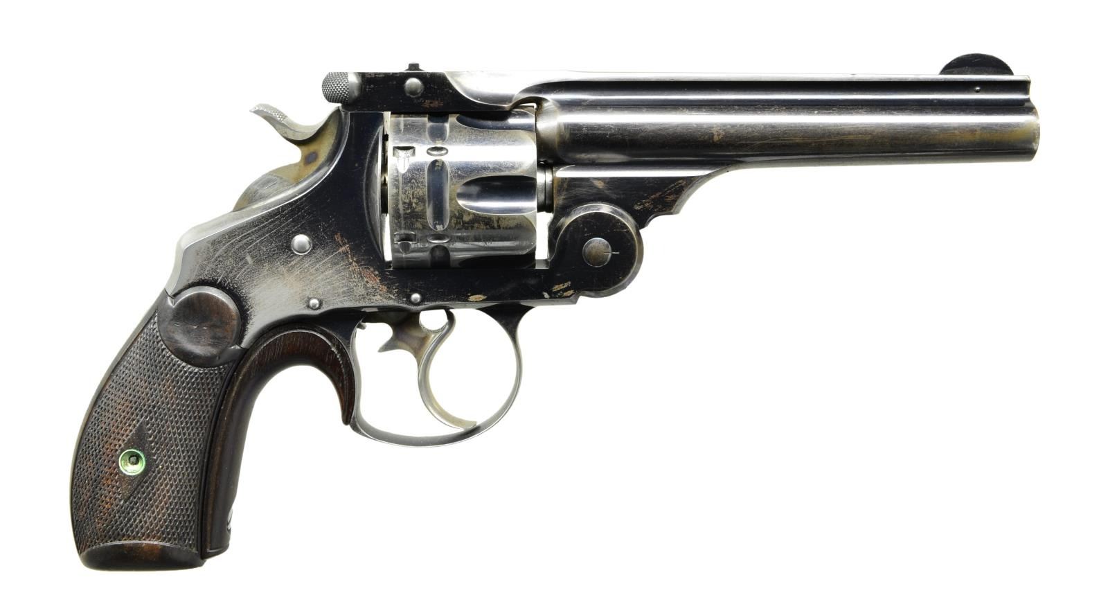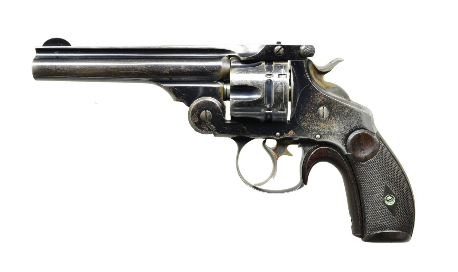 Cal. 44 S&W Russian. S# 8606. Bbl. 5". 1881-1913. (All frames manufactured prior to 1899). Blued finish. 6 shot fluted cylinder. Front blade & rear notch sights. Tip up action. Checkered hammer spur. Checkered hardwood single diamond grips. Matching numbers on frame, cylinder & right grip. CONDITION: finish coverage is strong on the barrel & frame from the rear of the cylinder, forward, & thins as you move rearward, devoid of any remaining finish by the time you reach the pistol grip. Some scratching on right side below hammer. Timing appears correct. Grips are in beautiful condition w/ only a few small impressions. Bore is quite bright w/ strong rifling. (01-22626/JZ). ANTIQUE. $1,000-1,500.