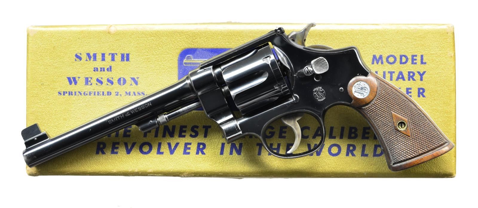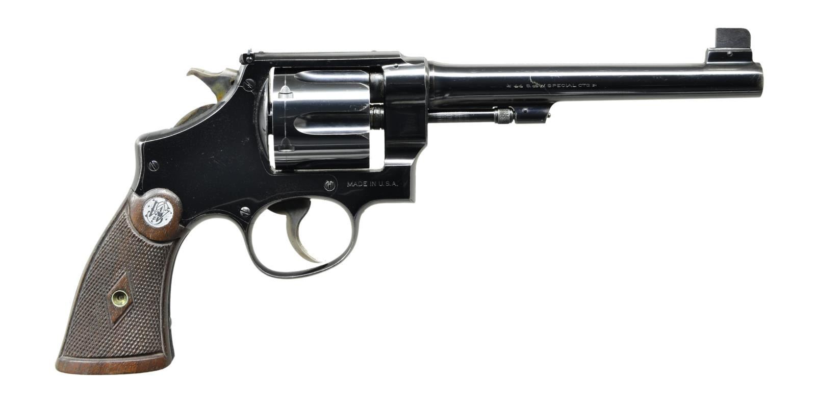 Cal. 44 S&W Spl. S# 34082. Bbl. 6.5". Mfg.1930. Blued finish. 5-screw double action revolver built on the square butt N frame. Matching numbers on frame, barrel, cylinder & ejector. While it is noted that the few Target Models actually manufactured w/ the 6.5" barrel often had a shrouded extractor housing, our sources indicate that since they were built simultaneously w/ the 2nd Models, often overlapping, some utilized the earlier barrels. 6 shot fluted cylinder measuring 1.57". Round, pinned 6" barrel, numbered to frame & cylinder. Tall patridge front sight & adjustable rear target sights. Frame has 6 line serrated backstrap & forestrap. Front sight pinned on raised boss. Rounded rear leaf contoured to top strap. Hammer measures .260" in width. Small S&W Trademark on left side. Barrel marked "Smith & Wesson" on left side & " 44 S&W Special Ctg" on right. Factory refinish date stamp on frame under left grip panel marked; "10 53". Single diamond checkered grips w/ silver S&W medallions at top. Right grip numbered to frame. UNATTACHED ACCESSORIES: factory S&W gold box w/ steel corners. (Non matching). CONDITION: blued finish is complete & consistent. Some thinning at muzzle, on high spots w/ thin drag line on cylinder. Small scratch over lettering on right side of barrel. Appears to have been reblued October 1953 based on markings under grips. Grips in very nice condition w/ sharp checkering Right grip numbered to frame has 2.5" crack visible from inside. Medallions are clear & crisp. Bore is bright w/ strong rifling. (22-3074/JZ). CURIO. $1,000-1,500.
