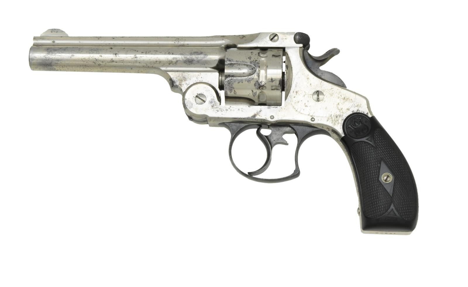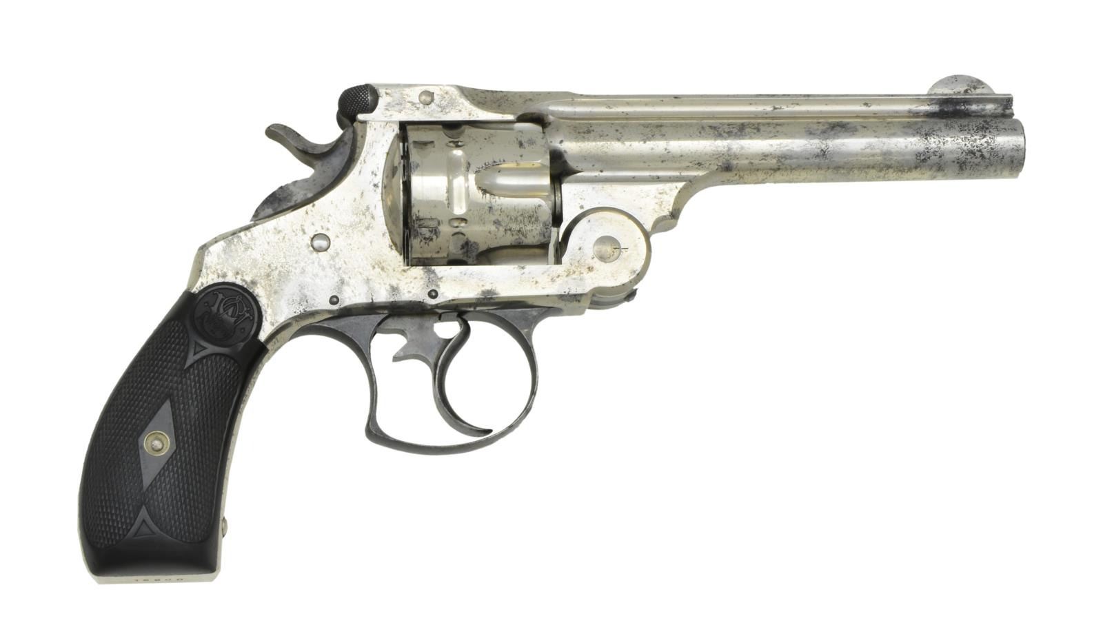 Cal. 44 S&W Russian. S# 18900. Bbl. 5". 1881-1913. (All frames manufactured prior to 1899). Nickel plated finish. 6 shot fluted cylinder. Front blade & rear notch sights. Tip up action. Checkered hammer spur. Checkered black hard rubber single diamond grips. Matching numbers on frame, cylinder & right grip. CONDITION: finish coverage is quite complete though some spots of thinning are scattered over entire piece. Timing appears correct. Grips are in nice condition w/ only a few small impressions. Bore is quite bright w/ strong rifling. (01-22623/JZ). ANTIQUE. $1,000-1,500.