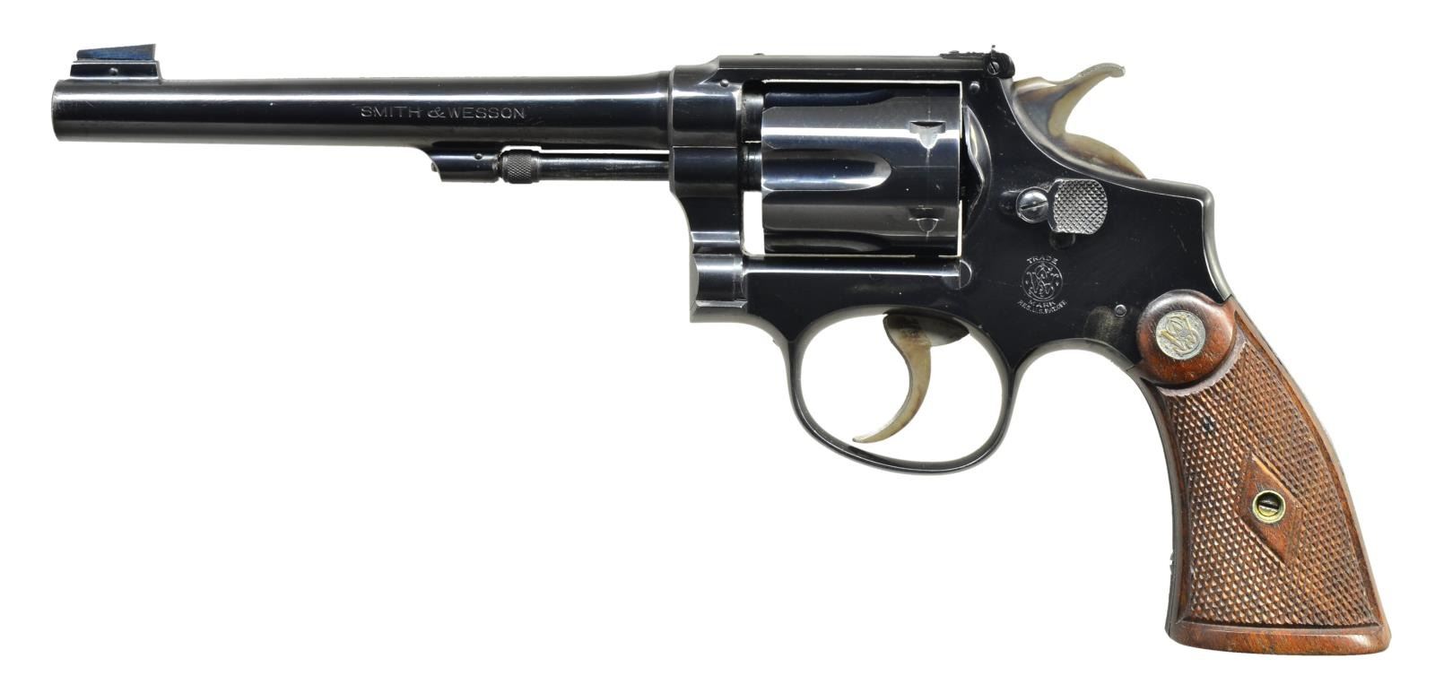Cal. 22 LR. S# 657786. Bbl. 6" pinned w/ replacement pinned factory blade having undercut squared profile; opposing screw adj. rear sight contoured to top strap. Blued 1st model mfg. 1931-1940 w/in M&P 1905 4th change series (S# 632124-682419); 19,500 units. Case colored standard grooved trigger & long action hammer. Diamond center checkered service grips w/ matching stamped S#. Matching numbered bbl., cyl. & extractor. CONDITION: very faint cyl. turn line & freckled section on cyl. plus spot of finish loss on left side of frame by rebound slide pin. Slight thinned freckled area at lower rear of 4 screw sideplate. Slight peppery oxidation on lower sides of bbl. near ejector rod. Balance of bluing very good plus. Near excellent bore & grips. (21-4190/NW). CURIO. $600-800.