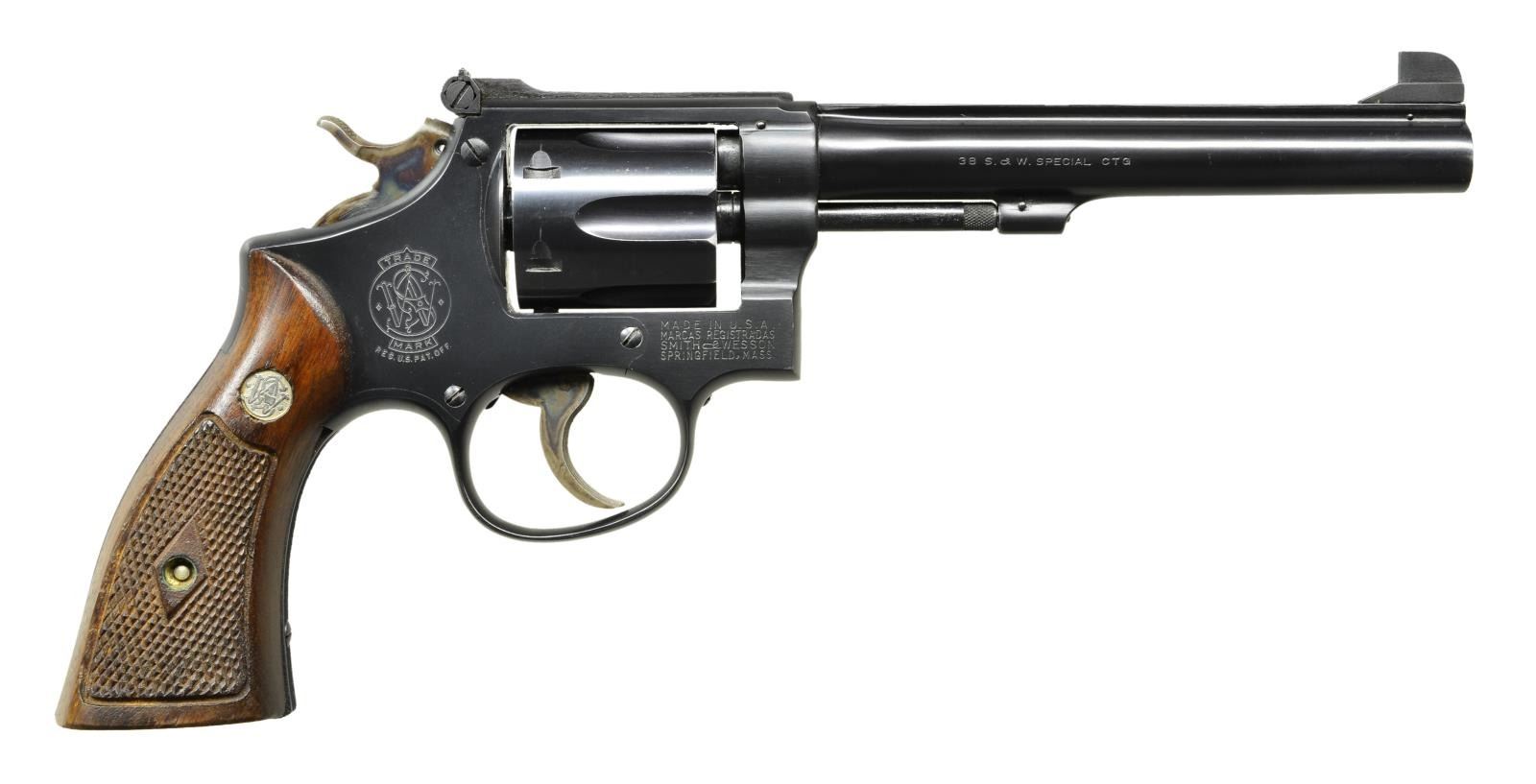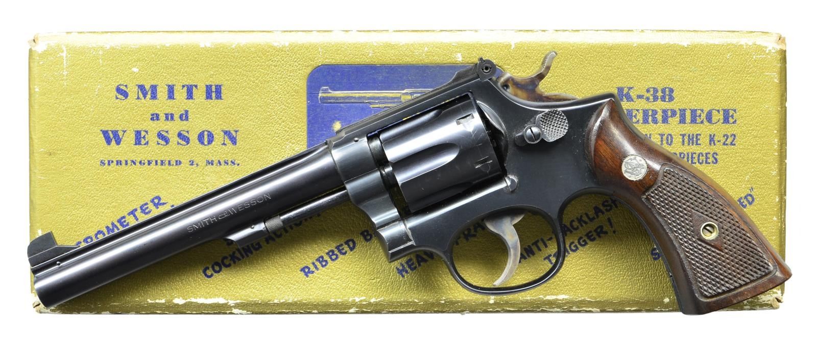 Cal. 38 S&W Spl. S# K33794. Bbl. 6". Mfg 1946-1957. Patridge front sight w/ micrometer click adjustable rear sight. 6 shot fluted cylinder. Thin serrated top barrel & backstrap rib. Blued finish. Checkered hammer spur & cylinder release. Thin, serrated trigger. Serrated front & backstraps. Checkered single diamond grips w/ S&W medallion. UNATTACHED ACCESSORIES: matching gold factory box w/ steel corners. CONDITION: dark blue finish is complete & consistent, enjoying full coverage w/ minute thinning at muzzle & very thin drag line on cylinder. Grips in nice condition w/ some sign of use such as rounded checkering & a few impressions w/ well defined medallions. Timing appears correct. Bright bore w/ sharp rifling. (22-5339/JZ). CURIO. $700-1,000.