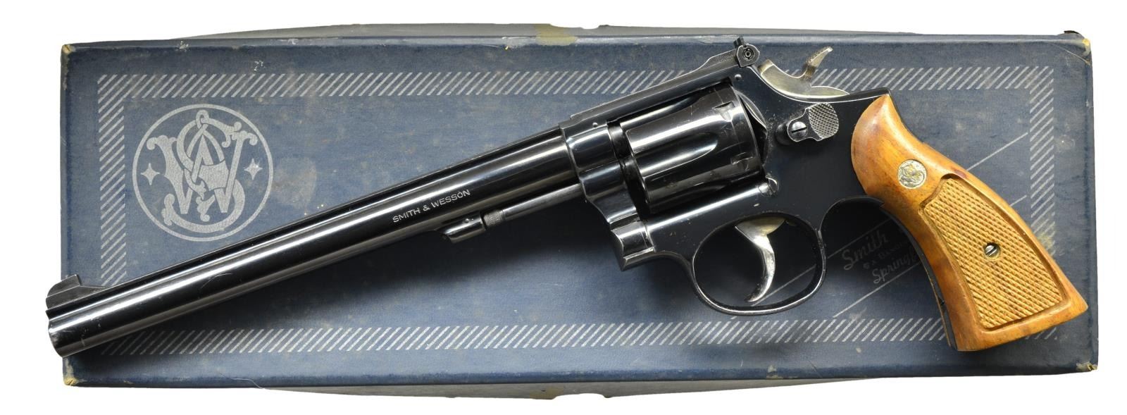 Cal. 22 LR. S# 5K10725. Bbl. 8 3/8" pinned w/ Patridge front sight & Micrometer adj. rear. Mfg. 1973 w/ recessed cyl. & checkered walnut Magna grips (not numbered). Reshaped & polished target trigger having smooth contoured shape; polished sides of standard hammer. UNATTACHED ACCESSORIES: fair to good 2 piece box w/ slight mold spots & renumbered label. Factory paperwork. CONDITION: good plus appearance w/ spots of cleaned oxidation on cyl., hammer & trigger. Light marks on bbl. near muzzle. Peppery oxidation on edge of trigger guard. Near excellent bore & grips. (21-4218/NW). MODERN. $600-800.