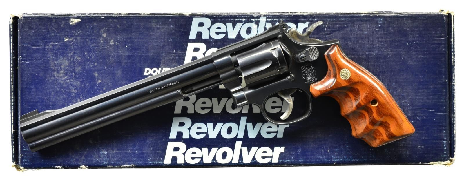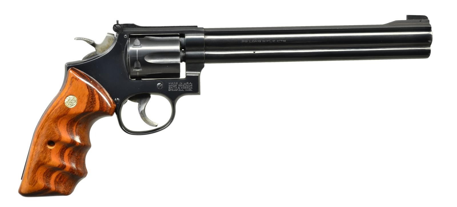 Cal. 22 LR. S# BEF0706. Bbl. 8 3/8" full lug w/ Patridge front sight & Micrometer rear. Mfg. approx. 1989; grips dated SEP 15, 1989. Blued w/ recessed cyl. & case colored target trigger & hammer. Smooth Goncalo Alves finger grooved combat grips w/ speed loader cutout. Premium features of long bbl. & target features. UNATTACHED ACCESSORIES: very good matching blue 1 piece box (back corner broken) w/ packaging to include tool kit. CONDITION: cyl. turn line & slight firing residue along w/ function wear on ejector rod. Very faint beginning thinning on some high points & lower front of frame. Overall very good to excellent appearance w/ near excellent bore & grips. (21-4220/NW). MODERN. $800-1,200.