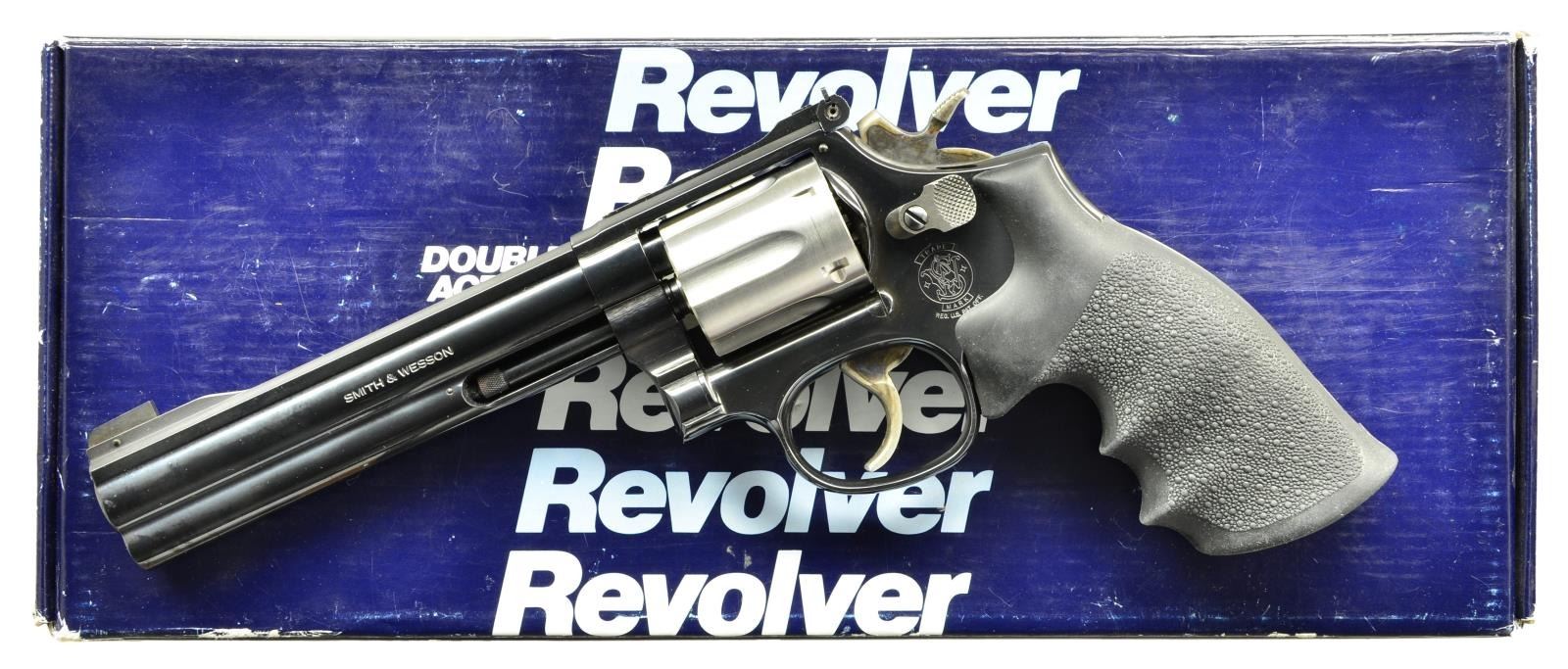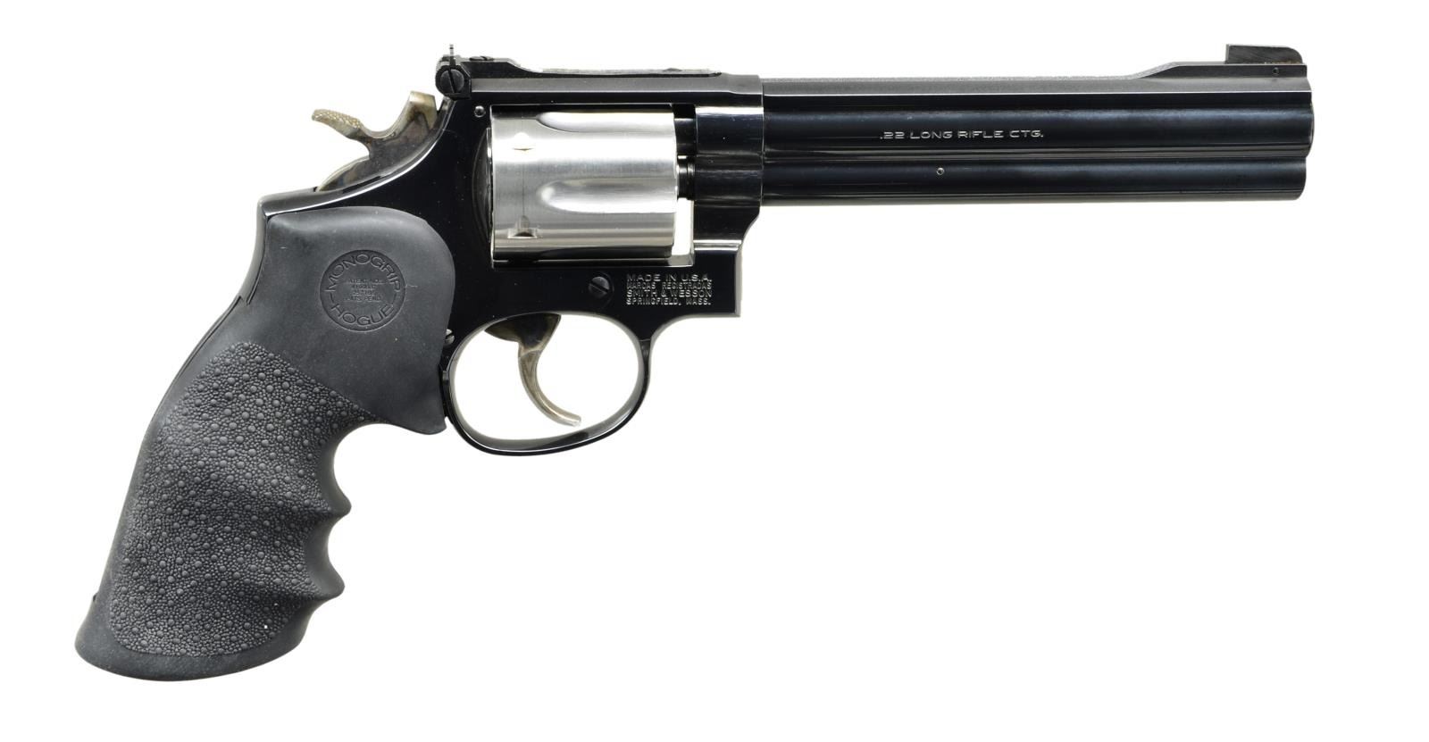 Cal. 22 LR. S# BRF3564. Bbl. 6" full lug w/ pinned Patridge blade front sight & corresponding blued Micrometer rear sight. 1 of 200 mfg. August, 1994 (shipped Aug. 18, 1994) for Lew Horton Dist. w/ all blued finish except for stainless cyl. & extractor; blued ejector rod. Most noticeable external features of this evolved 22 Masterpiece having -7 suffix are full lug bbl. (-6 started in 1990), new rounded front design of Micrometer rear sight plus top strap drilled & tapped for scope mount. Two toned variation called "Pinto" by collectors; not a S&W designation. Blued square butt frame having Hogue finger grooved pebble grained Monogrip. .375" checkered hammer spur & .312" smooth faced combat style trigger; both case colored. UNATTACHED ACCESSORIES: very good blue 1 piece hinged box having end label marked "SPECIAL" for features, "B" as finish, Bbl. of "6" & Spec. Ord. of "5983". Factory paperwork. Factory letter supporting above info. CONDITION: overall near excellent appearance w/ very faint cyl. turn line from functioning; appears unfired having near excellent bore & grips. PROVENANCE: Estate collection of Fred Inganamort. (22-1706/NW). MODERN. $1,200-1,800.