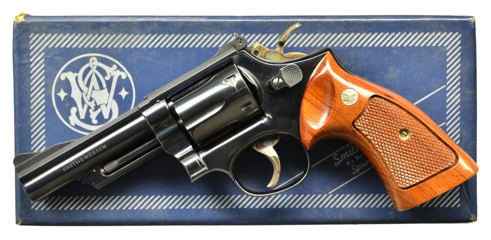 Cal. 357 Mag. S# K942468. Bbl. 4". Mfg 1969. Ramp blade front sight w/ adjustable black rear sight. 6 shot fluted cylinder. Serrated top barrel rib. Blued finish. Checkered hammer spur & cylinder release. Wide, serrated trigger. Serrated front & backstraps. Checkered target grips w/ S&W medallion. UNATTCHED ACCESSORIES: non matching blue factory box w/ steel corners. Original S&W cleaning kit & paperwork. CONDITION: finish is complete & consistent, enjoying full coverage. Thin drag line on cylinder. Grips in very nice condition w/ very little sign of use. Sharp checkering w/ well defined medallions. Timing appears correct. Bright bore w/ strong rifling. (22-5347/JZ). CURIO. $700-1,000.