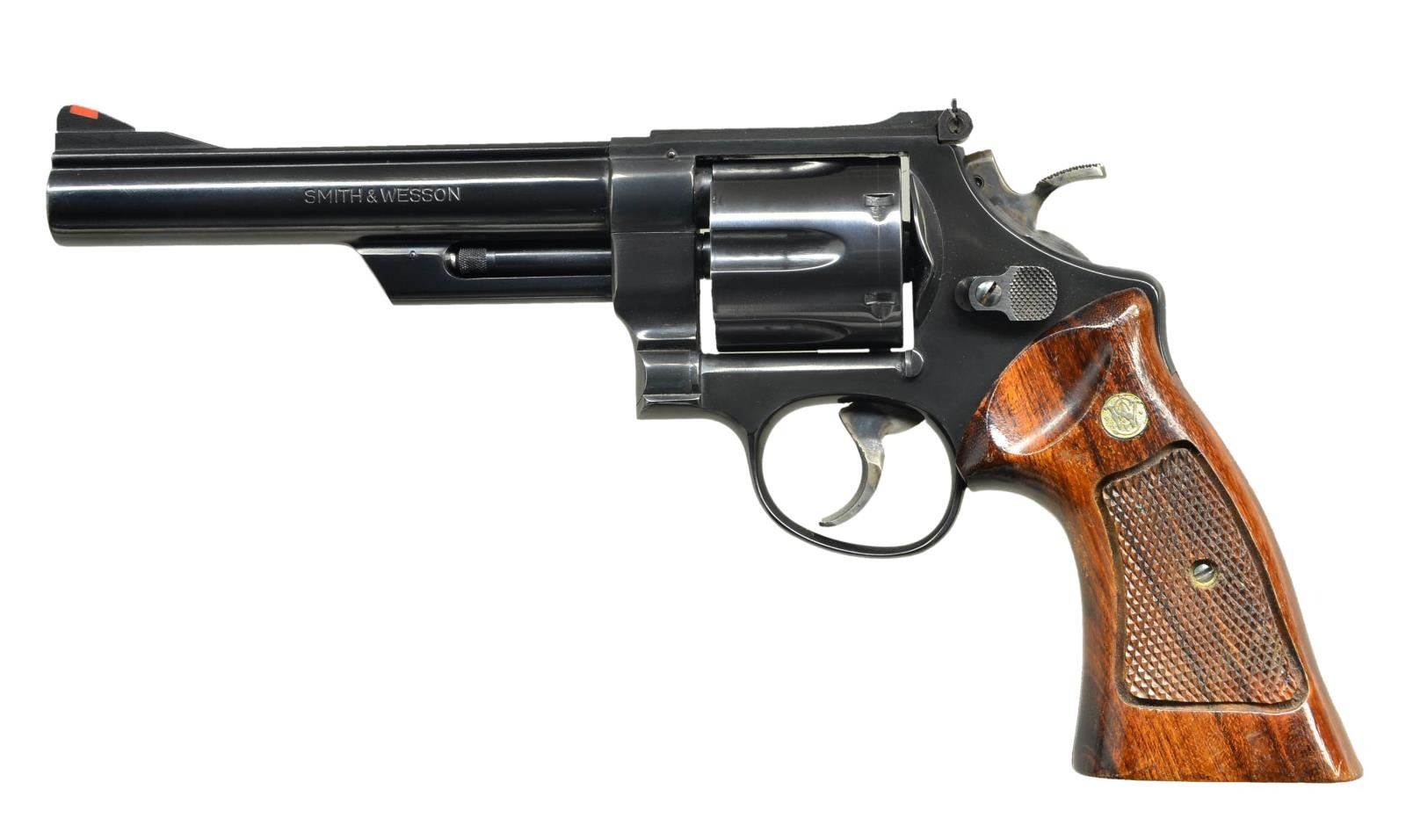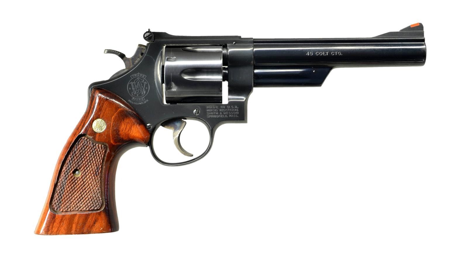 Cal.45 Colt. S# N764855. Bbl. 6". Mfg.1980. 4 screw, double action revolver built on the N frame. Bright blue finish. 6 shot, fluted cylinder. Ribbed & pinned barrel. Wide (.500") checkered target hammer & serrated target trigger of the same width. Shrouded ejector rod w/ knurled end. Ramp front sight w/ red insert & white outline micrometer click adjustable rear sight. 10 groove serrated forestrap & backstrap. Checkered grips w/ S&W medallion. Barrel marked "45 Colt Ctg." on right. UNATTACHED ACCESSORIES: 3 HKS speed loaders.. CONDITION: dark, rich bluing coverage is complete & consistent. Very thin drag line on cylinder. Timing appears correct. Grips are very nice retaining sharp checkering & bold medallions. Bright bore w/ strong rifling. (22-5988/JZ). MODERN. $1.000-1,500.